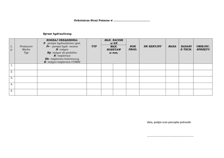 Ochotnicza Straż Pożarna w ………………………………….. Sprzęt hydrauliczny L p Producent Marka Typ RODZAJ URZĄDZENIA: P- pompa hydrauliczna spal. Pr – pompa hydr. ręczna N- nożyce Np- nożyce do pedałów R- rozpieracz Rk- rozpieracz kolumnowy K- nożyco-rozpieracz COMBI TYP MAX. NACISK w kN MAX. ROZSTAW w mm. ROK PROD. NR SERYJNY MASA BADANI E TECH. 1. 2. 3. 4. 5. data, podpis oraz pieczątka jednostki …………………………………………………………… UMIEJSC. SPRZĘTU