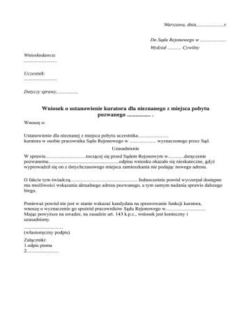 Warszawa, dnia......................r. Do Sądu Rejonowego w ..................... Wydział ........... Cywilny Wnioskodawca: .......................... Uczestnik: .......................... Dotyczy sprawy.................. Wniosek o ustanowienie kuratora dla nieznanego z miejsca pobytu pozwanego ................ . Wnoszę o: Ustanowienie dla nieznanej z miejsca pobytu uczestnika........................ kuratora w osobie pracownika Sądu Rejonowego w ..................... wyznaczonego przez Sąd. Uzasadnienie W sprawie................................toczącej się przed Sądem Rejonowym w.............doręczenie pozwanemu........................................................odpisu wniosku okazało się nieskuteczne, gdyż wyprowadził się on z dotychczasowego miejsca zamieszkania nie podając nowego adresu. O fakcie tym świadczą..................................................... Jednocześnie powód wyczerpał dostępne mu możliwości wskazania aktualnego adresu pozwanego, a tym samym nadania sprawie dalszego biegu. Ponieważ powód nie jest w stanie wskazać kandydata na sprawowanie funkcji kuratora, wnoszę o wyznaczenie go spośród pracowników Sądu Rejonowego w................................ Mając powyższe na uwadze, na zasadzie art. 143 k.p.c., wniosek jest konieczny i uzasadniony. ............................... (własnoręczny podpis) Załączniki: 1.odpis pisma 2.........................