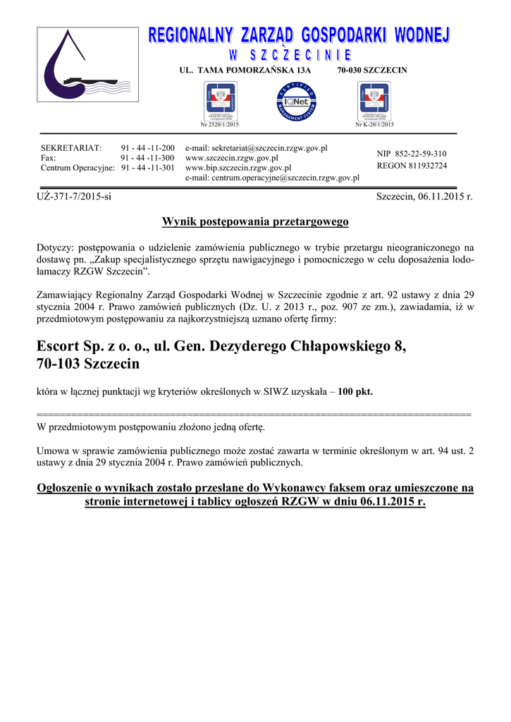 UL. TAMA POMORZAŃSKA 13A 70-030 SZCZECIN Nr 2520/1/2015 SEKRETARIAT: 91 - 44 -11-200 Fax: 91 - 44 -11-300 Centrum Operacyjne: 91 - 44 -11-301 Nr K-20/1/2015 e-mail: [email protected] www.szczecin.rzgw.gov.pl www.bip.szczecin.rzgw.gov.pl e-mail: [email protected] UŻ-371-7/2015-si NIP 852-22-59-310 REGON 811932724 Szczecin, 06.11.2015 r. Wynik postępowania przetargowego Dotyczy: postępowania o udzielenie zamówienia publicznego w trybie przetargu nieograniczonego na dostawę pn. „Zakup specjalistycznego sprzętu nawigacyjnego i pomocniczego w celu doposażenia lodołamaczy RZGW Szczecin”. Zamawiający Regionalny Zarząd Gospodarki Wodnej w Szczecinie zgodnie z art. 92 ustawy z dnia 29 stycznia 2004 r. Prawo zamówień publicznych (Dz. U. z 2013 r., poz. 907 ze zm.), zawiadamia, iż w przedmiotowym postępowaniu za najkorzystniejszą uznano ofertę firmy: Escort Sp. z o. o., ul. Gen. Dezyderego Chłapowskiego 8, 70-103 Szczecin która w łącznej punktacji wg kryteriów określonych w SIWZ uzyskała – 100 pkt. =========================================================================== W przedmiotowym postępowaniu złożono jedną ofertę. Umowa w sprawie zamówienia publicznego może zostać zawarta w terminie określonym w art. 94 ust. 2 ustawy z dnia 29 stycznia 2004 r. Prawo zamówień publicznych. Ogłoszenie o wynikach zostało przesłane do Wykonawcy faksem oraz umieszczone na stronie internetowej i tablicy ogłoszeń RZGW w dniu 06.11.2015 r.