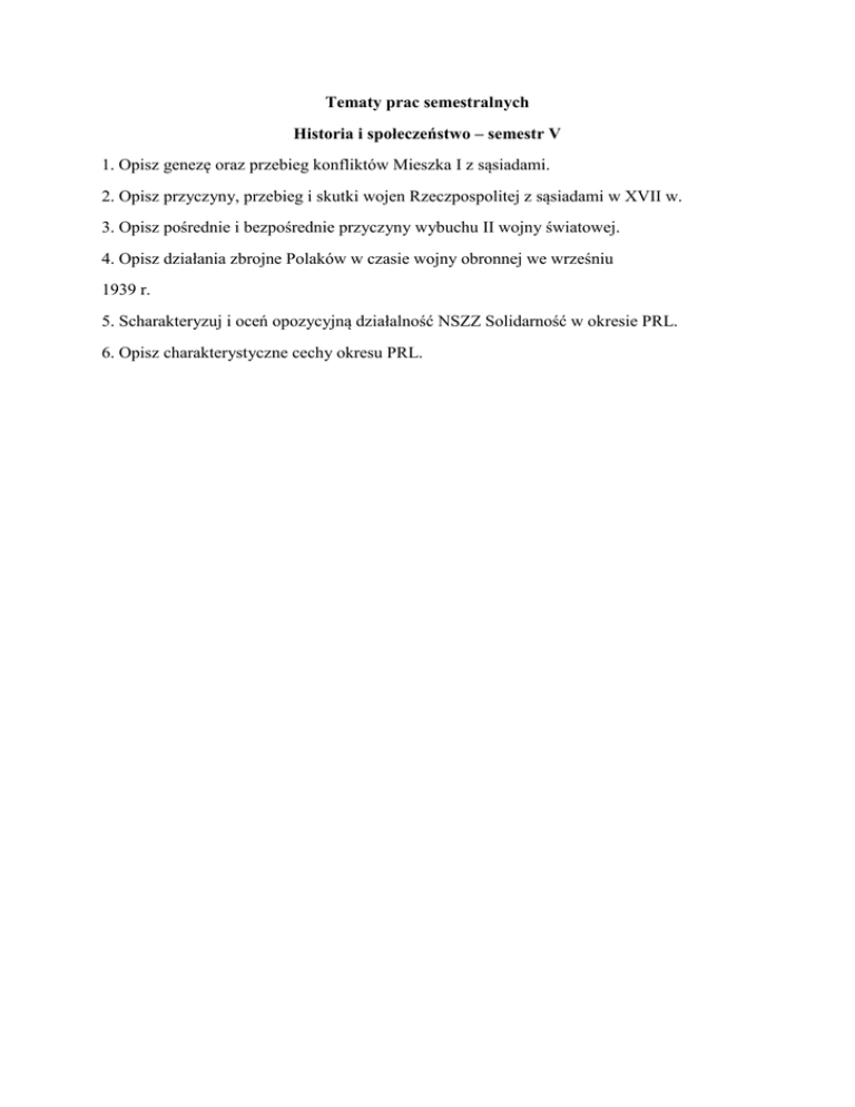 Tematy prac semestralnych Historia i społeczeństwo – semestr V 1. Opisz genezę oraz przebieg konfliktów Mieszka I z sąsiadami. 2. Opisz przyczyny, przebieg i skutki wojen Rzeczpospolitej z sąsiadami w XVII w. 3. Opisz pośrednie i bezpośrednie przyczyny wybuchu II wojny światowej. 4. Opisz działania zbrojne Polaków w czasie wojny obronnej we wrześniu 1939 r. 5. Scharakteryzuj i oceń opozycyjną działalność NSZZ Solidarność w okresie PRL. 6. Opisz charakterystyczne cechy okresu PRL.