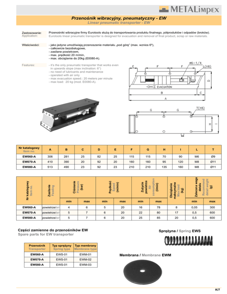 Przenośnik wibracyjny, pneumatyczny - EW Linear pneumatic transporter - EW Zastosowanie: Application: Przenośniki wibracyjne firmy Eurotools służą do transportowania produktu finalnego, półproduktów i odpadów (broków). Eurotools linear pneumatic transporter is designed for evacuation and removal of final product, scrap or raw materials. Właściwości: - jako jedyne umożliwiają przenoszenie materiału „pod górę” (max. wznios 6º), - całkowicie bezobsługowe, - zasilane powietrzem, - max. prędkość 20 m/min, - max. obciążenie do 20kg (E0080-A). Features: - it’s the only pneumatic transporter that works even in upwards slope (max inclination: 6°) - no need of lubricants and maintenance - operated with air only - max evacuation speed.: 20 meters per minute - max load: 20 kg (mod. E0080-A). B C D E F G H I L T EW060-A 306 281 25 82 25 115 115 70 90 M6 Ø9 EW070-A 410 390 20 92 20 160 160 95 120 M8 Ø11 EW080-A 513 490 23 92 23 210 210 135 160 M8 Ø11 Prędkość Speed (m/min) EW060-A powietrze/air 4 6 5 20 16 78 8 0,05 300 EW070-A powietrze/air 5 7 6 20 22 80 17 0,5 600 EW080-A powietrze/air 5 7 6 20 25 85 20 0,5 600 min max min max min max Części zamienne do przenośników EW Spare parts for EW transporter Przenośnik Transporter Obciążenie maksymalne Max load (kg) Zasilanie Feeding Ciśnienie Pressure (bar) Nr katalogowy Item no. Zalecana waga detalu Recommend detail weight (g) A Zużycie powietrza Air consumption (l/min) Nr katalogowy Item no. min max Sprężyna / Spring EWS Typ sprężyny Typ membrany Spring type Membrane type EW060-A EWS-01 EWM-01 EW070-A EWS-01 EWM-02 EW080-A EWS-01 EWM-03 Membrana / Membrane EWM K/7