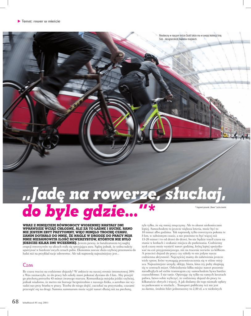 Temat: rower w mieście Nieobecny w naszym teście Scott także ma w swojej kolekcji linię Sub - designerskich rowerów miejskich. „Jadę na rowerze, słuchaj, do byle gdzie...”* * fragment piosenki „Rower” Lecha Janerki WRAZ Z MINIĘCIEM RÓWNONOCY WIOSENNEJ NASTAŁY DNI WPRAWDZIE WCIĄŻ CHŁODNE, ALE ZA TO ŁADNE I SUCHE. RANO NIE JESTEM ZBYT PRZYTOMNY, WIĘC MINĘŁO TROCHĘ CZASU, ZANIM DOTARŁO DO MNIE, ŻE NAGLE W DRODZE DO PRACY MIJA MNIE NIESAMOWITA ILOŚĆ ROWERZYSTÓW, KTÓRYCH NIE BYŁO JESZCZE KILKA DNI WCZEŚNIEJ. Jestem pewny, że katalizatorem tej nagłej erupcji rowerzystów na ulicach stała się sprzyjająca aura. Sądzę jednak, że sedna należy upatrywać w hardcore’owych cenach paliw. Ekonomia zawsze dużo szybciej przemawia do ludzi niż na przykład racje zdrowotne. Ale tak naprawdę najważniejszy jest... Czas Ile czasu tracisz na codzienne dojazdy? W ankiecie na naszej stronie internetowej 30% z Was zaznaczyło, że do pracy lub szkoły musi pokonać dystans do 5 km. Aby przejść go piechotą potrzeba 45 minut żwawego marszu. Komunikacja miejska jeździ szybciej, jednak wiadomo, że metro nie kursuje bezpośrednio z naszego łóżka, a autobus nie wysadzi nas przy biurku w pracy. Trzeba do niego dojść, zaczekać na przystanku, czasami przesiąść się na drugi. Summa summarum może wyjść nawet dłużej niż na piechotę, 68 bikeBoar d #5 maj 2011 tyle tylko, że się mniej zmęczymy. Ale to akurat niekoniecznie lepiej. Samochodem to jeszcze większa loteria, może być to 10 minut albo godzina. Tak naprawdę tylko rowerzysta pokona te 5 km, w założonym czasie, a nie powinno to być więcej niż 15-20 minut i to od drzwi do drzwi, bo nie będzie tracił czasu na stanie w korkach i szukanie miejsca do parkowania. Codzienny zysk czasu może wynieść nawet godzinę, którą lepiej spożytkować na coś przyjemniejszego, niż na tracenie nerwów za kółkiem. A przecież dojazd do pracy czy szkoły to nie jedyne nasza codzienna aktywność. Najczęściej mamy do załatwienia jeszcze wiele spraw, które wymagają przemieszczenia się w różne miejsca. Najważniejsze urzędy, sklepy, biura, kina czy puby skupiają się w centrach miast. Odwiedzenie kilku miejsc nawet pozornie nieodległych od siebie tramwajem czy samochodem bywa bardzo czasochłonne. I nie tanie. Opierając się tylko na samych kosztach paliwa, łatwo sobie wyliczyć, że codzienny dojazd do pracy to kilkanaście złotych i więcej. A jak dodamy do tego niemałe opłaty za parkowanie w strefach... Transport publiczny też nie jest za darmo, średnio bilet jednorazowy to 2,50 zł, a w niektórych