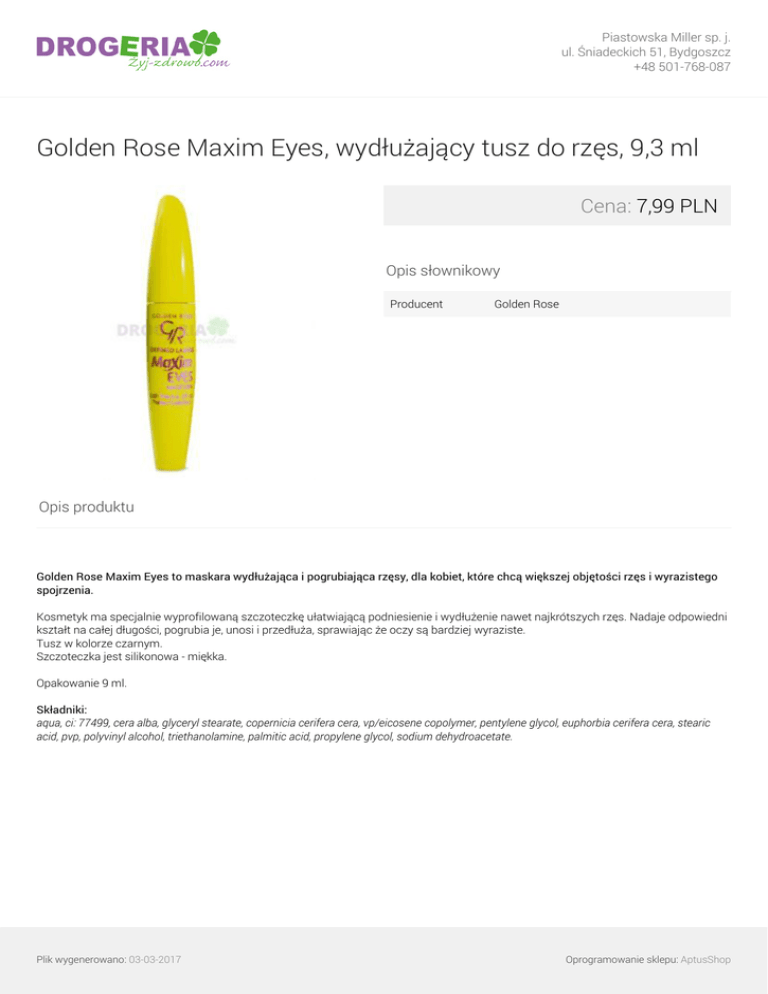 Piastowska Miller sp. j. ul. Śniadeckich 51, Bydgoszcz +48 501-768-087 Golden Rose Maxim Eyes, wydłużający tusz do rzęs, 9,3 ml Cena: 7,99 PLN Opis słownikowy Producent Golden Rose Opis produktu Golden Rose Maxim Eyes to maskara wydłużająca i pogrubiająca rzęsy, dla kobiet, które chcą większej objętości rzęs i wyrazistego spojrzenia. Kosmetyk ma specjalnie wyprofilowaną szczoteczkę ułatwiającą podniesienie i wydłużenie nawet najkrótszych rzęs. Nadaje odpowiedni kształt na całej długości, pogrubia je, unosi i przedłuża, sprawiając że oczy są bardziej wyraziste. Tusz w kolorze czarnym. Szczoteczka jest silikonowa - miękka. Opakowanie 9 ml. Składniki: aqua, ci: 77499, cera alba, glyceryl stearate, copernicia cerifera cera, vp/eicosene copolymer, pentylene glycol, euphorbia cerifera cera, stearic acid, pvp, polyvinyl alcohol, triethanolamine, palmitic acid, propylene glycol, sodium dehydroacetate. Plik wygenerowano: 03-03-2017 Oprogramowanie sklepu: AptusShop Piastowska Miller sp. j. ul. Śniadeckich 51, Bydgoszcz +48 501-768-087 Galeria Plik wygenerowano: 03-03-2017 Powered by TCPDF (www.tcpdf.org) Oprogramowanie sklepu: AptusShop