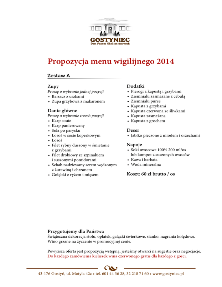 Propozycja menu wigilijnego 2014 Zestaw A Zupy Proszę o wybranie jednej pozycji • Barszcz z uszkami • Zupa grzybowa z makaronem Danie główne Proszę o wybranie trzech pozycji • Karp soute • Karp panierowany • Sola po parysku • Łosoś w sosie koperkowym • Łosoś • Filet rybny duszony w śmietanie z grzybami. • Filet drobiowy ze szpinakiem i suszonymi pomidorami • Schab nadziewany serem wędzonym z żurawiną i chrzanem • Gołąbki z ryżem i mięsem Dodatki • Pierogi z kapustą i grzybami • Ziemniaki zasmażane z cebulą • Ziemniaki puree • Kapusta z grzybami • Kapusta czerwona ze śliwkami • Kapusta zasmażana • Kapusta z grochem Deser • Jabłko pieczone z miodem i orzechami Napoje • Soki owocowe 100% 200 ml/os lub kompot z suszonych owoców • Kawa i herbata • Woda mineralna Koszt: 60 zł brutto / os Przygotujemy dla Państwa Świąteczna dekoracja stołu, opłatek, gałązki świerkowe, sianko, nagrania kolędowe. Wino grzane na życzenie w promocyjnej cenie. Powyższa oferta jest propozycją wstępną, jesteśmy otwarci na sugestie oraz negocjacje. Do każdego zamówienia kieliszek wina czerwonego gratis dla każdego z gości. 43-176 Gostyń, ul. Motyla 42c • tel. 601 44 36 28, 32 218 71 60 • www.gostyniec.pl Propozycja menu wigilijnego 2014 Zestaw B Zupy Proszę o wybranie jednej pozycji • Barszcz z uszkami • Zupa grzybowa z makaronem Danie główne Proszę o wybranie trzech pozycji • Karp soute lub panierowany • Sola po parysku • Łosoś w sosie koperkowym • Łosoś • Filet rybny duszony w śmietanie z grzybami. • Filet drobiowy ze szpinakiem i suszonymi pomidorami • Schab nadziewany serem wędzonym z żurawiną i chrzanem • Gołąbki z ryżem i mięsem Dodatki • Pierogi z kapustą i grzybami • Ziemniaki zasmażane z cebulą • Ziemniaki puree • Kapusta z grzybami • Kapusta czerwona ze śliwkami • Kapusta zasmażana • Kapusta z grochem Deser Proszę o wybranie jednej pozycji • Jabłko pieczone z miodem i orzechami oraz makówki • Piernik z bakaliami oraz makówki • Jabłecznik na ciepło oraz gałka lodów z bitą śmietaną i makówki Zimna płyta • Ryba po grecku (na zimno lub na ciepło) • Kulki z sandacza w zalewie winnej • Roladki z szynki konserwowej ze szparagami • Śledzie Grażynki • Śledzie w oleju • Śledzie pod pierzynką • Pieczywo Napoje • Soki owocowe 100% 200 ml/os lub kompot z suszonych owoców • Kawa i herbata • Woda mineralna Koszt: 71 zł brutto / os Przygotujemy dla Państwa Świąteczna dekoracja stołu, opłatek, gałązki świerkowe, sianko, nagrania kolędowe. Wino grzane na życzenie w promocyjnej cenie. Powyższa oferta jest propozycją wstępną, jesteśmy otwarci na sugestie oraz negocjacje. Do każdego zamówienia kieliszek wina czerwonego gratis dla każdego z gości. 43-176 Gostyń, ul. Motyla 42c • tel. 601 44 36 28, 32 218 71 60 • www.gostyniec.pl Propozycja menu wigilijnego 2014 Zestaw C Zupy Proszę o wybranie jednej pozycji • Barszcz z uszkami • Zupa grzybowa z makaronem Danie główne Proszę o wybranie trzech pozycji • Karp soute lub panierowany • Sola po parysku • Łosoś w sosie koperkowym • Łosoś • Filet rybny duszony w śmietanie z grzybami • Filet drobiowy ze szpinakiem i suszonymi pomidorami • Schab nadziewany serem wędzonym z żurawiną i chrzanem • Gołąbki z ryżem i mięsem Dodatki • Pierogi z kapustą i grzybami • Ziemniaki puree • Kapusta z grzybami • Kapusta czerwona ze śliwkami Deser Proszę o wybranie jednej pozycji • Jabłko pieczone z miodem i orzechami oraz makówki • Piernik z bakaliami oraz makówki • Jabłecznik na ciepło oraz gałka lodów z bitą śmietaną i makówki Zimna płyta • Ryba po grecku (na zimno lub na ciepło) • Deska serów żółtych i pleśniowych • Żabie udka z sosem tzatziki • Śledzie po japońsku • Śledzie Grażynki • Jaja faszerowane • Szynka nadziewana puchem chrzanowym • Karczek pieczony w ziołach • Schab ze śliwką kalifornijską • Kulki rybne Napoje • Soki owocowe 100% 200 ml/os lub kompot z suszonych owoców • Kawa i herbata • Woda mineralna Koszt: 102 zł brutto / os Przygotujemy dla Państwa Świąteczna dekoracja stołu, opłatek, gałązki świerkowe, sianko, nagrania kolędowe. Wino grzane na życzenie w promocyjnej cenie. Powyższa oferta jest propozycją wstępną, jesteśmy otwarci na sugestie oraz negocjacje. Do każdego zamówienia kieliszek wina czerwonego gratis dla każdego z gości. 43-176 Gostyń, ul. Motyla 42c • tel. 601 44 36 28, 32 218 71 60 • www.gostyniec.pl