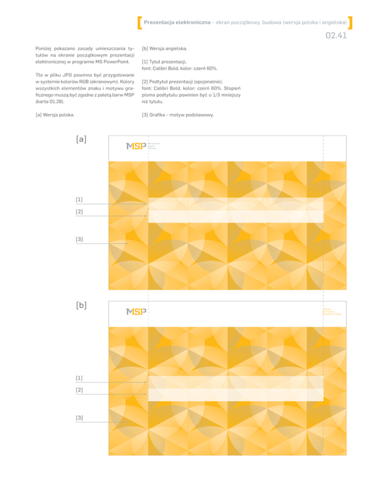Prezentacja elektroniczna – ekran początkowy, budowa (wersja polska i angielska) 02.41 Poniżej pokazano zasady umieszczania tytułów na ekranie początkowym prezentacji elektronicznej w programie MS PowerPoint. [b] Wersja angielska. [1] Tytuł prezentacji, font: Calibri Bold, kolor: czerń 60%. Tło w pliku JPG powinno być przygotowane w systemie kolorów RGB (ekranowym). Kolory wszystkich elementów znaku i motywu graficznego muszą być zgodne z paletą barw MSP (karta 01.28). [2] Podtytuł prezentacji (opcjonalnie), font: Calibri Bold, kolor: czerń 60%. Stopień pisma podtytułu powinien być o 1/3 mniejszy niż tytułu. [a] Wersja polska. [3] Grafika – motyw podstawowy. [a] Ministerstwo Skarbu Państwa [1] [2] [3] [b] [1] [2] [3] Ministry of Treasury Republic of Poland Prezentacja elektroniczna – slajd, budowa (wersja polska i angielska) 02.42 Poniżej pokazano rozmieszczenie tekstów na slajdzie prezentacji elektronicznej w programie MS PowerPoint. w tekście powinny być pisane fontem Calibri Bold, kolor: żółty. wszystkich elementów znaku i motywu graficznego muszą być zgodne z paletą barw MSP (karta 01.28). [2] Okno edycji. Wszystkie teksty powinny być pisane fontem Calibri. [a] Wersja polska. [b] Wersja angielska. [3] Grafika – motyw uzupełniający. [1} Tytuł prezentacji. Wszystkie główne teksty powinny być pisane fontem Calibri, kolor: czerń 60%. Wyróżniki [a] Tło w pliku JPG powinno być przygotowane w systemie kolorów RGB (ekranowym). Kolory Ministerstwo Skarbu Państwa Lorem ipsum dolor sit amet. Consectetur adipisicing elit. [1] Lorem ipsum dolor sit amet. Consectetur adipisicing elit. [1] [2] [3] www.msp.gov.pl [b] Ministerstwo Skarbu Państwa [2] [3] www.msp.gov.pl Ministry of Treasury Republic of Poland