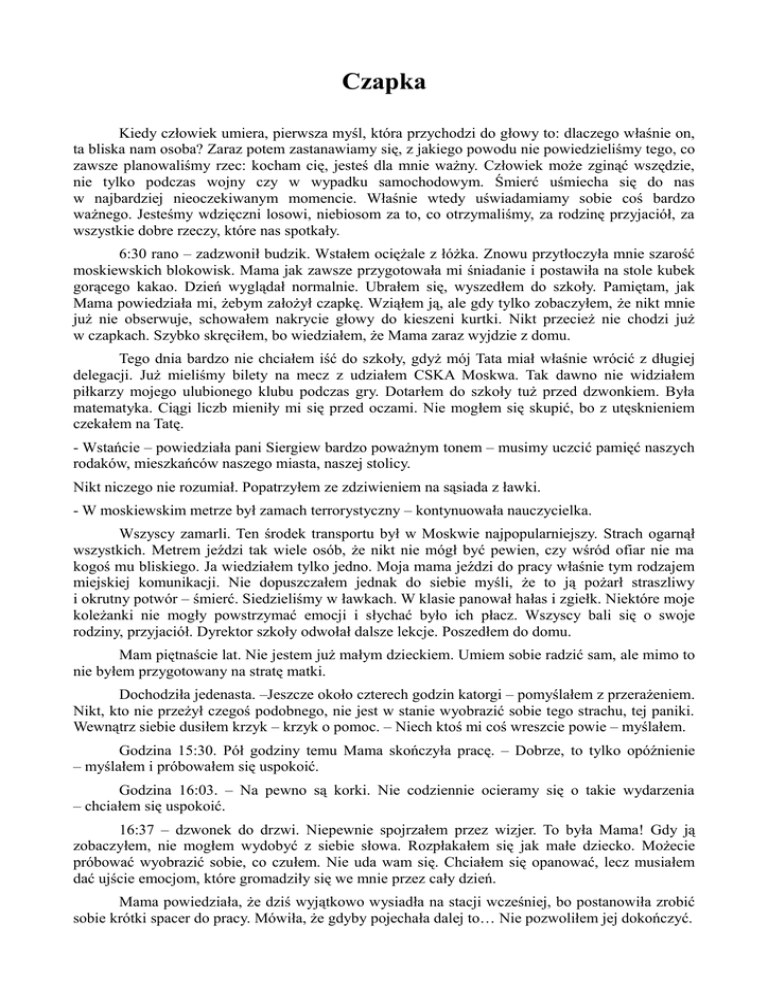 Czapka Kiedy człowiek umiera, pierwsza myśl, która przychodzi do głowy to: dlaczego właśnie on, ta bliska nam osoba? Zaraz potem zastanawiamy się, z jakiego powodu nie powiedzieliśmy tego, co zawsze planowaliśmy rzec: kocham cię, jesteś dla mnie ważny. Człowiek może zginąć wszędzie, nie tylko podczas wojny czy w wypadku samochodowym. Śmierć uśmiecha się do nas w najbardziej nieoczekiwanym momencie. Właśnie wtedy uświadamiamy sobie coś bardzo ważnego. Jesteśmy wdzięczni losowi, niebiosom za to, co otrzymaliśmy, za rodzinę przyjaciół, za wszystkie dobre rzeczy, które nas spotkały. 6:30 rano – zadzwonił budzik. Wstałem ociężale z łóżka. Znowu przytłoczyła mnie szarość moskiewskich blokowisk. Mama jak zawsze przygotowała mi śniadanie i postawiła na stole kubek gorącego kakao. Dzień wyglądał normalnie. Ubrałem się, wyszedłem do szkoły. Pamiętam, jak Mama powiedziała mi, żebym założył czapkę. Wziąłem ją, ale gdy tylko zobaczyłem, że nikt mnie już nie obserwuje, schowałem nakrycie głowy do kieszeni kurtki. Nikt przecież nie chodzi już w czapkach. Szybko skręciłem, bo wiedziałem, że Mama zaraz wyjdzie z domu. Tego dnia bardzo nie chciałem iść do szkoły, gdyż mój Tata miał właśnie wrócić z długiej delegacji. Już mieliśmy bilety na mecz z udziałem CSKA Moskwa. Tak dawno nie widziałem piłkarzy mojego ulubionego klubu podczas gry. Dotarłem do szkoły tuż przed dzwonkiem. Była matematyka. Ciągi liczb mieniły mi się przed oczami. Nie mogłem się skupić, bo z utęsknieniem czekałem na Tatę. - Wstańcie – powiedziała pani Siergiew bardzo poważnym tonem – musimy uczcić pamięć naszych rodaków, mieszkańców naszego miasta, naszej stolicy. Nikt niczego nie rozumiał. Popatrzyłem ze zdziwieniem na sąsiada z ławki. - W moskiewskim metrze był zamach terrorystyczny – kontynuowała nauczycielka. Wszyscy zamarli. Ten środek transportu był w Moskwie najpopularniejszy. Strach ogarnął wszystkich. Metrem jeździ tak wiele osób, że nikt nie mógł być pewien, czy wśród ofiar nie ma kogoś mu bliskiego. Ja wiedziałem tylko jedno. Moja mama jeździ do pracy właśnie tym rodzajem miejskiej komunikacji. Nie dopuszczałem jednak do siebie myśli, że to ją pożarł straszliwy i okrutny potwór – śmierć. Siedzieliśmy w ławkach. W klasie panował hałas i zgiełk. Niektóre moje koleżanki nie mogły powstrzymać emocji i słychać było ich płacz. Wszyscy bali się o swoje rodziny, przyjaciół. Dyrektor szkoły odwołał dalsze lekcje. Poszedłem do domu. Mam piętnaście lat. Nie jestem już małym dzieckiem. Umiem sobie radzić sam, ale mimo to nie byłem przygotowany na stratę matki. Dochodziła jedenasta. –Jeszcze około czterech godzin katorgi – pomyślałem z przerażeniem. Nikt, kto nie przeżył czegoś podobnego, nie jest w stanie wyobrazić sobie tego strachu, tej paniki. Wewnątrz siebie dusiłem krzyk – krzyk o pomoc. – Niech ktoś mi coś wreszcie powie – myślałem. Godzina 15:30. Pół godziny temu Mama skończyła pracę. – Dobrze, to tylko opóźnienie – myślałem i próbowałem się uspokoić. Godzina 16:03. – Na pewno są korki. Nie codziennie ocieramy się o takie wydarzenia – chciałem się uspokoić. 16:37 – dzwonek do drzwi. Niepewnie spojrzałem przez wizjer. To była Mama! Gdy ją zobaczyłem, nie mogłem wydobyć z siebie słowa. Rozpłakałem się jak małe dziecko. Możecie próbować wyobrazić sobie, co czułem. Nie uda wam się. Chciałem się opanować, lecz musiałem dać ujście emocjom, które gromadziły się we mnie przez cały dzień. Mama powiedziała, że dziś wyjątkowo wysiadła na stacji wcześniej, bo postanowiła zrobić sobie krótki spacer do pracy. Mówiła, że gdyby pojechała dalej to… Nie pozwoliłem jej dokończyć. Nie chcę nawet myśleć, co by było, jeśli straciłbym Matkę. Przypomniałem o tym, jak prosiła mnie o założenie czapki. Nie posłuchałem. Uświadomiłem sobie, że kiedy wysiadłaby na odpowiedniej stacji, byłoby to moje ostatnie wspomnienie, pamięć o tym, że jej nie posłuchałem, ale także o zapachu kakao, które mi przygotowała. To zdarzenie spowodowało, że inaczej spojrzałem na życie. Nikt nie zastanawia się nad znaczeniem codzienności, małych, prozaicznych rzeczy. Ja już to robię. Często myślę, jakie wspomnienia zostawiłbym po sobie w tym momencie, jak ostatni raz pożegnałbym się z bliską mi osobą. Chciałbym założyć ciepłą, wełnianą czapkę, która ochroni mnie przed złem. Pragnę ustrzec się przed bólem i strachem, przed zagrożeniami otaczającego świata. Nie chcę nawet myśleć o zdjęciu tego nakrycia głowy, kiedy będę skręcać za róg mojego domu. Anna Błażuk