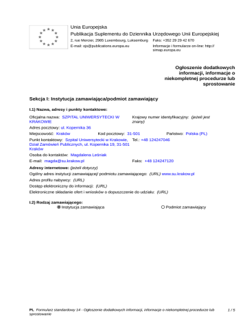 Unia Europejska Publikacja Suplementu do Dziennika Urzędowego Unii Europejskiej 2, rue Mercier, 2985 Luxembourg, Luksemburg Faks: +352 29 29 42 670 E-mail: [email protected] Informacje i formularze on-line: http:// simap.europa.eu Ogłoszenie dodatkowych informacji, informacje o niekompletnej procedurze lub sprostowanie Sekcja I: Instytucja zamawiająca/podmiot zamawiający I.1) Nazwa, adresy i punkty kontaktowe: Oficjalna nazwa: SZPITAL UNIWERSYTECKI W KRAKOWIE Krajowy numer identyfikacyjny: (jeżeli jest znany) _____ Adres pocztowy: ul. Kopernika 36 Miejscowość: Kraków Kod pocztowy: 31-501 Państwo: Polska (PL) Punkt kontaktowy: Szpital Uniwersytecki w Krakowie, Tel.: +48 124247046 Dział Zamówień Publicznych, ul. Kopernika 19, 31-501 Kraków Osoba do kontaktów: Magdalena Leśniak E-mail: [email protected] Faks: +48 124247120 Adresy internetowe: (jeżeli dotyczy) Ogólny adres instytucji zamawiającej/ podmiotu zamawiającego: (URL) www.su.krakow.pl Adres profilu nabywcy: (URL) _____ Dostęp elektroniczny do informacji: (URL) _____ Elektroniczne składanie ofert i wniosków o dopuszczenie do udziału: (URL) _____ I.2) Rodzaj zamawiającego: Instytucja zamawiająca Podmiot zamawiający PL Formularz standardowy 14 - Ogłoszenie dodatkowych informacji, informacje o niekompletnej procedurze lub sprostowanie 1/5 Sekcja II: Przedmiot zamówienia II.1.1) Nazwa nadana zamówieniu: Dostawa, montaż i uruchomienie aparatury endoskopowej II.1.2) Krótki opis zamówienia lub zakupu: (podano w pierwotnym ogłoszeniu) Przedmiotem zamówienia jest dostawa, montaż i uruchomienie aparatury endoskopowej. Zamówienie składa się z 3 części. II.1.3) Wspólny Słownik Zamówień (CPV) Główny przedmiot Słownik główny 33168100 Słownik uzupełniający (jeżeli dotyczy) PL Formularz standardowy 14 - Ogłoszenie dodatkowych informacji, informacje o niekompletnej procedurze lub sprostowanie 2/5 Sekcja IV: Procedura IV.1)Rodzaj procedury (podano w pierwotnym ogłoszeniu) Otwarta Ograniczona Ograniczona przyspieszona Negocjacyjna Negocjacyjna przyspieszona Dialog konkurencyjny Negocjacyjna z uprzednim ogłoszeniem Negocjacyjna bez uprzedniego ogłoszenia Negocjacyjna z publikacją ogłoszenia o zamówieniu Negocjacyjna bez publikacji ogłoszenia o zamówieniu Udzielenie zamówienia bez uprzedniej publikacji ogłoszenia o zamówieniu w Dzienniku Urzędowym Unii Europejskiej IV.2)Informacje administracyjne IV.2.1)Numer referencyjny: (podano w pierwotnym ogłoszeniu) DZP-ML-271-50/2015 IV.2.2)Dane referencyjne ogłoszenia w przypadku ogłoszeń przesłanych drogą elektroniczną: Pierwotne ogłoszenie przesłane przez eNotices TED eSender Login: ENOTICES_JMY53 Dane referencyjne ogłoszenia: 2015-045304 rok i numer dokumentu IV.2.3)Ogłoszenie, którego dotyczy niniejsza publikacja: Numer ogłoszenia w Dz.U.: 2015/S 068-121717 z dnia: 08/04/2015 (dd/mm/rrrr) IV.2.4)Data wysłania pierwotnego ogłoszenia: 03/04/2015 (dd/mm/rrrr) PL Formularz standardowy 14 - Ogłoszenie dodatkowych informacji, informacje o niekompletnej procedurze lub sprostowanie 3/5 Sekcja VI: Informacje uzupełniające VI.1) Ogłoszenie dotyczy: Procedury niepełnej Sprostowania Informacji dodatkowych VI.2) Informacje na temat niepełnej procedury udzielenia zamówienia: Postępowanie o udzielenie zamówienia zostało przerwane Postępowanie o udzielenie zamówienia uznano za nieskuteczne Zamówienia nie udzielono Zamówienie może być przedmiotem ponownej publikacji VI.3) Informacje do poprawienia lub dodania : VI.3.1) Zmiana oryginalnej informacji podanej przez instytucję zamawiającą Publikacja w witrynie TED niezgodna z oryginalną informacją, przekazaną przez instytucję zamawiającą Oba przypadki VI.3.2) W ogłoszeniu pierwotnym W odpowiedniej dokumentacji przetargowej (więcej informacji w odpowiedniej dokumentacji przetargowej) W obu przypadkach (więcej informacji w odpowiedniej dokumentacji przetargowej) VI.3.3) Tekst, który należy poprawić w pierwotnym ogłoszeniu Miejsce, w którym znajduje się Zamiast: Powinno być: zmieniany tekst: 2. Oferowany w części 1 sprzęt 2. Oferowany w części 1 sprzęt III.1.4) Inne szczególne warunki musi być fabrycznie nowy, za który musi być fabrycznie nowy(za który Zamawiający uznaje również sprzęt Zamawiający uznaje również sprzęt po demonstracyjny, prezentowany po demonstracyjny, prezentowany na targach, konferencjach, nie na targach, konferencjach, rok używany do leczenia pacjentów produkcji dla głównego elementu (rok produkcji nie wcześniej niż - centrali USG nie wcześniej niż 2013), kompletny, do którego 2013), kompletny, do którego uruchomienia i stosowania uruchomienia i stosowania zgodnie zgodnie z przeznaczeniem nie z przeznaczeniem nie będzie będziekonieczny zakup dodatkowych konieczny zakup dodatkowych elementów i akcesoriów. elementów i akcesoriów. Oferowany w części 2 sprzęt musi Oferowany w części 2 sprzęt musi być fabrycznie nowy (rok produkcji być fabrycznie nowy (rok produkcji 2015), nieużywany, kompletny, do 2014), nieużywany, kompletny, do któregouruchomienia i stosowania którego uruchomienia i stosowania zgodnie z przeznaczeniem zgodnie z przeznaczeniem nie będzie konieczny zakup nie będzie konieczny zakup dodatkowych elementów dodatkowych elementów i iakcesoriów. akcesoriów. Oferowany w części 3 sprzęt musi Oferowany w części 3 sprzęt musi być fabrycznie nowy (rok produkcji być fabrycznie nowy (rok produkcji 2015), nieużywany, kompletny, do 2014), nieużywany, kompletny, do któregouruchomienia i stosowania którego uruchomienia i stosowania zgodnie z przeznaczeniem zgodnie z przeznaczeniem nie będzie konieczny zakup nie będzie konieczny zakup PL Formularz standardowy 14 - Ogłoszenie dodatkowych informacji, informacje o niekompletnej procedurze lub sprostowanie 4/5 Miejsce, w którym znajduje się zmieniany tekst: VI.3) Informacje dodatkowe dodatkowych elementów i akcesoriów. Zamiast: dodatkowyc