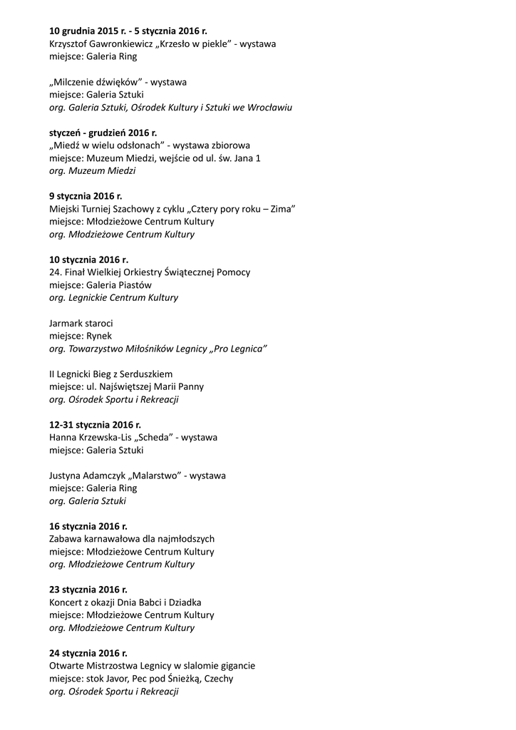10 grudnia 2015 r. - 5 stycznia 2016 r. Krzysztof Gawronkiewicz „Krzesło w piekle” - wystawa miejsce: Galeria Ring „Milczenie dźwięków” - wystawa miejsce: Galeria Sztuki org. Galeria Sztuki, Ośrodek Kultury i Sztuki we Wrocławiu styczeń - grudzień 2016 r. „Miedź w wielu odsłonach” - wystawa zbiorowa miejsce: Muzeum Miedzi, wejście od ul. św. Jana 1 org. Muzeum Miedzi 9 stycznia 2016 r. Miejski Turniej Szachowy z cyklu „Cztery pory roku – Zima” miejsce: Młodzieżowe Centrum Kultury org. Młodzieżowe Centrum Kultury 10 stycznia 2016 r. 24. Finał Wielkiej Orkiestry Świątecznej Pomocy miejsce: Galeria Piastów org. Legnickie Centrum Kultury Jarmark staroci miejsce: Rynek org. Towarzystwo Miłośników Legnicy „Pro Legnica” II Legnicki Bieg z Serduszkiem miejsce: ul. Najświętszej Marii Panny org. Ośrodek Sportu i Rekreacji 12-31 stycznia 2016 r. Hanna Krzewska-Lis „Scheda” - wystawa miejsce: Galeria Sztuki Justyna Adamczyk „Malarstwo” - wystawa miejsce: Galeria Ring org. Galeria Sztuki 16 stycznia 2016 r. Zabawa karnawałowa dla najmłodszych miejsce: Młodzieżowe Centrum Kultury org. Młodzieżowe Centrum Kultury 23 stycznia 2016 r. Koncert z okazji Dnia Babci i Dziadka miejsce: Młodzieżowe Centrum Kultury org. Młodzieżowe Centrum Kultury 24 stycznia 2016 r. Otwarte Mistrzostwa Legnicy w slalomie gigancie miejsce: stok Javor, Pec pod Śnieżką, Czechy org. Ośrodek Sportu i Rekreacji 26 stycznia 2016 r. „Muzyczny wtorek” - koncert miejsce: Muzeum Miedzi org. Zespół Szkół Muzycznych w Legnicy luty - maj 2016 r. Henryk Sienkiewicz (1846-1916). Dla pokrzepienia serc - wystawa miejsce: Muzeum Miedzi org. Muzeum Miedzi 1-13 lutego 2016 r. Zima z MCK - półkolonie i zajęcia otwarte miejsce: Młodzieżowe Centrum Kultury org. Młodzieżowe Centrum Kultury 1-14 lutego 2016 r. Ferie Zimowe 2016 miejsce: lodowisko, hale sportowe - ul. Lotnicza, Głogowska, Sejmowa, siłownia kulturystyczna org. Ośrodek Sportu i Rekreacji 4-28 lutego 2016 r. Henryk J. Baca „Opus Magnum” - wystawa miejsce: Galeria Sztuki Zbigniew Halikowski „Imaginarium” - wystawa miejsce: Galeria Ring org. Galeria Sztuki 7 lutego 2016 r. „Pochwal się swoim zwierzątkiem” - dziecięca wystawa zwierząt domowych miejsce: hala widowiskowo-sportowa, ul. Lotnicza org. Ośrodek Sportu i Rekreacji 8-12 lutego 2016 r. Muzyczne półkolonie artystyczne miejsce: Akademia Rycerska org. Legnickie Centrum Kultury 9 lutego 2016 r. „Zapustny Wtorek” miejsce: Akademia Rycerska org. Centrum Seniora przy LCK 12 lutego 2016 r. Zespół „Presteej” - koncert walentynkowy miejsce: Sunny Club Music org. Legnickie Centrum Kultury 14 lutego 2016 r. Jarmark staroci miejsce: Rynek org. Towarzystwo Miłośników Legnicy „Pro Legnica” 19 lutego - 3 maja 2016 r. Ludowość w malarstwie polskim - wystawa ze zbiorów Muzeum Okręgowego w Lesznie miejsce: Akademia Rycerska org. Muzeum Miedzi 19-20 lutego 2016 r. Dolnośląski Konkurs Piosenki Dziecięcej „Dzieciopiewy” miejsce: Młodzieżowe Centrum Kultury org. Młodzieżowe Centrum Kultury 22 lutego 2016 r. Podsumowanie Ogólnopolskiego Konkursu Plastycznego „Detal w architekturze” miejsce: Młodzieżowe Centrum Kultury org. Młodzieżowe Centrum Kultury 27 lutego 2016 r. Otwarty Turniej Tenisa Stołowego miejsce: hala widowiskowo-sportowa, ul. Lotnicza org. Ośrodek Sportu i Rekreacji marzec - kwiecień 2016 r. Zbigniew Czop - miedzioryty i rysunki miejsce: Muzeum Miedzi org. Muzeum Miedzi 2 marca 2016 r. Eliminacje powiatowe „Dolnośląskiego konkursu recytatorskiego dla gimnazjów” miejsce: Młodzieżowe Centrum Kultury org. Młodzieżowe Centrum Kultury 3 marca - 10 kwietnia 2016 r. PLAY WITH GLASS Europejski Festiwal Szkła „Love” - wystawa miejsce: Galeria Sztuki org. Galeria BB we Wrocławiu 3-27 marca 2016 r. Robert Motelski „Malarstwo” - wystawa miejsce: Galeria Ring org. Galeria Sztuki 4 marca 2016 r. Miejskie Eliminacje Ogólnopolskiego Samorządowego Konkursu dla Nastolatków „Ośmiu wspaniałych” miejsce: Młodzieżowe Centrum Kultury org. Młodzieżowe Centrum Kultury 5 marca 2016 r. „Legniczanie Legniczankom” - koncert Aloszy Awdjejewa miejsce: hala widowiskowo-sportowa OSiR-u org. Legnickie Centrum Kultury 8 marca 2016 r. Dzień Kobiet z Centrum Seniora miejsce: Akademia Rycerska org. Centrum Seniora przy LCK 9 marca 2016 r. Dolnośląski Przegląd Pieśni i Piosenki Patriotycznej miejsce: Młodzieżowe Centrum Kultury org. Młodzieżowe Centrum Kultury, Kuratorium Oświaty we Wrocławiu 12 marca - 5 maja 2016 r. Czar starych aut - modele pojazdów ze zbiorów Muzeum Narodowego w Kielcach miejsce: Akademia Rycerska org. Muzeum Miedzi 13 marca 2016 r. Jarmark staroci miejsce: Rynek org. Towarzystwo Miłośników Legnicy „Pro Legnica” 17 marca 2016 r. Otwarcie wystawy Ogólnopolskiego Konkursu Kartki Wielkanocnej „Wiosna” miejsce: Młodzieżowe Centrum Kultury org. Młodzieżowe Centrum Kultury 18 marca 2016 r. Palma Wielkanocna - warsztaty dla seniorów miejsce: Akademia Rycerska org. Centrum Seniora przy LCK 19 marca 2016 r. Siatkówka z Babą miejsce: hala widowiskowo-sportowa, ul. Lotnicza org. Ośrodek Sportu i Rekreacji 21 marca 2016 r. Dzień odkrywania talentów w MCK miejsce: Młodzieżowe Centrum Kultury org. Młodzieżowe Centrum Kultury 22 marca 2016 r. „Muzyczny wtorek” - koncert miejsce: Muzeum Miedzi org. Zespół Szkół Muzycznych w Legnicy 30 marca – 1 kwietnia 2016 r. Międzynarodowy Konkurs Skrzypcowy “Młody Paganini” miejsce: Zespół Szkół Muzycznych org. Zespół Szkół Muzycznych 31 marca 2016 r. Wiosenne Spotkania z Teatrem Jednego Aktora - konkurs miejsce: Młodzieżowe Centrum Kultury org. Młodzieżowe Centrum Kultury 1 kwietnia 2016 r. Finisaż wystawy Marii Ekier "molom, myszom i kocurom..." miejsce: Galeria Satyrykon, Rynek 36 org. Legnickie Centrum Kultury Dzień Teatru w MCK - przegląd grup teatralnych MCK miejsce: Młodzieżowe 