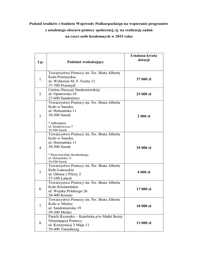 Podział środków z budżetu Wojewody Podkarpackiego na wspieranie programów z ustalonego obszaru pomocy społecznej, tj. na realizację zadań na rzecz osób bezdomnych w 2015 roku Lp. 1. 2. 3. Podmiot wnioskujący Towarzystwo Pomocy im. Św. Brata Alberta Koło Przemyskie ul. Wybrzeże M. F. Focha 12 37-700 Przemyśl Caritas Diecezji Sandomierskiej ul. Opatowska 10 27-600 Sandomierz Towarzystwo Pomocy im. Św. Brata Alberta Koło w Sanoku ul. Hetmańska 11 38-500 Sanok Ustalona kwota dotacji 37 000 zł 25 000 zł 2 000 zł * Jadłodajnia ul. Sienkiewicza 7 38-500 Sanok 4. Towarzystwo Pomocy im. Św. Brata Alberta Koło w Sanoku ul. Hetmańska 11 38-500 Sanok 35 000 zł * Dom Inwalidy Bezdomnego ul. Hetmańska 11 38-500 Sanok 5. 6. 7. 8. Towarzystwo Pomocy im. Św. Brata Alberta Koło Łańcuckie ul. Ottona z Pilczy 2 37-100 Łańcut Towarzystwo Pomocy im. Św. Brata Alberta Koło Krośnieńskie ul. Wojska Polskiego 26 38-400 Krosno Towarzystwo Pomocy im. Św. Brata Alberta Koło w Mielcu ul. Sandomierska 19 39-300 Mielec Parafii Rzymsko – Katolicka p/w Matki Bożej Nieustającej Pomocy ul. Konstytucji 3 Maja 11 39-400 Tarnobrzeg 4 000 zł 17 000 zł 10 000 zł 13 000 zł 9. 10. Koło Stalowowolskie Towarzystwa Pomocy im. Św. Brata Alberta ul. ks. J. Popiełuszki 4, 37-450 Stalowa Wola Towarzystwo Pomocy im. Św. Brata Alberta Koło w Dębicy ul. Słoneczna 1 39-200 Dębica 17 000 zł 25 000 zł * Dom dla bezdomnych mężczyzn oraz noclegownia ul. Słoneczna 1 39-200 Dębica 11. Towarzystwo Pomocy im. Św. Brata Alberta Koło w Dębicy ul. Słoneczna 1 39-200 Dębica 25 000 zł * Dom dla bezdomnych kobiet i mężczyzn oraz noclegownia ul. Brata Alberta 2 (dawna Sandomierska 39) 39-200 Dębica 12. 13. 14. 15. 16. 17. Towarzystwo Pomocy im. Św. Brata Alberta Koło Dynowskie ul. Ks. Józefa Ożoga 12 A 36-065 Dynów Towarzystwo Pomocy im. Św. Brata Alberta Koło Gorzyckie ul. Sandomierska 84a 39-432 Gorzyce Fundacja „LATARNIA” Wola Piotrowa 34 38-505 Bukowsko Rzeszowskie Towarzystwo Pomocy im. Św. Brata Alberta w Rzeszowie ul. Jana Styki 21 35-006 Rzeszów * Oferta wspólna na rzecz: - Schroniska dla Bezdomnych Mężczyzn w Rzeszowie, - Schroniska dla Bezdomnych Mężczyzn w Jaśle, - Schroniska dla Bezdomnych Kobiet w Racławówce, - Hostelu dla Bezdomnych w Rzeszowie) Fundacja Pomocy Młodzieży im. Jana Pawła II „Wzrastanie” z/s Łopuszka Mała 13 Oddział w Jarosławiu ul. Sanowa 11 37-500 Jarosław Caritas Dom Matki i Dziecka ul. Prądzyńskiego 8 37-700 Przemyśl 1 000 zł 14 000 zł 17 000 zł 62 000 zł 29 000 zł 21 000 zł 18. 19. 20. 21. 22. Caritas Archidiecezji Przemyskiej ul. Kapitulna 1 37-700 Przemyśl Towarzystwo Pomocy im. Św. Brata Alberta Koło w Jarosławiu ul. Jasna 4 37-500 Jarosław Caritas Archidiecezji Przemyskiej Oddział Leżajsk ul. Jarosławska 4 37-300 Leżajsk Podkarpacki Bank Żywności ul. Rynek 17/201 35-064 Rzeszów Stowarzyszenie „Emaus - Rzeszów” ul. Batorego 22, 35-005 Rzeszów Ogółem: 49 000 zł 18 000 zł 40 000 zł 7 000 zł 32 000 zł 500 000 zł Organizacje, których wnioski zostały odrzucone z przyczyn formalnych: 1. Fundacja Pomocy Młodzieży im. Jana Pawła II WZRASTANIE w Lipniku z/s w Łopuszce Małej Organizacje, których wnioski zostały odrzucone z przyczyn merytorycznych: 1. Stowarzyszenie „Nowa Kultura” w Jarosławiu