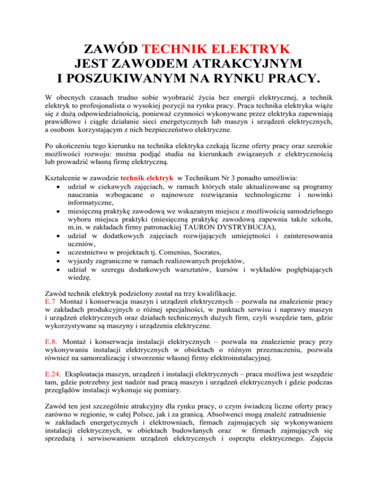ZAWÓD TECHNIK ELEKTRYK JEST ZAWODEM ATRAKCYJNYM I POSZUKIWANYM NA RYNKU PRACY. W obecnych czasach trudno sobie wyobrazić życia bez energii elektrycznej, a technik elektryk to profesjonalista o wysokiej pozycji na rynku pracy. Praca technika elektryka wiąże się z dużą odpowiedzialnością, ponieważ czynności wykonywane przez elektryka zapewniają prawidłowe i ciągłe działanie sieci energetycznych lub maszyn i urządzeń elektrycznych, a osobom korzystającym z nich bezpieczeństwo elektryczne. Po ukończeniu tego kierunku na technika elektryka czekają liczne oferty pracy oraz szerokie możliwości rozwoju: można podjąć studia na kierunkach związanych z elektrycznością lub prowadzić własną firmę elektryczną. Kształcenie w zawodzie technik elektryk w Technikum Nr 3 ponadto umożliwia: udział w ciekawych zajęciach, w ramach których stale aktualizowane są programy nauczania wzbogacane o najnowsze rozwiązania technologiczne i nowinki informatyczne, miesięczną praktykę zawodową we wskazanym miejscu z możliwością samodzielnego wyboru miejsca praktyki (miesięczną praktykę zawodową zapewnia także szkoła, m.in. w zakładach firmy patronackiej TAURON DYSTRYBUCJA), udział w dodatkowych zajęciach rozwijających umiejętności i zainteresowania uczniów, uczestnictwo w projektach tj. Comenius, Socrates, wyjazdy zagraniczne w ramach realizowanych projektów, udział w szeregu dodatkowych warsztatów, kursów i wykładów pogłębiających wiedzę. Zawód technik elektryk podzielony został na trzy kwalifikacje. E.7 Montaż i konserwacja maszyn i urządzeń elektrycznych – pozwala na znalezienie pracy w zakładach produkcyjnych o różnej specjalności, w punktach serwisu i naprawy maszyn i urządzeń elektrycznych oraz działach technicznych dużych firm, czyli wszędzie tam, gdzie wykorzystywane są maszyny i urządzenia elektryczne. E.8. Montaż i konserwacja instalacji elektrycznych – pozwala na znalezienie pracy przy wykonywaniu instalacji elektrycznych w obiektach o różnym przeznaczeniu, pozwala również na samorealizację i stworzenie własnej firmy elektroinstalacyjnej. E.24. Eksploatacja maszyn, urządzeń i instalacji elektrycznych – praca możliwa jest wszędzie tam, gdzie potrzebny jest nadzór nad pracą maszyn i urządzeń elektrycznych i gdzie podczas przeglądów instalacji wykonuje się pomiary. Zawód ten jest szczególnie atrakcyjny dla rynku pracy, o czym świadczą liczne oferty pracy zarówno w regionie, w całej Polsce, jak i za granicą. Absolwenci mogą znaleźć zatrudnienie w zakładach energetycznych i elektrowniach, firmach zajmujących się wykonywaniem instalacji elektrycznych, w obiektach budowlanych oraz w firmach zajmujących się sprzedażą i serwisowaniem urządzeń elektrycznych i osprzętu elektrycznego. Zajęcia prowadzone są przez wysoce wykwalifikowaną kadrę nauczycielską w dobrze wyposażonych pracowniach. Nasi uczniowie mają okazję przygotowywać się do egzaminu w pracowniach, które są jednocześnie salami egzaminacyjnymi. Szkoła zapewnia także realizację praktyk miesięcznych dla uczniów poprzez współpracę z różnymi instytucjami. Podczas nauki istnieje możliwość ukończenia dodatkowego kursu w celu uzyskania zaświadczenia kwalifikacyjnego SEP niezbędnego do podjęcia pracy przy instalacjach i urządzeniach elektrycznych. W skład Zespołu Szkół Nr 3 im. rtm. Witolda Pileckiego wchodzą: 1. XI Liceum Ogólnokształcące klasa dziennikarsko - artystyczna wizażu i stylizacji klasa sportowa – piłki nożnej 2. Technikum Nr 3 technik elektryk technik informatyk technik teleinformatyk technik górnictwa podziemnego 3. Gimnazjum Nr 15 klasa sportowa – piłki nożnej klasy ogólne JAKO SZKOŁA JESTEŚMY: SZKOŁĄ Z KLASĄ, mamy NAUCZYCIELI Z KLASĄ, posiadamy certyfikaty: - ŚLĄSKIEJ SZKOŁY JAKOŚCI, - ZNAKU JAKOŚCI INTERKLASA, - SZKOŁY ZARZĄDZAJĄCEJ WIEDZĄ, - SZKOŁY BEZ PRZEMOCY. A TAKŻE: pomagamy wszystkim uczniom w pełnym rozwoju ich talentów, prowadzimy szeroki zakres działań lekcyjnych i pozalekcyjnych, dzięki któremu nasi uczniowie zdobywają wiedzę oraz umiejętności pozwalające sprostać wyzwaniom dorosłego życia, zapewniamy równość szans i sprawiedliwość społeczną, wspieramy ducha partnerstwa między uczniami i pracownikami, między rodzicami, między społecznością lokalną i szkołą,\ wierzymy, że kształcenie jest procesem trwającym przez całe życie, zapewniamy dobrze zorganizowane, atrakcyjne zajęcia w nowocześnie wyposażonych pracowniach (3 pracownie komputerowe, pracownie do przedmiotów zawodowych: elektryczną i telekomunikacyjną, pracownia interdyscyplinarna i multimedialna) i pracownie przedmiotowe wyposażone w rzutniki multimedialne oraz 2 tablice interaktywne, w bibliotece szkolnej działa centrum multimedialne ze stanowiskami komputerowymi, na terenie szkoły działa Szkolny Ośrodek Kariery prowadzony przez doradcę zawodowego, zajęcia wychowania fizycznego odbywają się na terenie ZS Nr 3: w sali gimnastycznej, na nowym wielofunkcyjnym boisku szkolnym i siłowni, a także na hali MOSiR i na obiektach sportowych Walki Zabrze, placówka zapewnia pomoc pedagoga szkolnego, psychologa i pielęgniarki, szkoła realizuje wiele programów profilaktycznych i wychowawczych, m.in. „Zachowaj trzeźwy umysł” , „Szkolny program przeciwdziałania narkomanii”, „ARS jak dbać o miłość”, szkoła realizuje program patriotyczny, propagując wartości historyczno - narodowe, w szkole prowadzony jest Klub Europejski, uczestniczymy w realizacji różnych projektów unijnych, m.in. Erasmus w szkole jest realizowany program ekologiczny, uczniowie zdobywają najwyższe miejsca w konkursach miejskich i wojewódzkich, osiągają liczne sukcesy na polu artystycznym i sportowym, kadrę pedagogiczną stanowią w przeważającej części nauczyciele o najwyższym stopniu awansu zawodowego (nauczyciele dyplomowani – 85%), a większoś
