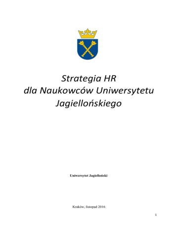 Strategia HR dla Naukowców Uniwersytetu Jagiellońskiego Uniwersytet Jagielloński Kraków, listopad 2016 1 Spis treści: 1. Wprowadzenie 2. O Uniwersytecie Jagiellońskim 3. Metodologia 4. Analiza wewnętrzna wraz z planem działania na lata 2016-2019 5. Monitoring działań 2 1. WPROWADZENIE Uniwersytet Jagielloński, jako jednostka prowadząca badania naukowe na światowym poziomie, chce brać udział w Europejskiej Przestrzeni Badawczej (European Research Area, ERA), która jest głównym polem realizacji polityki naukowo-badawczej Unii Europejskiej. To jedno ze zobowiązań sztandarowej strategii „Europa 2020”, tzw. „Unii Innowacji”. Jej rozwój jest niezbędny, by przeciwdziałać fragmentacji działań naukowych prowadzonych w Unii Europejskiej, a przez to wzmocnić konkurencyjność. Do głównych priorytetów Uniwersytetu Jagiellońskiego należą: 1) jakość i efektywność badań naukowych poprzez: - optymalizację współpracy i konkurencji transnarodowej - zwiększenie skuteczności krajowych systemów badawczych - otwarcie rynku pracy dla naukowców - tworzenie Europejskiego Konsorcjum Infrastruktury Badawczej 2) wzrost poziomu internacjonalizacji 3) jakość poziomu nauczania. W związku z powyższym Uniwersytet Jagielloński zobowiązuje się do stosowania najwyższych standardów w rekrutacji pracowników na wszystkich poziomach, a także do zagwarantowania Naukowcom możliwie najlepszych warunków do wykonywania pracy z poszanowaniem zasad etycznych i w zgodzie z zasadą równości szans oraz zachowaniem równowagi pomiędzy życiem zawodowym a prywatnym. Dlatego też władze Uczelni podjęły decyzję o rozpoczęciu procesu implementacji zapisów Europejskiej Karty Naukowca i Kodeksu Postępowania przy rekrutacji pracowników naukowych do wewnętrznych aktów prawnych, procedur i stosowanych praktyk tak, by stać się pracodawcą atrakcyjnym w skali międzynarodowej i bardziej konkurencyjnym w Europejskiej Przestrzeni Badawczej. 3 2. O UNIWERSYTECIE JAGIELLOŃSKIM Uniwersytet Jagielloński jest najstarszą uczelnią w Polsce i jedną z najstarszych w tym regionie Europy. Ufundowany został 12 maja 1364 roku przez króla polskiego Kazimierza Wielkiego. Studium generale – tak wówczas nazywano Uniwersytet — składało się z trzech wydziałów: sztuk wyzwolonych, medycyny i prawa. Za życia fundatora funkcjonowały tylko dwa pierwsze. Po śmierci króla uczelnia przestała istnieć. Po nieudanych próbach jej odnowienia w latach dziewięćdziesiątych XIV wieku, została ponownie ufundowana przez króla Władysława Jagiełłę 26 lipca 1400 roku. Do odnowienia przyczynił się zapis testamentowy zmarłej w 1399 roku królowej Jadwigi. Struktura uniwersytetu została dopełniona przez wydział teologiczny powołany formalnie już w roku 1397. W XV wieku uniwersytet przeżył jedną z najlepszych faz swego rozwoju. Przyciągał wówczas studentów z całej Europy. Swoją nazwę – Uniwersytet Jagielloński uczelnia nosi od roku 1817. Wśród słynnych absolwentów Uniwersytetu warto wspomnieć m. in. astronoma Mikołaja Kopernika, króla Jana Sobieskiego, papieża Jana Pawła II. Studiowała tu również laureatka nagrody Nobla w dziedzinie literatury Wisława Szymborska. Obecnie Uniwersytet Jagielloński to uczelnia szczycąca się średniowieczną tradycją, którą łączy z dynamicznym rozwojem nowoczesnych kierunków nauki, gdzie na 15 wydziałach kształci się ok. 50 000 studentów i doktorantów. Uniwersytet oferuję 87 kierunków studiów i 142 specjalności. Na sukces uczelni obecnie pracuje około 4000 pracowników naukowych i 3433 administracyjnych. W Rankingu Szkół Wyższych 2012, 2013 i 2015 „Perspektyw” i „Rzeczpospolitej” Uniwersytet Jagielloński został uznany za najlepszą uczelnię w Polsce. W rankingu Perspektywy Univeristy Ranking w 2016 r. Collegium Medicum UJ uznano za najlepszą uczelnię medyczną w Polsce. Uczelnia zajęła 41. miejsce w rankingu brytyjskiego tygodnika „Times Higher Education” stu najlepszych placówek naukowych dwudziestu rynków wschodzących. W ogólnoświatowym rankingu szanghajskim jest klasyfikowany w piątej setce. Według ogólnoświatowego rankingu publikowanego przez The Times Higher Education Supplement (QS World University Rankings) Uniwersytet Jagielloński plasuje się pomiędzy miejscem 431 a 440, w rankingu The Best Global Universities – U.S. News & World Report zajmuje 340 miejsce, zaś w rankingu Center for World University Rankings zajął pomiędzy miejscem 601 a 800. 4 Według Webometrycznego Rankingu Uniwersytetów Świata ze stycznia 2015, pokazującego zaangażowanie instytucji akademickich w istnieniu w sieci Web, uczelnia zajmuje 1. miejsce w Polsce wśród uniwersytetów, a na świecie 287. pośród wszystkich uczelni. Jako jedyna uczelnia w kraju, Uniwersytet Jagielloński jest członkiem wielu stowarzyszeń zrzeszających najbardziej prestiżowe uniwersytety świata, m.in. Ceric (Central European Research Infrastructure Consortium), Grupy Coimbra (Coimbra Group Universities), Uniwersytecka Sieć Współpracy (The Guild f European Research Intensive Universities), Europaeum czy Sieci Utrechckiej (Ultrecht Network). 5 3. METODOLOGIA Strategia HR Uniwersytetu Jagiellońskiego powstała w efekcie pracy zespołu ds. spraw opracowania Strategii HR Excellence in Research, w skład której weszli przedstawiciele: - Centrum Administracyjnego Wsparcia Projektów, tj. Kierownik i Zastępca Kierownika, - Biura Analiz Instytucjonalnych i Raportowania, tj. Kierownik - pełniący jednocześnie funkcję Prodziekana ds. Rozwoju Wydziału Zarządzania i Komunikacji Społecznej oraz Zastępca Kierownika, - Działu Organizacji UJ, - Collegium Medicum UJ, tj. Kierownik Działu Nauki i Współpracy Międzynarodowej UJ CM Zespół pracował pod ścisłym nadzorem przedstawicieli władz Uczelni: Prorektora do spraw polityki kadrowej i finansowej, Prorektora do spraw badań naukowych i funduszy