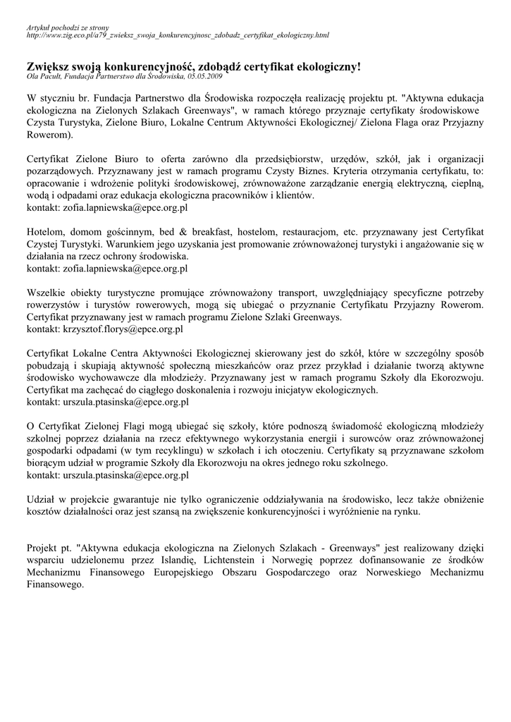 Artykuł pochodzi ze strony http://www.zig.eco.pl/a79_zwieksz_swoja_konkurencyjnosc_zdobadz_certyfikat_ekologiczny.html Zwiększ swoją konkurencyjność, zdobądź certyfikat ekologiczny! Ola Pacułt, Fundacja Partnerstwo dla Środowiska, 05.05.2009 W styczniu br. Fundacja Partnerstwo dla Środowiska rozpoczęła realizację projektu pt. "Aktywna edukacja ekologiczna na Zielonych Szlakach Greenways", w ramach którego przyznaje certyfikaty środowiskowe Czysta Turystyka, Zielone Biuro, Lokalne Centrum Aktywności Ekologicznej/ Zielona Flaga oraz Przyjazny Rowerom). Certyfikat Zielone Biuro to oferta zarówno dla przedsiębiorstw, urzędów, szkół, jak i organizacji pozarządowych. Przyznawany jest w ramach programu Czysty Biznes. Kryteria otrzymania certyfikatu, to: opracowanie i wdrożenie polityki środowiskowej, zrównoważone zarządzanie energią elektryczną, cieplną, wodą i odpadami oraz edukacja ekologiczna pracowników i klientów. kontakt: [email protected] Hotelom, domom gościnnym, bed & breakfast, hostelom, restauracjom, etc. przyznawany jest Certyfikat Czystej Turystyki. Warunkiem jego uzyskania jest promowanie zrównoważonej turystyki i angażowanie się w działania na rzecz ochrony środowiska. kontakt: [email protected] Wszelkie obiekty turystyczne promujące zrównoważony transport, uwzględniający specyficzne potrzeby rowerzystów i turystów rowerowych, mogą się ubiegać o przyznanie Certyfikatu Przyjazny Rowerom. Certyfikat przyznawany jest w ramach programu Zielone Szlaki Greenways. kontakt: [email protected] Certyfikat Lokalne Centra Aktywności Ekologicznej skierowany jest do szkół, które w szczególny sposób pobudzają i skupiają aktywność społeczną mieszkańców oraz przez przykład i działanie tworzą aktywne środowisko wychowawcze dla młodzieży. Przyznawany jest w ramach programu Szkoły dla Ekorozwoju. Certyfikat ma zachęcać do ciągłego doskonalenia i rozwoju inicjatyw ekologicznych. kontakt: [email protected] O Certyfikat Zielonej Flagi mogą ubiegać się szkoły, które podnoszą świadomość ekologiczną młodzieży szkolnej poprzez działania na rzecz efektywnego wykorzystania energii i surowców oraz zrównoważonej gospodarki odpadami (w tym recyklingu) w szkołach i ich otoczeniu. Certyfikaty są przyznawane szkołom biorącym udział w programie Szkoły dla Ekorozwoju na okres jednego roku szkolnego. kontakt: [email protected] Udział w projekcie gwarantuje nie tylko ograniczenie oddziaływania na środowisko, lecz także obniżenie kosztów działalności oraz jest szansą na zwiększenie konkurencyjności i wyróżnienie na rynku. Projekt pt. "Aktywna edukacja ekologiczna na Zielonych Szlakach - Greenways" jest realizowany dzięki wsparciu udzielonemu przez Islandię, Lichtenstein i Norwegię poprzez dofinansowanie ze środków Mechanizmu Finansowego Europejskiego Obszaru Gospodarczego oraz Norweskiego Mechanizmu Finansowego.