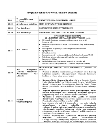 Program obchodów Święta 3 maja w Lublinie 9.00 Trybunał Koronny ul. Rynek 1 UROCZYSTA SESJA RADY MIASTA LUBLIN 10.00 Archikatedra Lubelska MSZA ŚWIĘTA W INTENCJI OJCZYZNY 11.20 Plac Katedralny FORMOWANIE KOLUMNY MARSZOWEJ 11.30 Plac Katedralny PRZEMARSZ Z ARCHIKATEDRY NA PLAC LITEWSKI   11.45 Plac Litewski       13.30 INAUGURACJA FESTYNU TRZECIOMAJOWEGO „Polonez dla Plac Władysława Lublina” Łokietka – Krakowskie  Polonez z udziałem mieszkańców, prowadzony przez tancerzy Przedmieście – Plac lubelskich zespołów folklorystycznych (Przejście tanecznym Litewski krokiem w rytmie tańca narodowego)    13.45 OFICJALNA CZĘŚĆ OBCHODÓW 224. ROCZNICY UCHWALENIA KONSTYTUCJI 3 MAJA Meldunek dowódcy uroczystości i powitanie kompanii honorowych Odegranie hymnu narodowego i podniesienie flagi państwowej na maszt Wystąpienie Wojewody Lubelskiego Wojciecha Wilka Apel pamięci Salwa honorowa Koncert orkiestry wojskowej i Zespołu Tańca Ludowego UMCS Składanie wieńców i wiązanek kwiatów pod pomnikiem Konstytucji 3 Maja Defilada kompanii honorowych i jazdy w mundurach historycznych oraz pojazdów z czasów II wojny światowej FESTYN TRZECIOMAJOWY   Koncert „Pieśni i Tańców Narodowych” w wykonaniu Zespołu Pieśni i Tańca „Lublin” im. W. Kaniorowej, Zespołu Pieśni i Tańca „Jawor” Uniwersytetu Przyrodniczego, Zespołu Pieśni i Tańca Uniwersytetu Medycznego w Lublinie, Zespołu Tańca Ludowego UMCS. Wspólne śpiewanie polskich pieśni patriotycznych, nauka tańców narodowych oraz warsztaty plastyczne (program przygotowany przez PSPiA Klanza i Zespół Sławiniacy) Wycieczki z przewodnikami PTTK „Lublin w czasach Konstytucji 3 Maja” (pierwsze wyjście z przewodnikami sprzed Pomnika Konstytucji 3 Maja o godz. 14.00) Inne atrakcje dla dzieci i dorosłych, w tym m.in. ścianka fotograficzna, wystawa pojazdów historycznych z okresu II wojny światowej oraz luksusowych samochodów zabytkowych, wspólne śpiewanie pieśni patriotycznych animowane przez Grupę Wokalną „Albertus” pod kierownictwem Stanisława Brzozowskiego i inne. Fundacja Niepodległości zaprezentuje zabytkowe pojazdy wojskowe prowadzone przez rekonstruktorów z Grupy Edukacji Historycznej. Pojazdy w barwach jednostek 2 Korpusu Polskiego walczącego we Włoszech pod dowództwem gen. Władysława Andersa:  samochód terenowy Willys „Jeep” w barwach 5 Kresowej Dywizji Piechoty;  Daimler „Dingo” – wóz dowódcy w barwach 6 Pułku Pancernego „Dzieci Lwowskich” z polskiej 2 Brygady Pancernej;  White Scout Car – opancerzony wóz zwiadowczy z 15 Pułku Ułanów Poznańskich;  transporter opancerzony Half-track z baterią czterech najcięższych karabinów maszynowych w barwach 1 Dywizji Pancernej, walczącej w północnej Europie pod dowództwem gen. Stanisława Maczka. Wystawa luksusowych samochodów kolekcjonerskich: - Rolls – Royce Silver Shadow (1972 r.) - Jaguar XJS coupe (1990 r.) - Jaguar XJ series 1 (1969 r.) - Rolls – Royce Silver Spur (ver. long, pocz. lat 90) Imprezy towarzyszące: Teatr Muzyczny w Lublinie zaprasza 3 maja na godz. 19.00 na koncert: „Czas Honoru koncert muzyki z serialu". Wstęp płatny – bilety do nabycia w kasie w Centrum Handlowym „Plaza” i punkcie „Kulturomaniak” w E.Leclerc Lublin ul. Zana19 oraz na portalach internetowych). Muzyka: Bartosz Chajdecki, Dyrektor artystyczny koncertu: Halina Jarczyk, Dyrygent: Alan Urbanek. W koncercie obok solistów, chóru i orkiestry Teatru Muzycznego, wystąpią także połączone lubelskie chóry akademickie oraz gościnnie młodzi soliści. Gośćmi specjalnymi będą występujący w serialu aktorzy: Maciej Zakościelny (filmowy Bronek) oraz Agnieszka Więdłocha (filmowa Lena). Piękna muzyka Bartosza Chajdeckiego będzie przeplatana fragmentami poematów i wierszy Konstantego Ildefonsa Gałczyńskiego, Krzysztofa Kamila Baczyńskiego, Zbigniewa Herberta i Leszka Aleksandra Moczulskiego, dobranych tak, by stanowiły swego rodzaju zapowiedzi lub dopełnienia poszczególnych części utworu muzycznego.