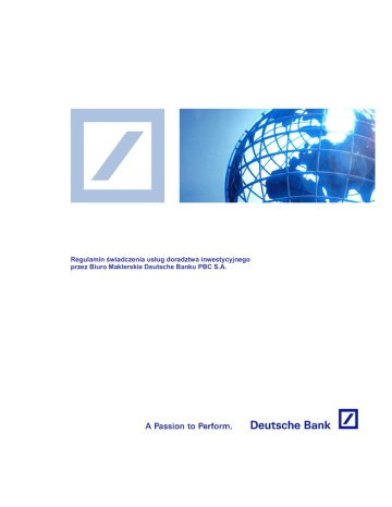 Regulamin wiadczenia us ug doradztwa inwestycyjnego przez Biuro Maklerskie Deutsche Banku PBC S.A. Regulamin wiadczenia us ug doradztwa inwestycyjnego przez Biuro Maklerskie Deutsche Bank PBC S.A. Postanowienia ogólne §1 1. Niniejszy Regulamin okre la prawa i obowi zki Klienta oraz Biura Maklerskiego Deutsche Bank PBC S.A. wynikaj ce z zawarcia Umowy o doradztwo inwestycyjne oraz zasady wiadczenia us ug doradztwa inwestycyjnego w zakresie instrumentów finansowych dopuszczonych do obrotu zorganizowanego. Regulamin okre la w szczególno ci warunki zawierania, wykonywania i rozwi zywania Umowy o doradztwo inwestycyjne. 2. Poj cia u yte w Regulaminie oznaczaj : Bank – Deutsche Bank PBC Spó Akcyjn w Warszawie; Biuro Maklerskie – jednostka organizacyjna Banku, w ramach której prowadzona jest dzia alno maklerska w tym tak e polegaj ca na wiadczeniu us ug doradztwa inwestycyjnego; Klient - osoba fizyczna, osoba prawna lub jednostka organizacyjna nie posiadaj ca osobowo ci prawnej, która zawar a z Bankiem Umow ; RCI – Regionalne Centrum Inwestycyjne - jednostka organizacyjna Banku , w ramach której wykonywane s czynno ci zwi zane z prowadzeniem przez Bank dzia alno ci maklerskiej; Konflikt Interesów - znane Biuru Maklerskiemu okoliczno ci mog ce doprowadzi do powstania sprzeczno ci mi dzy interesem Banku lub osoby z nim powi zanej a obowi zkiem dzia ania przez Biuro Maklerskie w sposób rzetelny z uwzgl dnieniem najlepiej poj tego interesu Klienta. Konflikt interesów mo e powsta w szczególno ci, gdy: a) Bank lub osoba powi zana z Bankiem mo e uzyska korzy lub unikn straty wskutek poniesienia straty lub nieuzyskania korzy ci przez co najmniej jednego Klienta Banku; b) Bank lub osoba z nim powi zana posiada obiektywny powód, aby preferowa Klienta lub grup Klientów w stosunku do innego Klienta lub grupy Klientów; c) Bank lub osoba z nim powi zana posiada obiektywny powód, aby preferowa interes w asny lub osoby trzeciej w stosunku do interesów co najmniej jednego Klienta Banku; Instrumenty Finansowe –krajowe i zagraniczne: 1) papiery warto ciowe; 2) nieb ce papierami warto ciowymi: a) tytu y uczestnictwa w instytucjach zbiorowego inwestowania, b) instrumenty rynku pieni c) finansowe kontrakty terminowe oraz inne równowa ne instrumenty finansowe rozliczane pieni nie, umowy forward dotycz ce stóp procentowych, swapy akcyjne, swapy na stopy procentowe, swapy walutowe, d) opcje kupna lub sprzeda y instrumentów finansowych, opcje na stopy procentowe, opcje walutowe, opcje na takie opcje, oraz inne równowa ne instrumenty finansowe rozliczane pieni nie; RE/46/E/09 2 nego, Regulamin wiadczenia us ug doradztwa inwestycyjnego przez Biuro Maklerskie Deutsche Bank PBC S.A. Obrót Zorganizowany - obrót papierami warto ciowymi lub innymi Instrumentami Finansowymi dokonywany na terytorium Rzeczpospolitej Polskiej na rynku regulowanym albo w alternatywnym systemie obrotu; Portfele Modelowe – proponowane przez Zespó Doradztwa Inwestycyjnego zestawienie konkretnych Instrumentów Finansowych, b propozycja alokacji aktywów w poszczególne kategorie Instrumentów Finansowych, wchodz cych w sk ad portfeli Klientów, w ramach uzgodnionych z Klientami strategii inwestycyjnych; Papiery Warto ciowe – papiery warto ciowe w rozumieniu Ustawy, tj.: a) akcje, prawa poboru w rozumieniu przepisów ustawy z dnia 15 wrze nia 2000 r. - Kodeks spó ek handlowych (Dz. U. Nr 94, poz. 1037, z pó n. zm.), prawa do akcji, warranty subskrypcyjne, kwity depozytowe, obligacje, listy zastawne, certyfikaty inwestycyjne i inne zbywalne papiery warto ciowe, w tym inkorporuj ce prawa maj tkowe odpowiadaj ce prawom wynikaj cym z akcji lub z zaci gni cia d ugu, wyemitowane na podstawie w ciwych przepisów prawa polskiego lub obcego; b) inne zbywalne prawa maj tkowe, które powstaj w wyniku emisji, inkorporuj ce uprawnienie do nabycia lub obj cia papierów warto ciowych okre lonych w lit. a, lub wykonywane poprzez dokonanie rozliczenia pieni nego; Regulamin – niniejszy Regulamin Biuro Maklerskie; wiadczenia us ug doradztwa inwestycyjnego przez Rekomendacja Inwestycyjna – rekomendacja nabycia lub zbycia okre lonych Instrumentów Finansowych, albo powstrzymania si od zawarcia transakcji dotycz cej tych instrumentów, udzielana Klientowi w ramach wiadczenia na jego rzecz, na podstawie zawartej Umowy, us ugi doradztwa inwestycyjnego; Stronie Internetowej – nale y przez to rozumie publicznie dost pne strony internetowe (WWW) o adresie www.deutsche-bank-pbc.pl oraz http://dbmakler.pl/ , na których znajduj si w szczególno ci: opisy produktów wraz z obowi zuj cymi regulaminami, stawkami oprocentowania oraz informacje o wysoko ci op at i prowizji; Tabela Op at - nale y przez to rozumie Tabel op at i prowizji maklerskich DB Securities S.A.; Umowa - umowa o wiadczenie us ug doradztwa inwestycyjnego zawierana i wykonywana zgodnie z Regulaminem; Ustawa - ustawa z dnia 29 lipca 2005 r. o obrocie instrumentami finansowymi (Dz.U. nr 183, poz.1538 z pó n. zm.). Tryb i warunki zawierania, wypowiedzenia oraz rozwi zania umowy. §2 1. Biuro Maklerskie wiadczy us ugi doradztwa inwestycyjnego na zasadach okre lonych obowi zuj cymi przepisami oraz w zakresie posiadanych zezwole . RE/46/E/09 3 Regulamin wiadczenia us ug doradztwa inwestycyjnego przez Biuro Maklerskie Deutsche Bank PBC S.A. 2. Umowa zawierana jest w formie pisemnej. Klient w Umowie potwierdza, e przed zawarciem Umowy zapozna si z tre ci Regulaminu oraz przekazanych mu informacji, o których mowa w ust. 3 poni ej. 3. Przed zawarciem Umowy, Biuro Maklerskie przekazuje potencjalnemu Klientowi w formie pisemnej lub za pomoc elektronicznych no ników informacji (o ile taka forma zosta a wybrana przez Klienta) Regulamin oraz szczegó owe informacje dotycz ce Biura Maklerskiego oraz us ugi doradztwa inwestycyjnego, która ma by wiadczona na podstawie zawieranej Umowy. 4. Informacje dotycz ce Biura Maklerskiego oraz us ugi doradztwa inwestycyjnego zawieraj w szczególno ci