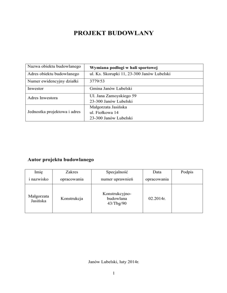 PROJEKT BUDOWLANY Nazwa obiektu budowlanego Adres obiektu budowlanego Wymiana podłogi w hali sportowej ul. Ks. Skorupki 11, 23-300 Janów Lubelski Numer ewidencyjny działki 3779/53 Inwestor Gmina Janów Lubelski Adres Inwestora Ul. Jana Zamoyskiego 59 23-300 Janów Lubelski Małgorzata Jasińska ul. Fiołkowa 14 23-300 Janów Lubelski Jednostka projektowa i adres Autor projektu budowlanego Imię Zakres Specjalność Data i nazwisko opracowania numer uprawnień opracowania Małgorzata Jasińska Konstrukcja Konstrukcyjnobudowlana 43/Tbg/90 02.2014r. Janów Lubelski, luty 2014r. 1 Podpis Spis zawartości projektu budowlanego 1. Strona tytułowa projektu budowlanego str. 1 2. Spis zawartości projektu budowlanego str. 2 3. Opis techniczny str. 3÷9 4. Wypis z rejestru gruntów str. 10 5. Projekt zagospodarowania działki rys. nr 1 str. 11 6. Widok warstw podłogi str. 12÷13 2 OPIS TECHNICZNY do wymiany podłogi w hali sportowej przy Publicznej szkole Podstawowej w Janowie Lubelskim. 1. Przedmiot i cel opracowania Przedmiotem opracowania jest projekt budowlany obejmujący wymianę podłogi w hali sportowej przy Publicznej Szkole Podstawowej zlokalizowanej Janowie Lubelskim przy ulicy Ks. Skorupki11. Celem opracowania jest poprawa bezpieczeństwa dla osób ćwiczących ograniczając prawdopodobieństwo ich kontuzji oraz zapewnienie łatwości utrzymania w czystości po jak najniższych kosztach. Nawierzchnia ma zapewniać warunki do gier zespołowych np. koszykówki, piłki ręcznej, siatkówki, zajęć gimnastycznych dla dzieci, dorosłych oraz osób niepełnosprawnych. 2. Podstawa opracowania Podstawą opracowania są: - wstępne wytyczne wskazane przez inwestora, - wizja lokalna i ustalenia robocze z inwestorem i użytkownikiem, - ustawa Prawo Budowlane, - Rozporządzenie Ministra Infrastruktury z dnia 12.04.2002 r. w sprawie warunków technicznych, jakim powinny odpowiadać budynki i ich usytuowanie (Dz. U. Nr 75, poz. 690). - Europejska Norma EN 14904:2009P (obejmująca wymagania dotyczące nawierzchni do wyposażenia hali do uprawiania wielu dyscyplin sportowych), - Aprobaty Techniczne ITB dotyczące wybranych systemów, - Materiały pomocnicze, instrukcje i karty produktów producenta zestawu dotyczące w/w systemów wykonania sportowych podłóg oraz wchodzących w ich skład wyrobów, 3. Istniejący stan zagospodarowania działki Na rozpatrywanej działce nr ewid. gr. 3779/53 znajduje się zespół budynków Publicznej Szkoły Podstawowej, w tym omawiany budynek – sala gimnastyczna przylegająca jedną zewnętrzną ścianą szczytową do budynku dydaktycznego. Cały teren jest ogrodzony 3 ogrodzeniem trwałym. Dojazd do działki od drogi powiatowej (ulicy Ks. Skorupki) istniejącym zjazdem publicznym. Pozostała część terenu opracowania wykorzystywana jest pod zieleń, dojścia i dojazdy. Działka uzbrojona w sieć z przyłączami: wodociągowym, kanalizacji sanitarnej, kanalizacji deszczowej i energetycznym. Na terenie działki znajdują się również boiska do gier zespołowych: asfaltowe, trawiaste i ze sztuczną nawierzchnią. Zestawienie powierzchni poszczególnych części zagospodarowania działki nie ulegnie zmianie. 3.1 Dane informacyjne Przedmiotowa działka nie jest wpisana do rejestru zabytków i nie podlega ochronie konserwatorskiej na podstawie przepisów odrębnych. Planowana inwestycja nie występuje w sąsiedztwie wymagającym ochrony dobra dóbr kultury współczesnej. Działka znajduje się poza terenem wpływu eksploatacji górniczej. Konstrukcja planowanej inwestycji nie powoduje szczególnych zagrożeń pod warunkiem przestrzegania przepisów BHP określonych prawnie na budowie. 3.2 Dane techniczne budynku sali gimnastycznej Powierzchnia użytkowa hali sportowej wynosi 1 522,80 m2 w tym: powierzchnia podłogi 1 008,0 m2, o wymiarach 24,0m x 42,0m, kubatura 7 358,4 m3. Omawiany obiekt pełni funkcję sali gimnastycznej do gier zespołowych oraz zajęć gimnastycznych dla dzieci, dorosłych oraz osób niepełnosprawnych. Budynek hali sportowej, częściowo podpiwniczony z antresolą, przykryty stropodachem pełnym. Wykonany został w technologii szkieletowej – żelbetowe słupy i dźwigary stalowe. Pola pomiędzy słupami wypełnione: płytami osłonowymi PW8, gazobetonem i cegłą ceramiczną. Całość ścian zewnętrznych została docieplona styropianem gr. 6 cm. w technologii lekko-mokrej z wyprawą mineralną. Stolarka okienna PCV i drzwiowa – drewniana płycinowa. W hali sportowej wyróżnione są boiska do gry : - w kosza, - w piłkę ręczną, - w siatkówkę, - w tenisa ziemnego, - cztery boiska do gry w badmintona. 4 3.3 Opis techniczny istniejącej podłogi Istniejąca podłoga w hali sportowej wykonana jest z wykładziny PCV na podłożu betonowym. Nawierzchnia podłogi jest w znacznym stopniu zużyta. Konstrukcja podłogi na podłożu betonowym nie zachowuje wymaganej sprężystości. Co jest bardzo ważnym elementem przy eksploatacji podłóg sportowych. Szczególna ważność podwyższonej sprężystości podłóg sportowych związana jest z koniecznością ograniczenia ilości i rozległości urazów, które mogą występować u osób uprawiających różne dyscypliny sportu, a zwłaszcza podczas gier zespołowych. Wzdłuż trzech ścian hali sportowej pod podłogą (poza granicami boisk) usytuowane są kanały do wentylacji podłogi. Na podłodze wzdłuż ściany z oknami ustawione są drabinki do ćwiczeń gimnastycznych. Hala sportowa posiada cztery wejścia z korytarza (drzwi drewniane płycinowe o wymiarach 1,50m x 2,05m). Obiekt wyposażony jest w instalację elektryczno-oświetleniową, wod.-kan. c.o. i wentylację grawitacyjna i mechaniczną. 4. Projektowana technologia remontu podłogi sali gimnastycznej Przedmiotem projektowanej wymiany podłogi jest demontaż istniejących warstw podłogi i wykonanie nowej systemowej podłogi sportowej powierzchniowo elastycznej. Szczegółowy zakres robót to: 1. demontaż wykładziny PCV wr
