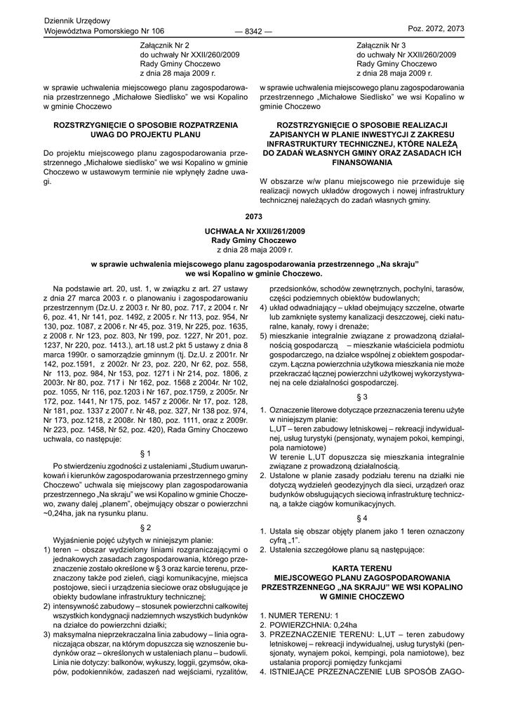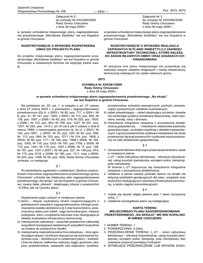 Dziennik Urz dowy Województwa Pomorskiego Nr 106 Poz. 2072, 2073 — 8342 — Zał cznik Nr 2 do uchwały Nr XXII/260/2009 Rady Gminy Choczewo z dnia 28 maja 2009 r. Zał cznik Nr 3 do uchwały Nr XXII/260/2009 Rady Gminy Choczewo z dnia 28 maja 2009 r. w sprawie uchwalenia miejscowego planu zagospodarowania przestrzennego „Michałowe Siedlisko” we wsi Kopalino w gminie Choczewo w sprawie uchwalenia miejscowego planu zagospodarowania przestrzennego „Michałowe Siedlisko” we wsi Kopalino w gminie Choczewo ROZSTRZYGNI CIE O SPOSOBIE ROZPATRZENIA UWAG DO PROJEKTU PLANU ROZSTRZYGNI CIE O SPOSOBIE REALIZACJI ZAPISANYCH W PLANIE INWESTYCJI Z ZAKRESU INFRASTRUKTURY TECHNICZNEJ, KTÓRE NALE DO ZADA WŁASNYCH GMINY ORAZ ZASADACH ICH FINANSOWANIA Do projektu miejscowego planu zagospodarowania przestrzennego „Michałowe siedlisko” we wsi Kopalino w gminie Choczewo w ustawowym terminie nie wpłyn ły adne uwagi. W obszarze w/w planu miejscowego nie przewiduje si realizacji nowych układów drogowych i nowej infrastruktury technicznej nale cych do zada własnych gminy. 2073 UCHWAŁA Nr XXII/261/2009 Rady Gminy Choczewo z dnia 28 maja 2009 r. w sprawie uchwalenia miejscowego planu zagospodarowania przestrzennego „Na skraju” we wsi Kopalino w gminie Choczewo. Na podstawie art. 20, ust. 1, w zwi zku z art. 27 ustawy z dnia 27 marca 2003 r. o planowaniu i zagospodarowaniu przestrzennym (Dz.U. z 2003 r. Nr 80, poz. 717, z 2004 r. Nr 6, poz. 41, Nr 141, poz. 1492, z 2005 r. Nr 113, poz. 954, Nr 130, poz. 1087, z 2006 r. Nr 45, poz. 319, Nr 225, poz. 1635, z 2008 r. Nr 123, poz. 803, Nr 199, poz. 1227, Nr 201, poz. 1237, Nr 220, poz. 1413.), art.18 ust.2 pkt 5 ustawy z dnia 8 marca 1990r. o samorz dzie gminnym (tj. Dz.U. z 2001r. Nr 142, poz.1591, z 2002r. Nr 23, poz. 220, Nr 62, poz. 558, Nr 113, poz. 984, Nr 153, poz. 1271 i Nr 214, poz. 1806, z 2003r. Nr 80, poz. 717 i Nr 162, poz. 1568 z 2004r. Nr 102, poz. 1055, Nr 116, poz.1203 i Nr 167, poz.1759, z 2005r. Nr 172, poz. 1441, Nr 175, poz. 1457 z 2006r. Nr 17, poz. 128, Nr 181, poz. 1337 z 2007 r. Nr 48, poz. 327, Nr 138 poz. 974, Nr 173, poz.1218, z 2008r. Nr 180, poz. 1111, oraz z 2009r. Nr 223, poz. 1458, Nr 52, poz. 420), Rada Gminy Choczewo uchwala, co nast puje: §1 Po stwierdzeniu zgodno ci z ustaleniami „Studium uwarunkowa i kierunków zagospodarowania przestrzennego gminy Choczewo” uchwala si miejscowy plan zagospodarowania przestrzennego „Na skraju” we wsi Kopalino w gminie Choczewo, zwany dalej „planem”, obejmuj cy obszar o powierzchni ~0,24ha, jak na rysunku planu. §2 Wyja nienie poj ć u ytych w niniejszym planie: 1) teren – obszar wydzielony liniami rozgraniczaj cymi o jednakowych zasadach zagospodarowania, którego przeznaczenie zostało okre lone w § 3 oraz karcie terenu, przeznaczony tak e pod ziele , ci gi komunikacyjne, miejsca postojowe, sieci i urz dzenia sieciowe oraz obsługuj ce je obiekty budowlane infrastruktury technicznej; 2) intensywno ć zabudowy – stosunek powierzchni całkowitej wszystkich kondygnacji nadziemnych wszystkich budynków na działce do powierzchni działki; 3) maksymalna nieprzekraczalna linia zabudowy – linia ograniczaj ca obszar, na którym dopuszcza si wznoszenie budynków oraz – okre lonych w ustaleniach planu – budowli. Linia nie dotyczy: balkonów, wykuszy, loggii, gzymsów, okapów, podokienników, zadasze nad wej ciami, ryzalitów, przedsionków, schodów zewn trznych, pochylni, tarasów, cz ci podziemnych obiektów budowlanych; 4) układ odwadniaj cy – układ obejmuj cy szczelne, otwarte lub zamkni te systemy kanalizacji deszczowej, cieki naturalne, kanały, rowy i drena e; 5) mieszkanie integralnie zwi zane z prowadzon działalno ci gospodarcz – mieszkanie wła ciciela podmiotu gospodarczego, na działce wspólnej z obiektem gospodarczym. Ł czna powierzchnia u ytkowa mieszkania nie mo e przekraczać ł cznej powierzchni u ytkowej wykorzystywanej na cele działalno ci gospodarczej. §3 1. Oznaczenie literowe dotycz ce przeznaczenia terenu u yte w niniejszym planie: L,UT – teren zabudowy letniskowej – rekreacji indywidualnej, usług turystyki (pensjonaty, wynajem pokoi, kempingi, pola namiotowe) W terenie L,UT dopuszcza si mieszkania integralnie zwi zane z prowadzon działalno ci . 2. Ustalone w planie zasady podziału terenu na działki nie dotycz wydziele geodezyjnych dla sieci, urz dze oraz budynków obsługuj cych sieciow infrastruktur techniczn , a tak e ci gów komunikacyjnych. §4 1. Ustala si obszar obj ty planem jako 1 teren oznaczony cyfr „1”. 2. Ustalenia szczegółowe planu s nast puj ce: KARTA TERENU MIEJSCOWEGO PLANU ZAGOSPODAROWANIA PRZESTRZENNEGO „NA SKRAJU” WE WSI KOPALINO W GMINIE CHOCZEWO 1. NUMER TERENU: 1 2. POWIERZCHNIA: 0,24ha 3. PRZEZNACZENIE TERENU: L,UT – teren zabudowy letniskowej – rekreacji indywidualnej, usług turystyki (pensjonaty, wynajem pokoi, kempingi, pola namiotowe), bez ustalania proporcji pomi dzy funkcjami 4. ISTNIEJ CE PRZEZNACZENIE LUB SPOSÓB ZAGO- Dziennik Urz dowy Województwa Pomorskiego Nr 106 Poz. 2073 — 8343 — SPODAROWANIA UZNANY ZA ZGODNY Z PLANEM: istniej cy podział na działki 5. ZASADY OCHRONY I KSZTAŁTOWANIA ŁADU PRZESTRZENNEGO: 5.1 zakaz lokalizacji wolnostoj cych no ników reklamowych, 5.2 zakaz stosowania ogrodze pełnych i z prefabrykowanych płytowych elementów betonowych, 5.3 stosuje si zasady zawarte w pkt 6, 8 6. ZASADY KSZTAŁTOWANIA ZABUDOWY I ZAGOSPODAROWANIA DZIAŁKI LUB TERENU: 6.1 linie zabudowy: a) maksymalne nieprzekraczalne, jak na rysunku planu, b) pozostałe – w tym od granic lasu, o którym mowa w pkt 16.1 – zgodnie z przepisami, 6.2 maksymalna wielko ć powierzchni zabudowy w stosunku do powierzchni działki: 20%, 6.3 minimalny procent powierzchni biologicznie czynnej działki: 60%, 6.4 intensywno ć zabudowy działki – minimalna: nie ustala si , maksymalna: 0,4, 6.5 wysoko ć zabudowy – minimalna: nie ustala si , maksymalna: 9m, (maksymalnie dwie ko