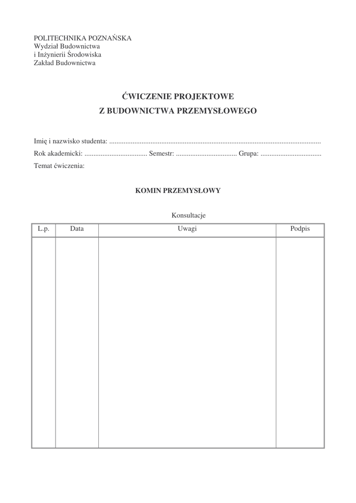 POLITECHNIKA POZNA SKA Wydział Budownictwa i In ynierii rodowiska Zakład Budownictwa WICZENIE PROJEKTOWE Z BUDOWNICTWA PRZEMYSŁOWEGO Imi i nazwisko studenta: ...................................................................................................................... Rok akademicki: ................................... Semestr: .................................. Grupa: .................................. Temat wiczenia: KOMIN PRZEMYSŁOWY Konsultacje L.p. Data Uwagi Podpis ZAPROJEKTOWA KOMIN PRZEMYSŁOWY 1. Dane technologiczne komina: - przekrój trzonu ...................................................... - materiał trzonu ...................................................... - materiał izolacji termicznej ...................................................... - wysoko .................................................. m komina - rednica wylotu .................................................. m - liczba i wej cie czopuchów ...................................................... - zbie no ...................................................... trzonu - temperatura gazów przy wej ciu 2. Strefa obci enia wiatrem ................................................. °C ...................................................... 3. Warunki geotechniczne - poziom wody gruntowej .................................................. m - agresywno ...................................................... wody gruntowej - warunki gruntowe: Poziom Rodzaj i stan gruntu Data wydania wiczenia ....................................... Data oddania wiczenia ........................................ .......................................... podpis prowadz cego ZAKRES OPRACOWANIA 1. Opis techniczny architektoniczno – budowlany konstrukcji komina 2. Obliczenia projektowe 2.1. Dane i zało enia do projektu komina 2.2. Wst pne przyj cie kształtu i wymiarów elementów konstrukcji komina 2.3. Obliczenia termiczne ciany komina nad wej ciem czopucha i w cokole elbetowym 2.4. Obliczenia statyczne komina 2.5. Wymiarowanie segmentów konstrukcji komina 2.6. Obliczenie obr czy trzonu murowanego 2.7. Sprawdzenie ugi cia trzonu komina 2.8. Obliczenie wzmocnienia przekroju osłabionego przy nadziemnym wej ciu czopucha 2.9. Sprawdzenie napr e w gruncie i wymiarowanie fundamentu 3. Rysunki konstrukcyjne 3.1. Widok komina (skala 1:100) 3.2. Przekrój pionowy komina (skala 1:100) 3.3. Przekrój poprzeczny czopucha (skala 1:20) 3.4. Szczegół poł czenia czopucha z trzonem (skala 1:20) 3.5. Szczegół wspornika podwykładzinowego (skala 1:20 lub 1:10) 3.6. Szczegół głowicy komina (skala 1:20 lub 1:10) 3.7. Układ cegieł w dwóch s siednich warstwach w najni szym segmencie komina (skala 1:20) 3.8. Rysunek konstrukcyjny płyty fundamentowej i cokołu (skala 1:20) 3.9. Zbrojenie przekroju osłabionego (skala 1;20) 3.10. Konstrukcja galerii (skala 1:10) 4. Spis literatury wykorzystanej przy opracowaniu tematu wg nast puj cego przykładu: [1] Lipi ski J.: Fundamenty pod maszyny. Arkady, Warszawa 1985. [2] Mendera Z., Gwó d M.: Przyczyny katastrofy budowlanej hali wystawowej Cracow Expo Center. Materiały XVIII Konferencji Naukowo-Technicznej Awarie Budowlane, Szczecin-Mi dzyzdroje 1997. [3] PN-88/B-03004 Kominy murowane i elbetowe. Obliczenia statyczne i projektowanie. OBLICZENIA STATYCZNE (Sposób prezentowania oblicze w wiczeniu projektowym) Pozycja obliczeniowa nr 1. Nazwa elementu konstrukcyjnego. 1.1. Schemat statyczny elementu konstrukcyjnego • Rysunek schematu statycznego • Uzasadnienie doboru schematu statycznego 1.2. Zestawienie obci e • Okre lenie długo ci obliczeniowej • Zestawienie innych danych potrzebnych do oblicze 1.3. Rozwi zanie statyczne – obliczenie M, N, Q • Przy obliczeniach na komputerze zał czy wydruki wykresów tych warto ci • Przy obliczeniach manualnych zastosowa zasad : wzór - podstawienie warto ci wg oznacze wzoru - wynik (w przypadku rozbudowanych wzorów poda wyniki po rednie) 1.4. Rozwi zanie wytrzymało ciowe • Sprawdzenie stanu granicznego no no ci zało onego przekroju lub wyliczenie wymiarów przekroju • Sprawdzenie stanu granicznego u ytkowalno ci • Przy obliczeniach manualnych zastosowa zasad : wzór - podstawienie warto ci wg oznacze wzoru - wynik (w przypadku rozbudowanych wzorów poda wyniki po rednie)