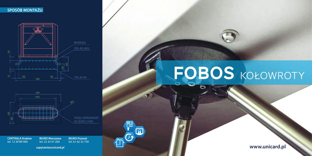 BETON B20 200 400 100 STAL AIII-34GS 50 100 1300 100 STAL A0-St0 FOBOS KOŁOWROTY 1300 1020 600 Ø50 300 PESZEL DOPROWADZIĆ DO JEDNEJ Z NÓG CENTRALA Kraków tel. 12 39 89 900 BIURO Warszawa tel. 22 24 47 200 [email protected] BIURO Poznań tel. 61 62 32 750 www.unicard.pl RODZAJE KOŁOWROTÓW Kołowroty FOBOS KD, RCP i BILETOWE ZASTOSOWANIE Kołowroty niskie serii FOBOS KD, RCP oraz BILETOWE ruchu osobowego w miejscach strzeżonych i nadzorowanych (np. recepcje, portiernie, wydzielone strefy) tak wewnątrz jak i na zewnątrz pomieszczeń. Dedykowane są do zastosowania w systemach kontroli dostępu, rejestracji czasu pracy oraz systemach biletowych. Kołowroty FOBOS przeznaczone są do pracy ciągłej w przejściach o średnim i wysokim natężeniu ruchu osobowego w 1110 300 • kontrola ruchu osobowego w miejscach strzeżonych i nadzorowanych • uporządkowanie i ukierunkowanie ruchu osobowego • kontrola przejścia przy wykorzystaniu trwałych kart zbliżeniowych • łatwa integracja z systemem kontroli dostępu • możliwość kontroli przejścia w obu kierunkach przy zastosowaniu jednego urządzenia • wykluczenie krzyżowania się ciągów komunikacyjnych • elektromechaniczne wspomaganie ruchu ramion ułatwia płynne przechodzenie oraz skraca czas przejścia systemów kontroli dostępu i rejestracji czasu pracy. ZASADA DZIAŁANIA Stan zablokowania kołowrotu, a tym samym brak możliwości przejścia sygnalizowany jest na piktogramie LED (czerwony krzyżyk). Zwolnienie układu blokowania kołowrotu następuje po zarejestrowaniu uprawnionej karty zbliżeniowej, użyciu przycisku lub pilota radiolinii. Standardowo czas odblokowania kołowrotu wynosi ok. 15 sekund i sygnalizowany jest na piktogramie LED w postaci zielonej strzałki. Obrót ramion kołowrotu następuje po przyłożeniu niewielkiej siły na ramię blokujące przejście. Po wykonaniu obrotu (lub po upływie 15 sekund) kołowrót ponownie przechodzi w stan zablokowania, który trwa do chwili ponownego zarejestrowania uprawnionej karty zbliżeniowej (lub np. naciśnięcia przycisku przez portiera). Dwukierunkowy mechanizm umożliwia wykorzystanie jednego kołowrotu do wejścia i wyjścia z blokowaniem ruchu w kierunku niedozwolonym. Kołowrót może być wyposażony w automatycznie opadające ramię, co umożliwia swobodne przejście w przypadku ewakuacji oraz w syrenę alarmową (12V, 110dB) sygnalizującą nieważność karty (brak uprawnień), próbę użycia karty obcej (z innego systemu KD) lub błąd odczytu. 800 635 Każdy kołowrót posiada wbudowane sterowniki kontroli dostępu oraz czytniki zbliżeniowe. Montaż czytników wewnątrz obudowy kołowrotu zapewnia bardzo wysoką estetykę i funkcjonalność rozwiązania oraz wyklucza ryzyko mechanicznego ich uszkodzenia (brak wystających elementów). Wykonana ze stali nierdzewnej obudowa kołowrotu oraz wysoka jakość pozostałych użytych materiałów umożliwia montaż urządzenia w warunkach wewnętrznych i zewnętrznych. 716,7 FOBOS KD 966 CECHY KOŁOWROTÓW FOBOS: • KONTROLA RUCHU OSOBOWEGO W MIEJSCACH STRZEŻONYCH I NADZOROWANYCH • UPORZĄDKOWANIE I UKIERUNKOWANIE RUCHU OSOBOWEGO • KONTROLA PRZEJŚCIA PRZY WYKORZYSTANIU TRWAŁYCH KART ZBLIŻENIOWYCH • SYSTEM RAMION OPADAJĄCYCH • ŁATWA INTEGRACJA Z SYSTEMEM KONTROLI DOSTĘPU I REJESTRACJI CZASU PRACY • MOŻLIWOŚĆ KONTROLI PRZEJŚCIA W OBU KIERUNKACH PRZY ZASTOSOWANIU JEDNEGO URZĄDZENIA • WYKLUCZENIE KRZYŻOWANIA SIĘ CIĄGÓW KOMUNIKACYJNYCH FOBOS RCP • rejestracja czasu pracy, w tym: rejestracja w trybie służbowym • czytelna informacja o dokładnej dacie i godzinie rejestracji (czas systemu rcp) • kontrola ruchu osobowego w miejscach strzeżonych i nadzorowanych • uporządkowanie i ukierunkowanie ruchu osobowego • ograniczenie procederu oszustwa podczas rejestracji kart rcp (rejestracja za inną osobę) • możliwość kontroli przejścia w obu kierunkach przy zastosowaniu jednego urządzenia • wykluczenie krzyżowania się ciągów komunikacyjnych