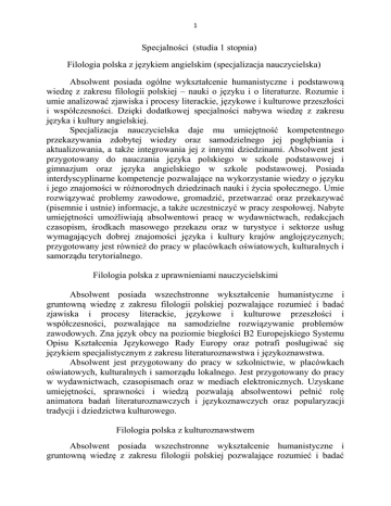 1 Specjalności (studia 1 stopnia) Filologia polska z językiem angielskim (specjalizacja nauczycielska) Absolwent posiada ogólne wykształcenie humanistyczne i podstawową wiedzę z zakresu filologii polskiej – nauki o języku i o literaturze. Rozumie i umie analizować zjawiska i procesy literackie, językowe i kulturowe przeszłości i współczesności. Dzięki dodatkowej specjalności nabywa wiedzę z zakresu języka i kultury angielskiej. Specjalizacja nauczycielska daje mu umiejętność kompetentnego przekazywania zdobytej wiedzy oraz samodzielnego jej pogłębiania i aktualizowania, a także integrowania jej z innymi dziedzinami. Absolwent jest przygotowany do nauczania języka polskiego w szkole podstawowej i gimnazjum oraz języka angielskiego w szkole podstawowej. Posiada interdyscyplinarne kompetencje pozwalające na wykorzystanie wiedzy o języku i jego znajomości w różnorodnych dziedzinach nauki i życia społecznego. Umie rozwiązywać problemy zawodowe, gromadzić, przetwarzać oraz przekazywać (pisemnie i ustnie) informacje, a także uczestniczyć w pracy zespołowej. Nabyte umiejętności umożliwiają absolwentowi pracę w wydawnictwach, redakcjach czasopism, środkach masowego przekazu oraz w turystyce i sektorze usług wymagających dobrej znajomości języka i kultury krajów anglojęzycznych; przygotowany jest również do pracy w placówkach oświatowych, kulturalnych i samorządu terytorialnego. Filologia polska z uprawnieniami nauczycielskimi Absolwent posiada wszechstronne wykształcenie humanistyczne i gruntowną wiedzę z zakresu filologii polskiej pozwalające rozumieć i badać zjawiska i procesy literackie, językowe i kulturowe przeszłości i współczesności, pozwalające na samodzielne rozwiązywanie problemów zawodowych. Zna język obcy na poziomie biegłości B2 Europejskiego Systemu Opisu Kształcenia Językowego Rady Europy oraz potrafi posługiwać się językiem specjalistycznym z zakresu literaturoznawstwa i językoznawstwa. Absolwent jest przygotowany do pracy w szkolnictwie, w placówkach oświatowych, kulturalnych i samorządu lokalnego. Jest przygotowany do pracy w wydawnictwach, czasopismach oraz w mediach elektronicznych. Uzyskane umiejętności, sprawności i wiedzą pozwalają absolwentowi pełnić rolę animatora badań literaturoznawczych i językoznawczych oraz popularyzacji tradycji i dziedzictwa kulturowego. Filologia polska z kulturoznawstwem Absolwent posiada wszechstronne wykształcenie humanistyczne i gruntowną wiedzę z zakresu filologii polskiej pozwalające rozumieć i badać 2 zjawiska i procesy literackie, językowe i kulturowe przeszłości i współczesności. Potrafi samodzielnie rozwiązywać problemy zawodowe. Dzięki nowym treściom kształcenia z zakresu specjalności kulturoznawczej zdobędzie on dodatkową wiedzę i umiejętności przydatne w pracy szkolnej do prowadzenia zajęć z wiedzy o kulturze. Specjalność ta umożliwi mu także podjęcie pracy w charakterze animatora i organizatora życia kulturalnego w lokalnym środowisku. Absolwent zna język obcy na poziomie biegłości B2 Europejskiego Systemu Opisu Kształcenia Językowego Rady Europy oraz umie posługiwać się językiem specjalistycznym z zakresu literaturoznawstwa, językoznawstwa i kulturoznawstwa. Potrafi samodzielnie gromadzić oraz przetwarzać informacje, posługuje się technologia informacyjną, wykorzystując ją w pracy zawodowej. Absolwent jest przygotowany do pracy w szkolnictwie (po uzyskaniu uprawnień pedagogicznych), w placówkach kulturalnych, oświatowych i samorządu lokalnego, w wydawnictwach i czasopismach. Uzyskane umiejętności, sprawności i wiedza pozwalają absolwentowi pełnić rolę animatora badań literaturoznawczych i językoznawczych oraz popularyzacji tradycji i dziedzictwo kulturowego. Filologia polska z dziennikarstwem Absolwent posiada wszechstronne wykształcenie humanistyczne i gruntowna wiedzę z zakresu filologii polskiej pozwalające rozumieć i badać zjawiska i procesy literackie, językowe i kulturowe przeszłości i współczesności, umożliwiające samodzielne rozwiązywanie problemów zawodowych. Ma opanowany język obcy na poziomie biegłości B2 Europejskiego Systemu Opisu Kształcenia Językowego Rady Europy oraz umie posługiwać się terminologią naukową z zakresu literaturoznawstwa i językoznawstwa. Potrafi samodzielnie gromadzić i przetwarzać informacje, poszerzać swoją wiedzę oraz rozwiązywać problemy zawodowe. Absolwent jest przygotowany do pracy w placówkach oświatowych, kulturalnych i samorządu lokalnego. Student jest przygotowany do pracy w mediach i w wydawnictwach. Uzyskane umiejętności, sprawności i wiedza pozwalają absolwentowi pełnić rolę animatora badań literaturoznawczych i językoznawczych oraz popularyzacji tradycji i dziedzictwa kulturowego. Filologia polska z wiedzą o kulturze (specjalizacja nauczycielska) Absolwent posiada wszechstronne wykształcenie humanistyczne i gruntowną wiedzę z zakresu filologii polskiej, pozwalające zrozumieć i badać zjawiska i procesy literackie, językowe i kulturowe przeszłości i współczesności. Posiada wiedzę i umiejętności pozwalające na samodzielne rozwiązywanie problemów zawodowych. 3 Absolwent jest przygotowany do pracy w szkolnictwie do nauczania języka polskiego i wiedzy o kulturze. Może podjąć pracę w placówkach oświatowych, kulturalnych i samorządu lokalnego, w wydawnictwach, w czasopismach oraz w mediach elektronicznych. Uzyskane umiejętności, sprawności i wiedza pozwalają absolwentowi pełnić rolę animatora badań literaturoznawczych i językoznawczych oraz popularyzacji tradycji i dziedzictwa kulturowego. Specjalności (studia drugiego stopnia)