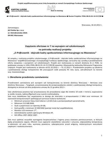 Projekt współfinansowany przez Unię Europejską w ramach Europejskiego Funduszu Społecznego best in training ● E-Pr@cownik – dojrzałe kadry społeczeństwa informacyjnego na Mazowszu ● Numer Projektu: POKL.08.01.01-14-217/09 ● Warszawa, 18.10.2012 r. Zamawiający: bit Polska Sp. z o.o. ul. Ostrobramska 101A 04-041 Warszawa Zapytanie ofertowe nr 7 na wynajem sal szkoleniowych na potrzeby realizacji projektu „E-Pr@cownik - dojrzałe kadry społeczeństwa informacyjnego na Mazowszu” W związku z realizacją projektu szkoleniowego „E-Pr@cownik - dojrzałe kadry społeczeństwa informacyjnego na Mazowszu” współfinansowanego z Europejskiego Funduszu Społecznego, zwracamy się z prośbą o przedstawienie oferty związanej z wynajmem sal szkoleniowych. Projekt jest realizowany w ramach działania 8.1.1 POKL na podstawie umowy nr UDA–POKL.08.01.01-14-217/09-00 zawartej z Mazowiecką Jednostką Wdrażania Programów Unijnych. Projekt jest realizowany w okresie od 01.10.2010 r. – 31.12.2012 r. Przedmiotem projektu są szkolenia z podstawowej obsługi komputerów dla pracujących osób powyżej 45 roku życia, zatrudnionych na terenie woj. mazowieckiego. I. Określenie przedmiotu zamówienia: Przedmiotem zamówienia jest wynajem sali komputerowej na terenie dzielnicy Warszawa – Bemowo oraz dzielnicy Warszawa – Targówek, przystosowanej do przeprowadzenia szkoleń z podstawowej obsługi komputera, dostępnej w okresie od dnia podpisania umowy do 31 grudnia 2012 r. Sala szkoleniowa powinna być przystosowana do prowadzenia zajęć dla średnio 10 osób + trenera, wyposażona w stoliki, krzesła, tablicę (flipchart) oraz rzutnik multimedialny. Sala musi dodatkowo być wyposażona w dostęp do Internetu o przepustowości 2 Mbit oraz minimum 10 stanowisk komputerowych spełniających poniższe kryteria techniczne: • Minimum procesor klasy Intel Celeron 1,6 GHz (lub o porównywalnych parametrach), • Minimum 512 MB RAM, • Dysk o pojemności co najmniej 20 GB, • Karta grafiki z minimum 32 MB RAM (pamięć może być współdzielona), • Monitor LCD minimum 17”, • Zainstalowany system operacyjny Windows XP, • MS Office 1997-2003/ 2007. Sala musi spełniać wszystkie wymagania bezpieczeństwa i higieny pracy stawiane pomieszczeniom, w których będą prowadzone zajęcia. Oferent musi zapewnić oświetlenie naturalne i sztuczne, odpowiednią temperaturę w zależności od pory roku, wymianę powietrza, zabezpieczenie przed wilgocią, niekorzystnymi warunkami cieplnymi i nasłonecznieniem. 1 Projekt współfinansowany przez Unię Europejską w ramach Europejskiego Funduszu Społecznego best in training ● E-Pr@cownik – dojrzałe kadry społeczeństwa informacyjnego na Mazowszu ● Numer Projektu: POKL.08.01.01-14-217/09 ● Oferent zobowiąże się do organizacji przerw kawowych z produktów dostarczanych przez Zamawiającego. Ponadto oferent umożliwi Zamawiającemu oznakowanie sali komputerowej, w której będą odbywały się zajęcia, zgodnie z Wytycznymi dotyczącymi oznaczania projektów w ramach PO KL. Jeżeli świadczą Państwo usługi w w/w zakresie oraz mogą świadczyć usługi w terminie określonym w pkt. V niniejszego zapytania ofertowego, w formularzu ofertowym proszę zaznaczyć: • w pozycji KRYTERIUM DOSTĘPU przez postawienie „X” odpowiednio w kolumnie TAK, jeśli kryterium dostępu jest spełnione lub w kolumnie NIE, jeśli kryterium dostępu nie jest spełnione, • w pozycji DOSTĘPNOŚĆ TERMINÓW przez postawienie „X” odpowiednio w kolumnie TAK, jeśli terminy określone w pkt. V niniejszego zapytania ofertowego są dostępne lub w kolumnie NIE, jeśli terminy dostępne nie są. II. Cena W formularzu ofertowym proszę wpisać cenę netto (w przeliczeniu na jedną godzinę lekcyjną), stawkę podatku VAT oraz cenę brutto (w przeliczeniu na jedną godzinę lekcyjną). III. Usługi dodatkowe Proszę o zaznaczenie możliwych do zrealizowania, wyłącznie bezpłatnych, dodatkowych usług w Państwa ośrodku przez postawienie „X” odpowiednio w kolumnie TAK, jeśli możliwe jest bezpłatne zrealizowanie usługi lub w kolumnie NIE, jeśli nie jest możliwe bezpłatne zrealizowanie usługi. IV. Wybór Wykonawcy Przy wyborze najkorzystniejszej oferty w danej lokalizacji będą brane pod uwagę wyłącznie oferty złożone na formularzu ofertowym stanowiącym załącznik nr 1 do niniejszego zapytania ofertowego wraz z dołączonym Oświadczeniem o braku powiazań osobowych i kapitałowych stanowiącym załącznik nr 2 do niniejszego zapytania ofertowego. Oferty będą oceniane wg kryterium punktowego : max 100 pkt. − cena brutto: 75 pkt. (podstawa wyliczenia: sala szkoleniowa – 1 godzina lekcyjna wynajmu. , gdzie: C – ilość punktów przyznanych danej ofercie za cenę brutto, Cmin- najniższa cena brutto zaoferowana w odpowiedzi na zapytanie, CX – cena brutto rozpatrywanej oferty. − usługi dodatkowe: 25 pkt. , gdzie: 2 Projekt współfinansowany przez Unię Europejską w ramach Europejskiego Funduszu Społecznego best in training ● E-Pr@cownik – dojrzałe kadry społeczeństwa informacyjnego na Mazowszu ● Numer Projektu: POKL.08.01.01-14-217/09 ● D – ilość punktów przyznanych danej ofercie, DX – ilość dodatkowych bezpłatnych usług świadczonych przez Usługodawcę, Dmax – największa liczba dodatkowych bezpłatnych usług świadczonych przez jednego z Usługodawców. Zamawiający wybierze najkorzystniejszą ofertę w danej lokalizacji, która spełnia kryterium dostępu oraz dostępności terminów określone w zapytaniu ofertowym i uzyska najwyższą ilość punktów w oparciu o ustalone wyżej kryteria. Wszystkie dodatkowe informacje zawarte poza formularzem ofertowym nie będą brane pod uwagę. Zamawiający może odstąpić od podpisania umowy bez podania przyczyny. Zamawiający dopuszcza możliwość negocjacji cenowej. V. Termin wykonania zamówienia Wymagany termin wykonania zamówienia: od dni
