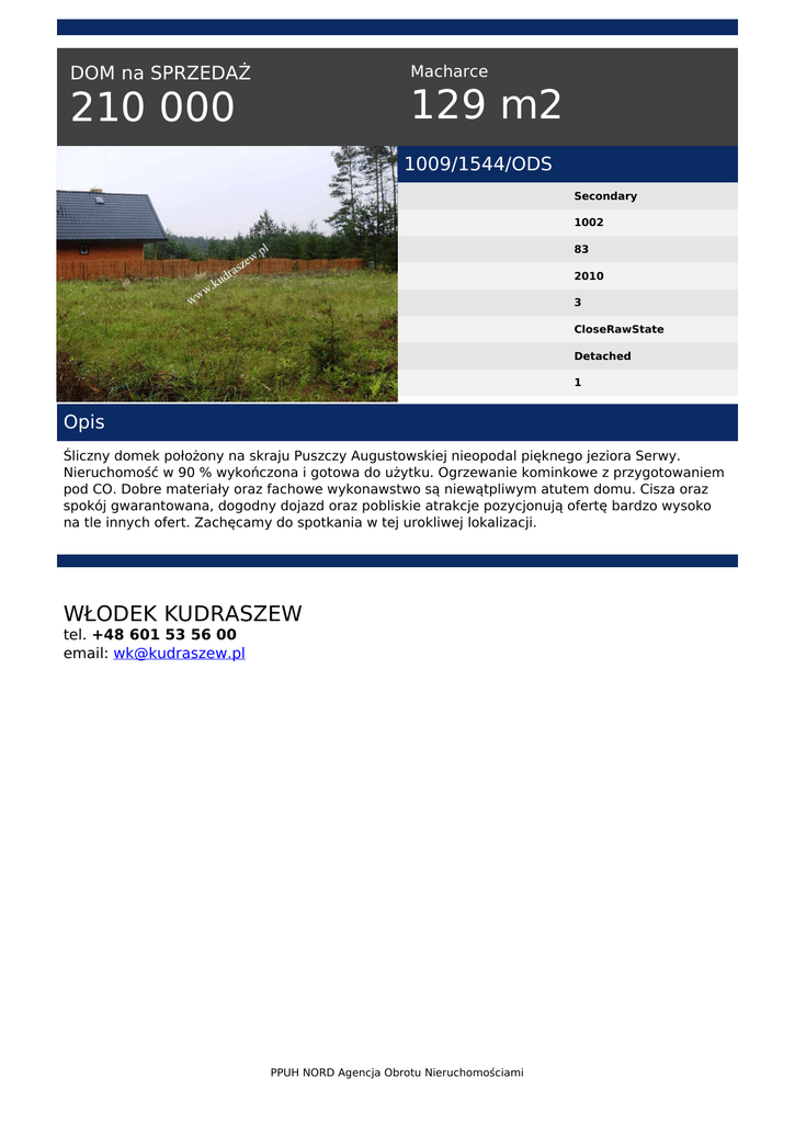 Macharce DOM na SPRZEDAŻ 129 m2 210 000 1009/1544/ODS Secondary 1002 83 2010 3 CloseRawState Detached 1 Opis Śliczny domek położony na skraju Puszczy Augustowskiej nieopodal pięknego jeziora Serwy. Nieruchomość w 90 % wykończona i gotowa do użytku. Ogrzewanie kominkowe z przygotowaniem pod CO. Dobre materiały oraz fachowe wykonawstwo są niewątpliwym atutem domu. Cisza oraz spokój gwarantowana, dogodny dojazd oraz pobliskie atrakcje pozycjonują ofertę bardzo wysoko na tle innych ofert. Zachęcamy do spotkania w tej urokliwej lokalizacji. WŁODEK KUDRASZEW tel. +48 601 53 56 00 email: [email protected] PPUH NORD Agencja Obrotu Nieruchomościami Powered by TCPDF (www.tcpdf.org)