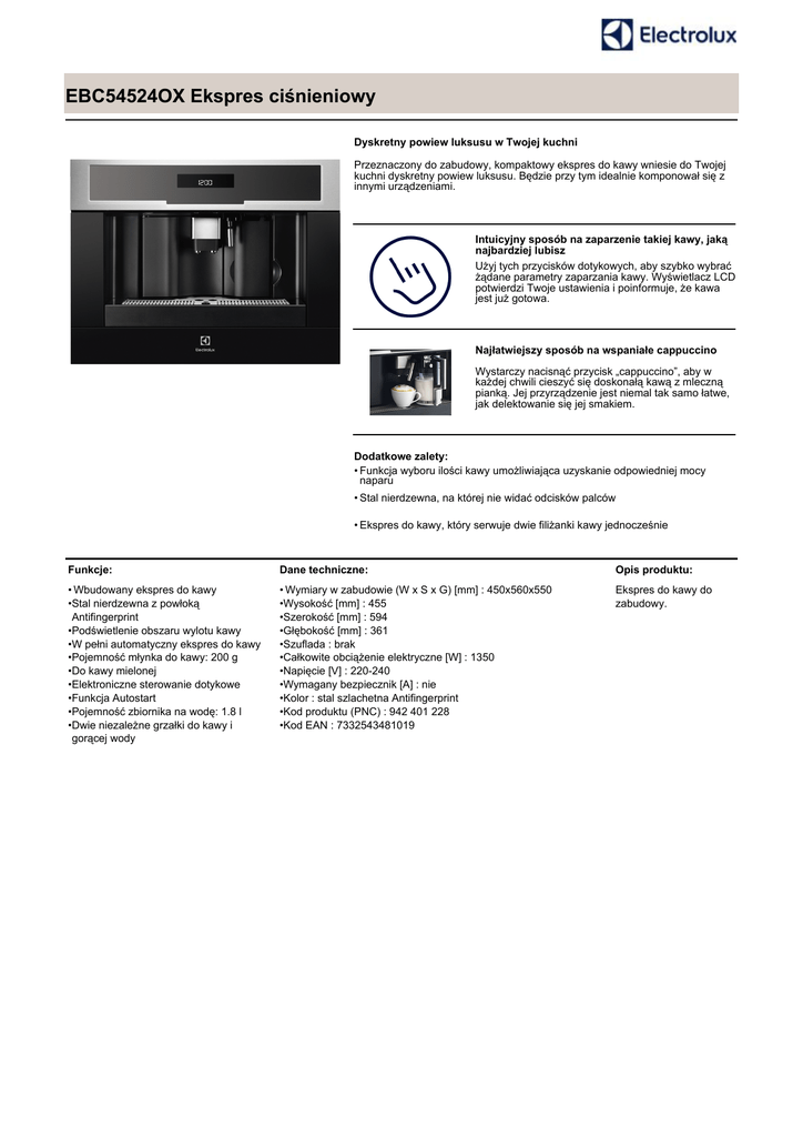 EBC54524OX Ekspres ciśnieniowy Dyskretny powiew luksusu w Twojej kuchni Przeznaczony do zabudowy, kompaktowy ekspres do kawy wniesie do Twojej kuchni dyskretny powiew luksusu. Będzie przy tym idealnie komponował się z innymi urządzeniami. Intuicyjny sposób na zaparzenie takiej kawy, jaką najbardziej lubisz Użyj tych przycisków dotykowych, aby szybko wybrać żądane parametry zaparzania kawy. Wyświetlacz LCD potwierdzi Twoje ustawienia i poinformuje, że kawa jest już gotowa. Najłatwiejszy sposób na wspaniałe cappuccino Wystarczy nacisnąć przycisk „cappuccino”, aby w każdej chwili cieszyć się doskonałą kawą z mleczną pianką. Jej przyrządzenie jest niemal tak samo łatwe, jak delektowanie się jej smakiem. Dodatkowe zalety: • Funkcja wyboru ilości kawy umożliwiająca uzyskanie odpowiedniej mocy naparu • Stal nierdzewna, na której nie widać odcisków palców • Ekspres do kawy, który serwuje dwie filiżanki kawy jednocześnie Funkcje: Dane techniczne: Opis produktu: • Wbudowany ekspres do kawy •Stal nierdzewna z powłoką Antifingerprint •Podświetlenie obszaru wylotu kawy •W pełni automatyczny ekspres do kawy •Pojemność młynka do kawy: 200 g •Do kawy mielonej •Elektroniczne sterowanie dotykowe •Funkcja Autostart •Pojemność zbiornika na wodę: 1.8 l •Dwie niezależne grzałki do kawy i gorącej wody • Wymiary w zabudowie (W x S x G) [mm] : 450x560x550 •Wysokość [mm] : 455 •Szerokość [mm] : 594 •Głębokość [mm] : 361 •Szuflada : brak •Całkowite obciążenie elektryczne [W] : 1350 •Napięcie [V] : 220-240 •Wymagany bezpiecznik [A] : nie •Kolor : stal szlachetna Antifingerprint •Kod produktu (PNC) : 942 401 228 •Kod EAN : 7332543481019 Ekspres do kawy do zabudowy. EBC54524OX Ekspres ciśnieniowy