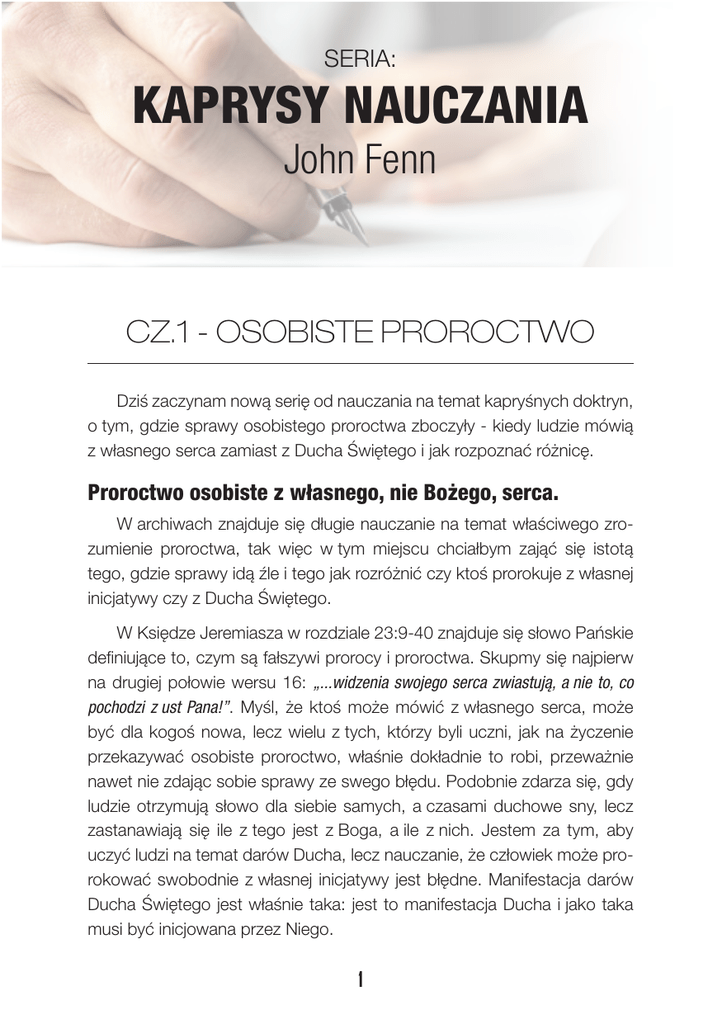 SERIA: KAPRYSY NAUCZANIA John Fenn CZ.1 - OSOBISTE PROROCTWO Dziś zaczynam nową serię od nauczania na temat kapryśnych doktryn, o tym, gdzie sprawy osobistego proroctwa zboczyły - kiedy ludzie mówią z własnego serca zamiast z Ducha Świętego i jak rozpoznać różnicę. Proroctwo osobiste z własnego, nie Bożego, serca. W archiwach znajduje się długie nauczanie na temat właściwego zrozumienie proroctwa, tak więc w tym miejscu chciałbym zająć się istotą tego, gdzie sprawy idą źle i tego jak rozróżnić czy ktoś prorokuje z własnej inicjatywy czy z Ducha Świętego. W Księdze Jeremiasza w rozdziale 23:9-40 znajduje się słowo Pańskie definiujące to, czym są fałszywi prorocy i proroctwa. Skupmy się najpierw na drugiej połowie wersu 16: „...widzenia swojego serca zwiastują, a nie to, co pochodzi z ust Pana!”. Myśl, że ktoś może mówić z własnego serca, może być dla kogoś nowa, lecz wielu z tych, którzy byli uczni, jak na życzenie przekazywać osobiste proroctwo, właśnie dokładnie to robi, przeważnie nawet nie zdając sobie sprawy ze swego błędu. Podobnie zdarza się, gdy ludzie otrzymują słowo dla siebie samych, a czasami duchowe sny, lecz zastanawiają się ile z tego jest z Boga, a ile z nich. Jestem za tym, aby uczyć ludzi na temat darów Ducha, lecz nauczanie, że człowiek może prorokować swobodnie z własnej inicjatywy jest błędne. Manifestacja darów Ducha Świętego jest właśnie taka: jest to manifestacja Ducha i jako taka musi być inicjowana przez Niego. 1 Przykład Doskonałym przykładem proroctwa wypowiadanego z ludzkiego serca znajduje się w 28 rozdziale Księgi Jeremiasza. Mamy tu do czynienia z sytuacją, gdy Nebakadnezar, król Babilonu ma najechać Judę i zniszczyć ją. Już zajął i złupił skarbnicę świątynną, lecz pozwolił królowi Sedekiaszowi zachować tron. Sedekasz oczekiwał na słowo od Pana, co robić. Jeremiasz prorokował słowo Pańskie, mówiące że pokój jest możliwy wyłącznie jeśli zawarty zostanie traktat z Nabokadnezarem, lecz jeśli jedna będą z nim walczyć, zostaną pokonani a Jerozolima zniszczona. Prorok Chananiasz zwiastował słowo ze swego własnego serca, mówiąc mu, że Bóg uczyni wielkie i wspaniałe rzeczy na jego rzecz, stwierdzając w doskonałym stylu „tak mówi Pan” w wersach 2-4 (B.W-P): „(2) Tak mówi Pan zastępów, Bóg Izraelski: Połamałem jarzmo króla Babilońskiego; (3) Po dwóch latach przywrócę zasię na to miejsce wszystkie naczynia domu Pańskiego, które pobrał Nabuchodonozor, król Babiloński, z tego miejsca, a zawiózł je do Babilonu. (4) Także Jechonijasza, syna Joakimowego, króla Judzkiego, i wszystkich, którzy są w niewolę zaprowadzeni z Judy, którzy się dostali do Babilonu, Ja zasię przywiodę na to miejsce, mówi Pan; bo skruszę jarzmo króla Babilońskiego”. (Uwaga: to samo jarzmo, o którym mówił w wersie drugim, że już jest złamane – sam sobie zaprzeczając, w większości tłumaczeń1). W przeciwieństwie do tego proroctwo Jeremiasza było krótkie i zwarte: Zawrzyj układ z Nabukadnezarem a będziesz uratowany. Jakie więc widzimy do tej pory cechy charakterystyczne? Charakterystyka osobistego proroctwa z własnego serc (Chananiasz) 1) Często jest to długa, kwiecista mowa, przekazywana z wymachiwaniem rękami i odważnie, 2) zwraca się do ego, 3) mówi człowiekowi to, co chce on usłyszeć, w szczególności ubierając to w ‚powrót z niewoli’ od przeciwnika, 1 Przyp.tłum: z większości polskich przekładów niestety tylko Biblia Gdańska zachowuje tą sprzeczność. 2 4) obejmuje mowę o bogactwach i/lub odnowieniu posiadłości czy to bezpośrednio, czy w duchowym sensie, 5) zaprzecza samo sobie, jak w przypadku Chananiasza w wersach 2 i 4, 6) jest skoncentrowane na człowieku, na ‚mnie’, na tym co Bóg „mi” czyni. Charakterystyka prawdziwego proroctwa (Jeremiasz) 7) Zazwyczaj jest krótsze, zwięzłe, celne, 8) jest to zwykła mowa, bez upiększeń, i ‚religijnego’ słownictwa, 9) zajmuje się człowiekiem, który ma robić właściwe rzeczy, 10)skupiona jest na Bogu, a nie na „mnie”, 11)wymaga pokornego serca, często związane jest z jakimiś wymaganiami, aby zrobić coś nieprzyjemnego, lecz koniecznego do wzrostu w Panu, zawsze kierując człowieka ku wzrostowi i dojrzałości. Jer. 23: 9-40 Pan przechodzi do szczegółów dotyczących fałszywych proroków i proroctw w wersach 9-49, wypowiadanych z ludzkiego serca. W wersie 16 mówi: „...oni was tylko mamią, widzenia własnego serca wam zwiastują”. Osobiste proroctwo, które jest przekazywane z własnej woli, a nie z Boga, wywołuje próżność, zwraca się do pychy i dlatego jest to jedna z przyczyn tego, że są tak długie, dramatyczne i kwieciste. Jeśli jednak znasz Pana na tyle długo i słyszałeś kiedykolwiek, jak On mówi do ciebie czy choćby czytając ewangelie, widzisz, że Jezus nie marnował słów, nie upiększał tego, co mówił, lecz używał potocznej mowy i było to zwarte. On się nigdy nie zmienia. Porównaj swoje osobiste proroctwo z jasnością i zwięzłością wypowiedzi Jezusa w Ewangeliach, w Dziejach i z Jego przesłaniem do 7 kościołów w Objawieniu Jana. Czy to co otrzymałeś, jest równie jasne, zwarte i skoncentrowane na Bogu? Prawdziwe proroctwo jest zwarte i kieruje człowieka ku pokorze i służbie dla Pana, podczas gdy fałszywe słowa zwracają się do ego i próżności, i dlatego są często długie. Świadectwem Jezusa jest Duch proroctwa (nie naszym świadectwem) (Obj. 19:10). Czy to, co otrzymałeś jest o Nim i o uczynkach prawości w Nim? 3 W w. 21 mówi: „Nie posyłałem proroków, a oni jednak biegną; nie mówiłem do nich, a oni jednak prorokują” (są żarliwi, natrętni, uparci w przekazaniu ci słowa). Handlują tym darem lub sobą, są więc kierowani żądzą pieniędzy, władzy/wpływu/ego. Biegną do ciebie z przyczyn osobistych, aby cię „błogos