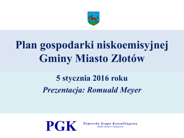 Plan gospodarki niskoemisyjnej Gminy Miasto Złotów 5 stycznia 2016 roku Prezentacja: Romuald Meyer Co to jest PGN? Plan gospodarki niskoemisyjnej (PGN) to strategiczny dokument dla gminy, mający wpływ na lokalną gospodarkę ekologiczną i energetyczną. PGN zawiera informacje o ilości wprowadzanych do powietrza pyłów i gazów cieplarnianych na terenie gminy, podając jednocześnie propozycje konkretnych i efektywnych działań ograniczających te ilości. 2016-01-13 PGK SA 2 Potrzeba sporządzenia i realizacji PGN wynika ze zobowiązań, określonych w ratyfikowanym przez Polskę Protokole z Kioto oraz w pakiecie klimatyczno-energetycznym, przyjętym przez Komisję Europejską w grudniu 2008 roku. Działania określone w PGN są zgodne z polityką naszego kraju w przedmiocie sprawy i wynikają z Założeń Narodowego Programu Rozwoju Gospodarki Niskoemisyjnej, przyjętych przez Radę Ministrów 16 sierpnia 2011 roku. Plan gospodarki niskoemisyjnej dla Gminy Miasto Złotów pomoże w spełnieniu obowiązków nałożonych na jednostki sektora publicznego w zakresie efektywności energetycznej. Posiadanie Planu będzie podstawą do uzyskania dotacji m.in. na cele termomodernizacyjne z budżetu Unii Europejskiej w perspektywie finansowej 2015-2020 2016-01-13 PGK SA 3 Charakterystyka Gminy Miasto Złotów Gmina Miasto Złotów znajduje się w północnej części województwa wielkopolskiego, jest siedzibą władz powiatu złotowskiego. Złotów jest jednym z największych miast Krajny, leży nad rzeką Głomią i w otoczeniu pięciu jezior polodowcowych: Miejskiego, Zaleskiego, Baba, Proboszczowskiego, Burmistrzowskiego. Teren miasta leży na Pojezierzu Krajeńskim, położonym pomiędzy dolinami Gwdy, Brdy i środkowej Noteci, stanowiącym część Pojezierza Południowopomorskiego. Gmina Miasto Złotów stanowi centrum społeczno-gospodarcze powiatu złotowskiego. Miasto od Poznania dzieli 120 km, od Szczecina 167 km, od Piły 31 km oraz od Bydgoszczy 71 km. 2016-01-13 PGK SA 4 System ciepłowniczy Na obszarze Gminy Miasto Złotów dominują indywidualne systemy zaopatrzenia w ciepło wykorzystujące nośniki energii w postaci paliw stałych (przede wszystkim węgiel kamienny, miał węglowy, drewno i odpady z drewna). Kotłownie te nie tworzą zintegrowanego systemu ciepłowniczego. Podstawowym problemem z jakim boryka się Gmina Miasto Złotów, podobnie jak w całym kraju jest budownictwo komunalne, zły stan techniczny obiektów, wysoka energochłonność oraz sposób ogrzewania budynków, głównie paliwami stałymi, często niskiej jakości. Sytuacja taka tworzy zjawisko zwane „niską emisją” i dotyczy głównie źródeł emitujących zanieczyszczenia przez kominy do 40 m wysokości. 2016-01-13 PGK SA 5 System ciepłowniczy c.d. Sposób ogrzewania mieszkań i budynków na terenie Gminy Miasto Złotów dla 2002 roku przedstawia poniższa tabela. Brak danych dla 2013 roku. Rok Ogółem [m2] Budynki z c. o. zbiorowym [m2] Budynki z c. o. indywidualnym [m2] Budynki z piecami [m2] 2002 387 751,0 159 734,0 185 202,0 41 399,0 2016-01-13 PGK SA 6 System ciepłowniczy c.d. Powyższe dane doskonale obrazuje wykres kołowy przedstawiony poniżej. Najczęściej stosowane było indywidualne centralne ogrzewanie, które wynosiło 48%. Budynki ogrzewane piecami to 11%. Natomiast zbiorowe ogrzewanie stanowiło 41%. 2016-01-13 PGK SA 7 System gazowniczy Dostawcą gazu na terenie gminy miejskiej jest DUON. Gaz ziemny doprowadzony do gminy miejskiej jest gazem zaazotowanym typu GZ50. Jego dostarczanie odbywa się gazociągiem wysokiego ciśnienia wykonanym jako odboczka gazociągu w/c relacji Piła – Szczecinek – Wierzchowo. Gazociąg doprowadzany jest do miasta od strony południowej, gdzie zlokalizowana jest stacja redukcyjno – pomiarowa pierwszego stopnia. Następnie gazociągami średniego ciśnienia, gaz doprowadzany jest do odbiorców. 2016-01-13 PGK SA 8 System elektroenergetyczny Dystrybucją energii elektrycznej na terenie Gminy Miasto Złotów zajmuje się ENEA Operator. Sieć energetyczna Gmina Miasto Złotów zasilane jest w energię elektryczną linią wysokiego napięcia 110 kV relacji Krzewina – Szczecinek. Linia ta doprowadza energię do GPZ 110 kV/15 kV – Złotów, który zlokalizowany jest w południowej części miasta. Stąd liniami 15 kV energia doprowadzana jest do poszczególnych stacji transformatorowych 15 kV/04 kV na terenie gminy miejskiej oraz do pobliskich miejscowości. Siecią linii kablowych niskich napięć trafia do odbiorców. 2016-01-13 PGK SA 9 System elektroenergetyczny c.d. Oświetlenie uliczne W 2013 roku na terenie gminy miejskiej na komunalne oświetlenie publiczne zużyto 702,00 MWh energii. Zużycie energii elektrycznej w gospodarstwach domowych różni się znacznie w zależności od sposobów użytkowania, a także od stopnia zamożności użytkowników. Jego wielkość zależy od: rodzaju oświetlenia, napędów artykułów gospodarstwa domowego: pralkach, chłodziarkach i zamrażarkach, kuchniach elektrycznych itp. zużycia energii elektrycznej do ogrzewania pomieszczeń i przygotowywania ciepłej wody użytkowej. 2016-01-13 PGK SA 10 Transport Kolejnym obszarem, obok infrastruktury energetycznej, ciepłowniczej i gazowej, który znacznie oddziałuje na środowisko jest obszar związany z infrastrukturą komunikacyjną. Transport wpływa na stan jakości powietrza na terenie Gminy Miasto Złotów. Zanieczyszczenia komunikacyjne, w tym głównie dwutlenek węgla, pogarszają jakość powietrza atmosferycznego oraz wpływają na wzrost stężenia ozonu w troposferze. Przez Gminę Miasto Złotów nie przebiegają główne trasy komunikacyjne drogowe i kolejowe. Najbliższe drogi krajowe nr 11 i 22 przebiegają przez Jastrowie, położone ok. 14 km od miasta. Przez teren miasta przebiega droga wojewódzka nr 188, której długość w granicach miasta wynosi 4,1 km oraz droga wojewódzka nr 189 o długości w granicach miasta 5,6 km. 201