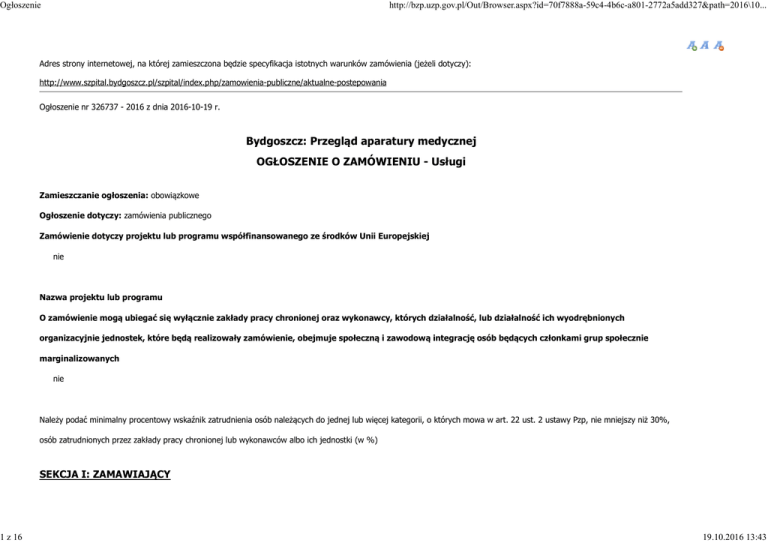 Ogłoszenie 1 z 16 http://bzp.uzp.gov.pl/Out/Browser.aspx?id=70f7888a-59c4-4b6c-a801-2772a5add327&path=2016\10... Adres strony internetowej, na której zamieszczona będzie specyfikacja istotnych warunków zamówienia (jeżeli dotyczy): http://www.szpital.bydgoszcz.pl/szpital/index.php/zamowienia-publiczne/aktualne-postepowania Ogłoszenie nr 326737 - 2016 z dnia 2016-10-19 r. Bydgoszcz: Przegląd aparatury medycznej OGŁOSZENIE O ZAMÓWIENIU - Usługi Zamieszczanie ogłoszenia: obowiązkowe Ogłoszenie dotyczy: zamówienia publicznego Zamówienie dotyczy projektu lub programu współfinansowanego ze środków Unii Europejskiej nie Nazwa projektu lub programu O zamówienie mogą ubiegać się wyłącznie zakłady pracy chronionej oraz wykonawcy, których działalność, lub działalność ich wyodrębnionych organizacyjnie jednostek, które będą realizowały zamówienie, obejmuje społeczną i zawodową integrację osób będących członkami grup społecznie marginalizowanych nie Należy podać minimalny procentowy wskaźnik zatrudnienia osób należących do jednej lub więcej kategorii, o których mowa w art. 22 ust. 2 ustawy Pzp, nie mniejszy niż 30%, osób zatrudnionych przez zakłady pracy chronionej lub wykonawców albo ich jednostki (w %) SEKCJA I: ZAMAWIAJĄCY 19.10.2016 13:43 Ogłoszenie 2 z 16 http://bzp.uzp.gov.pl/Out/Browser.aspx?id=70f7888a-59c4-4b6c-a801-2772a5add327&path=2016\10... Postępowanie przeprowadza centralny zamawiający nie Postępowanie przeprowadza podmiot, któremu zamawiający powierzył/powierzyli przeprowadzenie postępowania nie Informacje na temat podmiotu któremu zamawiający powierzył/powierzyli prowadzenie postępowania: Postępowanie jest przeprowadzane wspólnie przez zamawiających nie Jeżeli tak, należy wymienić zamawiających, którzy wspólnie przeprowadzają postępowanie oraz podać adresy ich siedzib, krajowe numery identyfikacyjne oraz osoby do kontaktów wraz z danymi do kontaktów: Postępowanie jest przeprowadzane wspólnie z zamawiającymi z innych państw członkowskich Unii Europejskiej nie W przypadku przeprowadzania postępowania wspólnie z zamawiającymi z innych państw członkowskich Unii Europejskiej – mające zastosowanie krajowe prawo zamówień publicznych: Informacje dodatkowe: I. 1) NAZWA I ADRES: Wielospecjalistyczny Szpital Miejski im. dr Emila Warmińskiego Samodzielny Publiczny Zakład Opieki Zdrowotnej, krajowy numer identyfikacyjny 092354746, ul. Szpitalna 19, 85-826 Bydgoszcz, woj. kujawsko-pomorskie, państwo Polska, tel. +48523709124, e-mail , faks +48523709125. Adres strony internetowej (URL): I. 2) RODZAJ ZAMAWIAJĄCEGO: Inny: Samodzielny Publiczny Zakład Opieki Zdrowotnej I.3) WSPÓLNE UDZIELANIE ZAMÓWIENIA (jeżeli dotyczy): Podział obowiązków między zamawiającymi w przypadku wspólnego przeprowadzania postępowania, w tym w przypadku wspólnego przeprowadzania postępowania z 19.10.2016 13:43 Ogłoszenie 3 z 16 http://bzp.uzp.gov.pl/Out/Browser.aspx?id=70f7888a-59c4-4b6c-a801-2772a5add327&path=2016\10... zamawiającymi z innych państw członkowskich Unii Europejskiej (który z zamawiających jest odpowiedzialny za przeprowadzenie postępowania, czy i w jakim zakresie za przeprowadzenie postępowania odpowiadają pozostali zamawiający, czy zamówienie będzie udzielane przez każdego z zamawiających indywidualnie, czy zamówienie zostanie udzielone w imieniu i na rzecz pozostałych zamawiających): I.4) KOMUNIKACJA: Nieograniczony, pełny i bezpośredni dostęp do dokumentów z postępowania można uzyskać pod adresem (URL) nie Adres strony internetowej, na której zamieszczona będzie specyfikacja istotnych warunków zamówienia tak http://www.szpital.bydgoszcz.pl/szpital/index.php/zamowienia-publiczne/aktualne-postepowania Dostęp do dokumentów z postępowania jest ograniczony - więcej informacji można uzyskać pod adresem nie Oferty lub wnioski o dopuszczenie do udziału w postępowaniu należy przesyłać: Elektronicznie nie adres Dopuszczone jest przesłanie ofert lub wniosków o dopuszczenie do udziału w postępowaniu w inny sposób: nie Wymagane jest przesłanie ofert lub wniosków o dopuszczenie do udziału w postępowaniu w inny sposób: nie 19.10.2016 13:43 Ogłoszenie 4 z 16 http://bzp.uzp.gov.pl/Out/Browser.aspx?id=70f7888a-59c4-4b6c-a801-2772a5add327&path=2016\10... Adres: Komunikacja elektroniczna wymaga korzystania z narzędzi i urządzeń lub formatów plików, które nie są ogólnie dostępne nie Nieograniczony, pełny, bezpośredni i bezpłatny dostęp do tych narzędzi można uzyskać pod adresem: (URL) SEKCJA II: PRZEDMIOT ZAMÓWIENIA II.1) Nazwa nadana zamówieniu przez zamawiającego: Przegląd aparatury medycznej Numer referencyjny: PREK-270-71/2016 Przed wszczęciem postępowania o udzielenie zamówienia przeprowadzono dialog techniczny nie II.2) Rodzaj zamówienia: usługi II.3) Informacja o możliwości składania ofert częściowych Zamówienie podzielone jest na części: Tak Oferty lub wnioski o dopuszczenie do udziału w postępowaniu można składać w odniesieniu do: wszystkich części II.4) Krótki opis przedmiotu zamówienia (wielkość, zakres, rodzaj i ilość dostaw, usług lub robót budowlanych lub określenie zapotrzebowania i wymagań ) a w przypadku partnerstwa innowacyjnego - określenie zapotrzebowania na innowacyjny produkt, usługę lub roboty budowlane: Przegląd aparatury medycznej 19.10.2016 13:43 Ogłoszenie 5 z 16 http://bzp.uzp.gov.pl/Out/Browser.aspx?id=70f7888a-59c4-4b6c-a801-2772a5add327&path=2016\10... podzielone na 120 grup: GRUPA 1 INKUBATORY ATOM GRUPA 2 INKUBATORY VICKERS GRUPA 3 INKUBATORY OHMEDA GRUPA 4 ZESTAW INKUBATOR ATOM + INFANT FLOW VIASYS GRUPA 5 APARAT DO WSPOMAGANIA ODDECHÓW GRUPA 6 ZESTAW DO WYTWARZANIA CPAP GRUPA 7 URZĄDZENIA DO BADANIA SŁUCHU GRUPA 8 PROMIENNIK PODCZERWIENI UNIMED GRUPA 9 STANOWISK DO RESUSCYTACJI UNIMED GRUPA 10 STANOWISKO DO RESUSCYTACJI OHMEDA GRUPA 11 RESUSCYTATOR FISHER&PAYKEL GRUPA 12 