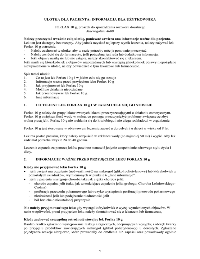 ULOTKA DLA PACJENTA: INFORMACJA DLA UŻYTKOWNIKA FORLAX 10 g, proszek do sporządzania roztworu doustnego Macrogolum 4000 Należy przeczytać uważnie całą ulotkę, ponieważ zawiera ona informacje ważne dla pacjenta. Lek ten jest dostępny bez recepty. Aby jednak uzyskać najlepszy wynik leczenia, należy zażywać lek Forlax 10 g ostrożnie. Należy zachować tę ulotkę, aby w razie potrzeby móc ją ponownie przeczytać. Należy zwrócić się do farmaceuty, jeśli potrzebna jest rada lub dodatkowa informacja. Jeśli objawy nasilą się lub nie ustąpią, należy skontaktować się z lekarzem. Jeśli nasili się którykolwiek z objawów niepożądanych lub wystąpią jakiekolwiek objawy niepożądane niewymienione w ulotce, należy powiedzieć o tym lekarzowi lub farmaceucie. Spis treści ulotki: 1. Co to jest lek Forlax 10 g i w jakim celu się go stosuje 2. Informacje ważne przed przyjęciem leku Forlax 10 g 3. Jak przyjmować lek Forlax 10 g 4. Możliwe działania niepożądane 5. Jak przechowywać lek Forlax 10 g 6. Inne informacje 1. CO TO JEST LEK FORLAX 10 g I W JAKIM CELU SIĘ GO STOSUJE Forlax 10 g należy do grupy leków zwanych lekami przeczyszczającymi o działaniu osmotycznym. Forlax 10 g zwiększa ilość wody w stolcu, co pomaga przezwyciężyć problemy związane ze zbyt wolną pracą jelit. Forlax 10 g nie wchłania się do krwiobiegu i nie ulega rozkładowi w organizmie. Forlax 10 g jest stosowany w objawowym leczeniu zaparć u dorosłych i u dzieci w wieku od 8 lat. Lek ma postać proszku, który należy rozpuścić w szklance wody (co najmniej 50 ml) i wypić. Aby lek zadziałał potrzeba zwykle 24 do 48 godzin. Leczenie zaparcia za pomocą leków powinno stanowić jedynie uzupełnienie zdrowego stylu życia i diety. 2. INFORMACJE WAŻNE PRZED PRZYJĘCIEM LEKU FORLAX 10 g Kiedy nie przyjmować leku Forlax 10 g • jeśli pacjent ma uczulenie (nadwrażliwość) na makrogol (glikol polietylenowy) lub którykolwiek z pozostałych składników, wymienionych w punkcie 6 „Inne informacje”. • jeśli u pacjenta występuje choroba taka jak ciężka choroba jelit: - choroba zapalna jelit (taka, jak wrzodziejące zapalenie jelita grubego, Choroba LeśniowskiegoCrohna) - perforacja przewodu pokarmowego lub ryzyko wystąpienia perforacji przewodu pokarmowego - niedrożność jelit lub podejrzenie niedrożności jelit - ból brzucha o nieustalonej przyczynie Nie należy przyjmować tego leku gdy wystąpi którykolwiek z wyżej wymienionych objawów. W razie wątpliwości, przed przyjęciem leku należy skontaktować się z lekarzem lub farmaceutą. Kiedy zachować szczególną ostrożność stosując lek Forlax 10 g Bardzo rzadko zgłaszano występowanie reakcji alergicznych, obejmujących wysypkę i obrzęk twarzy po przyjęciu produktów zawierających makrogol (glikol polietylenowy) u dorosłych. Zgłaszano pojedyncze reakcje alergiczne, które prowadziły do omdlenia lub zapaści oraz powodowały ogólnie 1 złe samopoczucie. W przypadku wystąpienia takich objawów należy zaprzestać przyjmowania leku Forlax 10 g i niezwłocznie zwrócić się do lekarza. Ponieważ lek ten może czasami powodować biegunkę, przed jego przyjęciem należy skonsultować się z lekarzem lub farmaceutą w przypadku: • upośledzonej funkcji wątroby lub nerek, • przyjmowania diuretyków (leków moczopędnych) lub w przypadku osób w podeszłym wieku, ponieważ może u nich wystąpić zwiększone ryzyko niskiego stężenia sodu (soli) lub potasu we krwi. Przyjmowanie innych leków Należy powiedzieć lekarzowi lub farmaceucie o wszystkich przyjmowanych aktualnie lub ostatnio lekach, również tych, które wydawane są bez recepty. Ciąża i karmienie piersią Forlax może być stosowany w okresie ciąży i karmienia piersią. Jeśli pacjentka jest w ciąży, stara się zajść w ciążę lub karmi piersią, należy poradzić się lekarza lub farmaceuty przed zastosowaniem jakiegokolwiek leku. Ważne informacje o niektórych składnikach leku Forlax 10 g W przypadku stwierdzenia nietolerancji niektórych cukrów (sorbitol) przed przyjęciem tego leku należy skonsultować się z lekarzem. Lek ten zawiera niewielkie ilości cukru zwanego sorbitolem, który jest przekształcany do fruktozy. Z powodu zawartości dwutlenku siarki Forlax 10 g może rzadko powodować ciężkie reakcje nadwrażliwości i skurcz oskrzeli. Forlax 10 g może być jednak stosowany u osób z cukrzycą lub będących na diecie bezgalaktozowej. 3. JAK PRZYJMOWAĆ LEK FORLAX 10 g Forlax 10 g należy zawsze przyjmować zgodnie z zaleceniami lekarza lub zgodnie z tą ulotką. W razie wątpliwości należy skontaktować się z lekarzem lub farmaceutą. Dorośli i dzieci powyżej 8 lat Przeciętna dawka to jedna - dwie saszetki na dobę, przyjmowane najlepiej w postaci jednej dawki rano. Dawka dobowa zależy od uzyskanego efektu i wynosi od jednej saszetki co drugi dzień (szczególnie u dzieci) do maksymalnie dwóch saszetek na dobę. Zawartość saszetki należy rozpuścić w szklance wody (co najmniej 50 ml) bezpośrednio przed spożyciem, następnie wypić przygotowany roztwór. Uwaga: • Działanie leku Forlax 10 g pojawia się w ciągu 24-48 godzin po podaniu. • U dzieci okres stosowania leku Forlax 10 g nie powinien przekraczać 3 miesięcy. • Poprawa perystaltyki uzyskana po stosowaniu leku Forlax 10 g może być utrzymana pod warunkiem przestrzegania zdrowego trybu życia oraz zaleceń dietetycznych. • Należy poinformować lekarza lub farmaceutę, gdy dojdzie do nasilenia objawów lub w przypadku braku poprawy. 2 Przyjęcie większej niż zalecana dawki leku Forlax 10 g Przyjęcie zbyt dużej dawki leku Forlax 10 g może spowodować biegunkę, która zwykle ustępuje po odstawieniu leku lub zmniejszeniu jego dawki. W przypadku ciężkiej biegunki lub wymiotów należy jak najszybciej skontaktować się z lekarzem, gdyż konieczne może być leczenie zapobiegające utracie soli (elektrolitów), towa