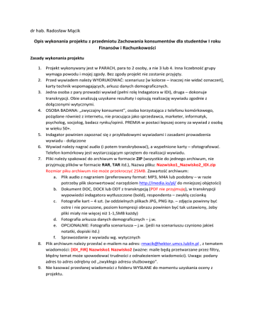 dr hab. Radosław Mącik Opis wykonania projektu z przedmiotu Zachowania konsumentów dla studentów I roku Finansów i Rachunkowości Zasady wykonania projektu 1. Projekt wykonywany jest w PARACH, para to 2 osoby, a nie 3 lub 4. Inna liczebność grupy wymaga powodu i mojej zgody. Bez zgody projekt nie zostanie przyjęty. 2. Przed wywiadem należy WYDRUKOWAĆ: scenariusz [w kolorze – inaczej nie widać oznaczeń], karty technik wspomagających, arkusz danych demograficznych. 3. Jedna osoba z pary prowadzi wywiad (pełni rolę Indagatora w IDI), druga – dokonuje transkrypcji. Obie analizują uzyskane rezultaty i opisują realizację wywiadu zgodnie z dołączonymi wytycznymi. 4. OSOBA BADANA: „zwyczajny konsument”, osoba korzystająca z telefonu komórkowego, pożądane również z internetu, nie pracująca jako sprzedawca, marketer, informatyk, psycholog, socjolog, badacz rynku/opinii. PREMIA w postaci lepszej oceny za wywiad z osobą w wieku 50+. 5. Indagator powinien zapoznać się z przykładowymi wywiadami i zasadami prowadzenia wywiadu - dołączone 6. Wywiad należy nagrać audio (i potem transkrybować), a wypełnione karty – sfotografować. Telefon komórkowy jest wystarczającym sprzętem do realizacji wywiadu. 7. Pliki należy spakować do archiwum w formacie ZIP (wszystkie do jednego archiwum, nie przyjmuję plików w formacie RAR, TAR itd.), Nazwa pliku: Nazwisko1_Nazwisko2_IDI.zip Rozmiar piku archiwum nie może przekroczyć 25MB. Zawartość archiwum: a. Plik audio z nagraniem (preferowany format: MP3, M4A lub podobny – w razie potrzeby plik skonwertować narzędziem http://media.io/pl/ do mniejszej objętości) b. Dokument DOC, DOCX lub ODT z transkrypcją (PDF nie przyjmuję), w transkrypcji wypowiedzi indagatora wytłuszczone (bold), respondenta – zwykłą czcionką c. Fotografie kart – 4 szt. (w oddzielnych plikach JPG, PNG itp. – zdjęcia powinny być ostre i nie poruszone, poziom kompresji obrazu powinien być tak ustawiony, żeby pliki miały nie więcej niż 1-1,5MB każdy) d. Fotografia arkusza danych demograficznych – j.w. e. OPCJONALNIE: Fotografia scenariusza – j.w. (jeśli na scenariuszu czyniono jakieś notatki, dopiski itd.) f. Sprawozdanie z wywiadu wg. wytycznych 8. Plik archiwum należy przesłać e-mailem na adres: [email protected] , z tematem wiadomości: [IDI_FIR] Nazwisko1 Nazwisko2 (ważne: maile będą przetwarzane przez filtry, błędny temat może spowodować trudności z odnalezieniem wiadomości). Uwaga: podany adres to adres odrębny od „zwykłego adresu służbowego”. 9. Nie kasować przesłanej wiadomości z folderu WYSŁANE do momentu uzyskania oceny z projektu. Zasady prowadzenia wywiadu przez indagatora (skrót): Zachowanie w pełni neutralne wobec respondenta i jego reakcji. Nie prezentowanie własnego stosunku do badanej tematyki. Należy sprawiać wrażenie osoby zaciekawionej każdą wypowiedzią i reakcją (ale naturalnie, a nie teatralnie). Używać komunikatywnego i dostosowanego do badanego języka, jeśli badany czegoś nie rozumie, podjąć próbę wyjaśnienia pojęcia. Nie odczytywanie dosłowne pytań ze scenariusza bez potrzeby, pomijanie pytań na które odpowiedź padła spontanicznie PRZED ich zadaniem, bo wynikało to z kontekstu. Stawianie pytań otwartych, posługiwanie się dodatkowymi pytaniami (niebieskie w scenariuszu) wtedy kiedy potrzeba, nie mechanicznie. Kontrolowanie czasu wywiadu by zrealizować cały scenariusz Zasady sporządzenia transkrypcji: wypowiedzi indagatora wytłuszczone (bold), respondenta – zwykłą czcionką, każda wypowiedź – odrębny akapit fragmenty nieczytelne oznaczone […] reakcje emocjonalne typu śmiech oznaczone [śmiech] itd. wstawianie w tekst transkrypcji znaczników czasu w formacie [mm:ss], np. [05:00], co 5 minut a także na początku i końcu realizacji technik wspomagających – sygnalizacja, że nie było rozmowy pomiędzy znacznikami gotową transkrypcję czyta indagator słuchając jednocześnie nagrania – wyłapane błędy i nieścisłości należy poprawić Sprawozdanie z wywiadu MUSI zawierać: oznaczenie ról w grupie, data i godzina rozpoczęcia wywiadu czas trwania wywiadu informację o badanym – przepisaną z arkusza danych demograficznych – dołączony wzór do użycia wnioski co do (ok. 2-3 stron łącznie): o zaobserwowanych charakterystycznych cech zachowań zakupowych badanego o najciekawszych wypowiedzi, faktów i opinii badanego – rzeczy, których nie spodziewaliście się usłyszeć – kilka cytatów z transkrypcji o stereotypowych opinii i zachowań badanego – j.w. o samooceny wykonania zadania przez grupę o wyłapanych EX-POST popełnionych błędach w trakcie realizacji projektu Początek sprawozdania wg wzoru na następnej stronie: Sprawozdanie z mini IDI Indagator __________________________________ Transkrybent __________________________________ Data i godzina wywiadu _____________________ Czas trwania wywiadu _____________________ Respondent: wiek __________ lat płeć K / M