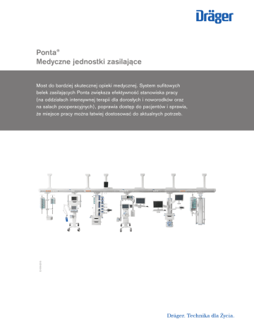 Ponta® Medyczne jednostki zasilające Most do bardziej skutecznej opieki medycznej. System sufitowych belek zasilających Ponta zwiększa efektywność stanowiska pracy (na oddziałach intensywnej terapii dla dorosłych i noworodków oraz na salach pooperacyjnych), poprawia dostęp do pacjentów i sprawia, że miejsce pracy można łatwiej dostosować do aktualnych potrzeb. 02 | Ponta® Zalety System sufitowych belek zasilających Dräger Ponta Wszechstronny system Ponta oferuje cztery długości belek oraz różne warianty konfiguracji kolumn i głowic zasilających, jak również możliwość wyposażenia w inne komponenty stanowiska pracy. Szeroki zakres opcji umożliwia na bardziej efektywne pozycjonowanie sprzętu i urządzeń medycznych w miejscu pracy. Większa wszechstronność iSystem sufitowych belek zasilających Ponta został zaprojektowany w celu zwiększenia efektywności opieki medycznej, na wiele sposobów. Poprzez podniesienie urządzeń oraz wyposażenia z podłogi i umieszczenia ich dokładnie tam, gdzie są potrzebne, firma Dräger umożliwia łatwiejszy dostęp do pacjenta i lepszą ergonomię środowiska pracy, wyższy stopień higieny na oddziale, jak również możliwość szybszego czyszczenia i przygotowania stanowiska. Zintegrowane oświetlenie gwarantuje pacjentom oraz personelowi większy komfort i bezpieczeństwo. Kompleksowy system oświetlenia obejmuje oświetlenie pośrednie, alternatywnie dostępne jest również oświetlenie RGB lub biodynamicze (CIS). Uzupełnieniem systemu jest o oświetlenie umożliwiające wygodne czytanie i prowadzenie badań, jak również oświetlenie nawigacyjne i oświetlenie wnętrza szuflady, co pozwala personelowi na pracę w nocy, bez przerywania snu pacjenta. Systemy Ponta C, E Plus i S Plus pozwalają w kilka minut całkowicie przekonfigurować dowolny obszar opieki, zgodnie z wymaganą specyfikacją. Dopasowanie do Twoich wymagań Systemy Ponta dostępne są w długościach 2200, 2800, 3100 i 3500 mm i mogą być bezpośrednio ze sobą łączone w celu optymalnego wykorzystania przestrzeni. Szerokie możliwości konfiguracyjne, takie jak na przykład wybór różnych wózków przesuwnych, głowic zasilających oraz kolumn, umożliwiają optymalne zaprojektowanie stanowisk roboczych. Ponta C Ponta C została zaprojektowana w celu maksymalnego wykorzystania przestrzeni. Rury nośne oraz wózki przesuwne charakteryzują się smukłymi kształtami. Urządzenia medyczne mogą być pozycjonowane w dowolnym miejscu wzdłuż belki, a maksymalna nośność wynosi 150 kg. Przyłącza gazowe, elektryczne i teleinformatyczne umieszczone są w belce zasilającej. Ponta E Plus Ponta E Plus zapewnia wygodne, ergonomiczne rozmieszczenie przyłączy gazowych, elektrycznych i teleinformatycznych w kolumnie lub głowicy zasilającej, co umożliwia komfortową wymianę sprzętu i oszczędza cenny czas podczas transportu lub w sytuacjach krytycznych. Dodatkowe przyłącza mogą być umieszczone w belce. Nośność systemu wynosi 120 kg, a pneumatyczny hamulec zapobiega przypadkowemu przemieszczeniu. Ruchom obrotowym głowicy lub kolumny zapobiega hamulec cierny (wyposażenie standardowe). Opcjonalnie może on być zastąpiony hamulcem pneumatycznym. Ponta® | 03 Zalety Ponta S Plus Dzięki wyposażeniu w ramię obrotowe, Ponta S Plus zapewnia największą elastyczność pozycjonowania, co pozwala na umieszczenie stanowiska roboczego w dowolnym miejscu przy łóżku pacjenta. Maksymalna nośność systemu wynosi 100 kg. Zarówno wózek przesuwny, jak i ramię obrotowe, wyposażone są w hamulec pneumatyczny. Przypadkowy obrót głowicy lub kolumny uniemożliwia hamulec cierny (jako opcja dostępny jest również hamulec pneumatyczny). Przyłącza gazowe, elektryczne i teleinformatyczne zostały dogodnie rozmieszczone. W razie potrzeby w belce można dodatkowo umieścić inne przyłącza. Ekonomiczna instalacja Zminimalizowana ilość elementów montażowych pozwala na szybką i łatwą instalację systemu Ponta. Możliwość zmiany położenia rur dystansujących eliminuje koszty związane z przeniesieniem lub modyfikacją już istniejących instalacji. System Ponta umożliwia również wykorzystanie przestrzeni sufitowej na montaż innych urządzeń, np. podnośników dla pacjentów lub systemów audio-informacyjnych. Zastosowanie kompatybilnych mocowań dla akcesoriów umożliwia łatwe dostosowanie do zmieniających się wymagań stanowiska pracy. Komponenty systemu Noise Display SoundEar® D-1322-2011 Urządzenie monitoruje i prezentuje na wyświetlaczu poziom hałasu na oddziale, przyczyniając się do zapewnienia komfortowego, zdrowego i ułatwiającego powrót do zdrowia środowiska dla pacjentów, personelu oraz osób odwiedzających.1 04 | Ponta® Komponenty systemu Opcje oświetlenia D-1402-2011 Polepsz atmosferę na oddziale intensywnej terapii, z korzyścią dla pacjentów, personelu i osób odwiedzających, poprzez wybór opcji oświetlenia dla sufitowych jednostek zasilających. System mocujący firmy Dräger D-24111-2015 Estetycznie zaprojektowany i elastyczny system mocujący firmy Dräger umożliwia ergonomiczne pozycjonowanie na oddziałach ratunkowych, salach operacyjnych, oddziałach intensywnej terapii oraz innych obszarach opieki medycznej. Idealny do stosowania z monitorami LCD, może być również używany z innymi urządzeniami medycznymi. Wózek Dräger Mova® Cart 2.0 D-2536-2011 Dzięki wózkowi Mova® Cart możesz stworzyć elastyczne, mobilne i bezpieczne stanowisko pracy. Zoptymalizuj przepływ pracy i zmniejsz obciążenie personelu na sali operacyjnej oraz oddziale intensywnej terapii wykorzystując wydajny i wysoce mobilny system transportu oraz dokowania wyposażenia. Ponta® | 05 Powiązane produkty Ścienna jednostka zasilająca Gemina®DUO D-31490-2011 Niezależnie od tego, czy chcesz wyposażyć oddział ratunkowy, intensywnej terapii, opieki pośredniej lub salę pooperacyjną, system mocowanych na ś