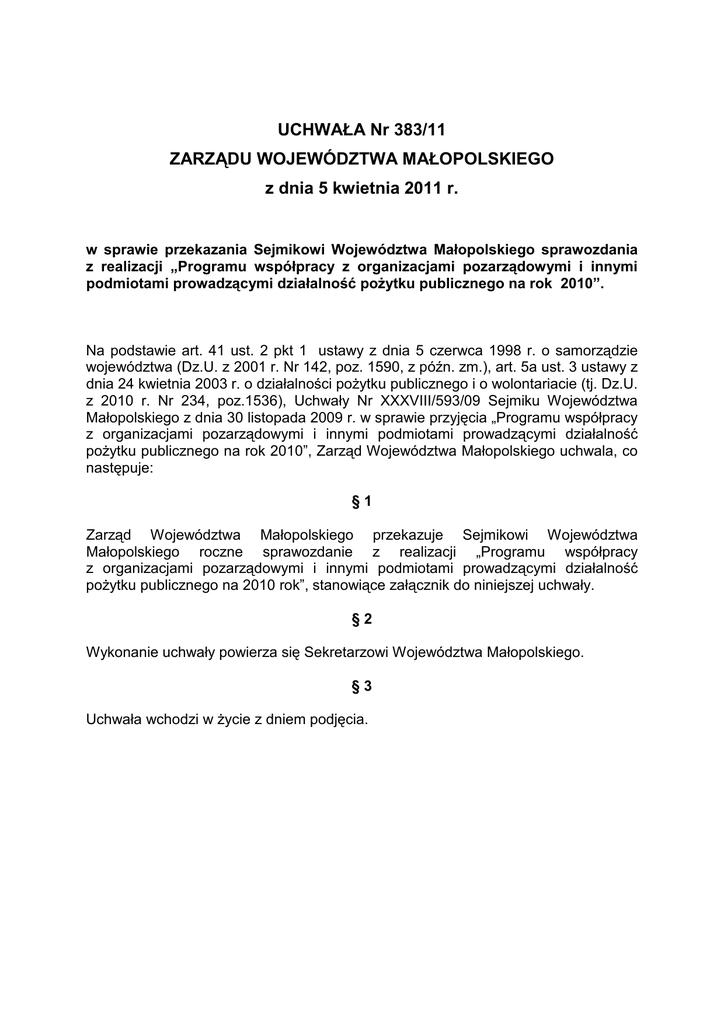 UCHWAŁA Nr 383/11 ZARZĄDU WOJEWÓDZTWA MAŁOPOLSKIEGO z dnia 5 kwietnia 2011 r. w sprawie przekazania Sejmikowi Województwa Małopolskiego sprawozdania z realizacji „Programu współpracy z organizacjami pozarządowymi i innymi podmiotami prowadzącymi działalność poŜytku publicznego na rok 2010”. Na podstawie art. 41 ust. 2 pkt 1 ustawy z dnia 5 czerwca 1998 r. o samorządzie województwa (Dz.U. z 2001 r. Nr 142, poz. 1590, z późn. zm.), art. 5a ust. 3 ustawy z dnia 24 kwietnia 2003 r. o działalności poŜytku publicznego i o wolontariacie (tj. Dz.U. z 2010 r. Nr 234, poz.1536), Uchwały Nr XXXVIII/593/09 Sejmiku Województwa Małopolskiego z dnia 30 listopada 2009 r. w sprawie przyjęcia „Programu współpracy z organizacjami pozarządowymi i innymi podmiotami prowadzącymi działalność poŜytku publicznego na rok 2010”, Zarząd Województwa Małopolskiego uchwala, co następuje: §1 Zarząd Województwa Małopolskiego przekazuje Sejmikowi Województwa Małopolskiego roczne sprawozdanie z realizacji „Programu współpracy z organizacjami pozarządowymi i innymi podmiotami prowadzącymi działalność poŜytku publicznego na 2010 rok”, stanowiące załącznik do niniejszej uchwały. §2 Wykonanie uchwały powierza się Sekretarzowi Województwa Małopolskiego. §3 Uchwała wchodzi w Ŝycie z dniem podjęcia. UZASADNIENIE Ustawa z dnia 24 kwietnia 2003 r. o działalności poŜytku publicznego i o wolontariacie (tj. Dz.U. z 2010 r. Nr 234, poz.1536) nałoŜyła w art. 5a ust. 3 na organ wykonawczy jednostki samorządu terytorialnego obowiązek przedłoŜenia, nie później niŜ do dnia 30 kwietnia kaŜdego roku, organowi stanowiącemu jednostki samorządu terytorialnego sprawozdania z realizacji programu współpracy z organizacjami pozarządowymi i innymi podmiotami prowadzącymi działalność poŜytku publicznego za rok poprzedni. Przygotowane sprawozdanie z realizacji Programu współpracy na 2010 rok stanowi wykonanie obowiązku wyraŜonego w art. 5a ust. 3 cyt. wyŜej ustawy. Załącznik do Uchwały Nr 383/11 Zarządu Województwa Małopolskiego z dnia 5 kwietnia 2011 r. Sprawozdanie z realizacji Programu współpracy z organizacjami pozarządowymi i innymi podmiotami prowadzącymi działalność poŜytku publicznego w 2010 roku. Rozdział I. Wprowadzenie. Rozdział II. Cel główny i cele szczegółowe programu. Rozdział III. Zasady współpracy. Rozdział IV. Zakres podmiotowy programu. Rozdział V. Zakres przedmiotowy. Cel 1. Rozwój dialogu obywatelskiego w Małopolsce Działanie 1. Działalność regionalnej i lokalnych rad poŜytku publicznego. Działanie 2. Udział organizacji pozarządowych w pracach branŜowych zespołów opiniująco-doradczych powoływanych z inicjatywy Samorządu Województwa. Cel 2. Wzmocnienie sektora pozarządowego w Małopolsce. Działanie 1: Rozwój zaplecza instytucjonalnego i osobowego organizacji pozarządowych. Działanie 2. Wzmacnianie wizerunku organizacji pozarządowych. Działanie 3. Rozwój wolontariatu w Małopolsce. Cel 3. Zwiększenie udziału organizacji pozarządowych i innych podmiotów prowadzących działalność poŜytku publicznego w realizację zadań publicznych. Działanie1. Przekazywanie organizacjom pozarządowym i innym podmiotom realizacji zadań własnych Województwa Małopolskiego w trybie otwartego konkursu ofert. Działanie 2. Realizacja przez organizacje pozarządowe zadań publicznych finansowanych ze środków funduszy celowych oraz funduszy europejskich. 1. Zadania realizowane ze środków PFRON będących w dyspozycji Województwa Małopolskiego zgodnie z art. 35 ustawy z dnia 27 sierpnia 1997 r. o rehabilitacji zawodowej i społecznej oraz zatrudnianiu osób niepełnosprawnych (Dz.U. z 2008r. Nr 14 poz. 92 j.t z późn zmianami), 2. Wykorzystanie Europejskiego Funduszu Społecznego przez organizacje pozarządowe. 3. Realizacja Programu INTERREG IVC. Działanie 3. Projekty partnerskie Samorządu Województwa Małopolskiego i organizacji pozarządowych. Cel 4. Wsparcie dla działań prowadzonych przez administrację samorządową w Małopolsce związanych ze współpracą z sektorem pozarządowym poprzez upowszechnianie dobrych praktyk, wzajemną wymianę doświadczeń, promocję partnerstw publiczno-społecznych. Rozdział VI. Formy współpracy Rozdział VII. Priorytetowe zadania w 2010 roku. Rozdział VIII. Okres realizacji programu. Rozdział IX. Finansowanie programu. Rozdział X. Postanowienia końcowe. Rozdział I. Wprowadzenie. Sejmik Województwa Małopolskiego Uchwałą Nr XXXVIII/593/09 z dnia 30 listopada 2009 r. przyjął „Program współpracy z organizacjami pozarządowymi i innymi podmiotami prowadzącymi działalność poŜytku publicznego na rok 2010”. Program to dokument wyznaczający politykę Województwa wobec organizacji pozarządowych w 2010 roku, a zarazem odpowiedź na istotne fragmenty Strategii Rozwoju Województwa Małopolskiego na lata 2007-2013. Współpraca Samorządu Województwa Małopolskiego z organizacjami pozarządowymi realizowana na podstawie corocznego Programu Współpracy to trwałe wkomponowanie organizacji pozarządowych w strukturę działań samorządu województwa i przykład dobrej praktyki współpracy, polegającej nie tylko na przekazywaniu przez samorząd województwa środków finansowych, lecz przede wszystkim na partnerskiej wymianie doświadczeń i dąŜeniu do rozwoju Małopolski. Rozdział II. Cel główny i cele szczegółowe programu. Cel główny Programu: Głównym celem Programu było zwiększenie udziału organizacji pozarządowych i innych podmiotów prowadzących działalność poŜytku publicznego w realizację zapisów Strategii Rozwoju Województwa Małopolskiego na lata 2007-2013. Cel główny Programu realizowany był poprzez następujące cele szczegółowe: Cele szczegółowe: 1. Rozwój dialogu obywatelskiego w Małopolsce. 2. Wzmocnienie sektora pozarządowego w Małopolsce. 3. Zwiększenie udziału organizacji po