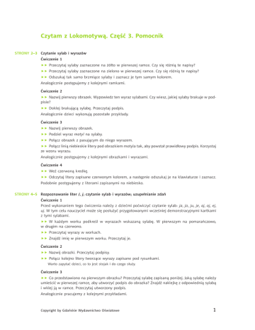 Czytam z Lokomotywą. Część 3. Pomocnik STRONY 2–3 Czytanie sylab i wyrazów Ćwiczenie 1 „„ Przeczytaj sylaby zaznaczone na żółto w pierwszej ramce. Czy się różnią te napisy? „„ Przeczytaj sylaby zaznaczone na zielono w pierwszej ramce. Czy się różnią te napisy? „„ Odszukaj tak samo brzmiące sylaby i zaznacz je tym samym kolorem. Analogicznie postępujemy z kolejnymi ramkami. Ćwiczenie 2 „„ Nazwij pierwszy obrazek. Wypowiedz ten wyraz sylabami. Czy wiesz, jakiej sylaby brakuje w podpisie? „„ Doklej brakującą sylabę. Przeczytaj podpis. Analogicznie dzieci wykonują pozostałe przykłady. Ćwiczenie 3 „„ Nazwij pierwszy obrazek. „„ Podziel wyraz motyl na sylaby. „„ Połącz obrazek z pasującym do niego wyrazem. „„ Połącz linią niebieskie litery pod obrazkiem motyla tak, aby powstał prawidłowy podpis. Korzystaj ze wzoru wyrazu. Analogicznie postępujemy z kolejnymi obrazkami i wyrazami. Ćwiczenie 4 „„ Weź czerwoną kredkę. „„ Odczytaj litery zapisane czerwonym kolorem, a następnie odszukaj je na klawiaturze i zaznacz. Podobnie postępujemy z literami zapisanymi na niebiesko. STRONY 4–5 Rozpoznawanie liter J, j; czytanie sylab i wyrazów; uzupełnianie zdań Ćwiczenie 1 Przed wykonaniem tego ćwiczenia należy z dziećmi poćwiczyć czytanie sylab: ja, jo, ju, je, aj, oj, ej, uj. W tym celu nauczyciel może się posłużyć przygotowanymi wcześniej demonstracyjnymi kartkami z tymi sylabami. „„ W każdym worku podkreśl w wyrazach wskazaną sylabę. W pierwszym na pomarańczowo, w drugim na czerwono. „„ Przeczytaj wyrazy w workach. „„ Znajdź imię w pierwszym worku. Przeczytaj je. Ćwiczenie 2 „„ Nazwij obrazki. Przeczytaj podpisy. „„ Połącz kolejno litery tworzące wyrazy zapisane pod rysunkami. Warto zapytać dzieci, co to jest stojak i do czego służy. Ćwiczenie 3 „„ Co przedstawiono na pierwszym obrazku? Przeczytaj sylabę zapisaną poniżej. Jaką sylabę należy umieścić w pierwszej ramce, aby utworzyć podpis do obrazka? Znajdź naklejkę z odpowiednią sylabą i wklej ją w ramce. Przeczytaj utworzony podpis. Analogicznie pracujemy z kolejnymi przykładami. Copyright by Gdańskie Wydawnictwo Oświatowe 1 Czytam z Lokomotywą. Część 3. Pomocnik Dla 6-latków i nie tylko Ćwiczenie 4 „„ Opowiedz, co widzisz na fotografiach. Co robi dziewczynka, a co robi chłopiec? „„ Wytnij wyrazy z marginesu. Odszukaj i przeczytaj imiona (zapisane są wielką literą). Wklej do pierwszej ramki imię dziewczynki [Julka], a do drugiej imię chłopca. [Julek] „„ Co je Julka? [jajko] Doklej odpowiedni wyraz. „„ Co je Julek? [tost] Naklej wyraz tost w odpowiednim miejscu. „„ Przeczytaj uzupełnione zdania. STRONY 6–7 Czytanie wyrazów i zdań Ćwiczenie 1 „„ Przeczytaj kolejne wyrazy w pierwszej chmurce. Podkreśl sylabę, która się powtarza. Przeczytaj jeszcze raz te wyrazy sylabami. „„ Który wyraz ma najwięcej sylab? Analogicznie pracujemy z drugim przykładem. Ćwiczenie 2 „„ Nazwij przedmioty przedstawione na fotografiach. „„ Przeczytaj wyraz otoczony pętlą w tabelce. „„ Odszukaj w kolejnych wierszach tabelki wyrazy pasujące do pozostałych obrazków, otocz je pętlami. „„ Przeczytaj wszystkie zaznaczone wyrazy. Ćwiczenie 3 „„ Przeczytaj sylaby. Połącz pasujące do siebie puzzle. „„ Pokoloruj tym samym kolorem pasujące do siebie elementy. „„ Przeczytaj powstałe imiona. Ćwiczenie 4 „„ Przyjrzyj się fotografiom. Opowiedz, jaką sytuację i kogo przedstawia każda z nich. „„ Podkreśl w zdaniach pod fotografiami imiona dzieci (te same występowały w ćwiczeniu powyżej). „„ Przeczytaj zdania pod fotografiami. STRONY 8–10 Rozpoznawanie liter W, w; czytanie sylab i wyrazów Ćwiczenie 1 „„ Zaznacz pętlami wielkie „W” i małe „w”. Polecenia dodatkowe „„ Policz, ile liter zaznaczyłeś. Spróbuj przeczytać wyrazy. Ćwiczenie 2 „„ Popatrz na pierwszy obrazek i podpis. Przeczytaj ten podpis. „„ Odszukaj pierwszą literę, a później następne. Połącz litery, aby utworzyły podpis do obrazka. Przeczytaj utworzony wyraz. Analogicznie pracujemy z pozostałymi przykładami. Ćwiczenie 3 „„ Co przedstawiono na fotografiach? „„ Przeczytaj sylaby z literą „w” pod fotografiami. Dopasuj sylaby z naklejek i przeczytaj utworzone wyrazy. Copyright by Gdańskie Wydawnictwo Oświatowe 2 Czytam z Lokomotywą. Część 3. Pomocnik Dla 6-latków i nie tylko Polecenia dodatkowe „„ Gdzie można zobaczyć mewy? Czy widziałeś kiedyś te ptaki? Ćwiczenie 4 „„ Wytnij starannie elementy. Ustaw je we właściwej kolejności. Przeczytaj ułożony wyraz. „„ Wycięte elementy odwróć na drugą stronę i ułóż nowy obrazek. Przeczytaj utworzony wyraz. Polecenie dodatkowe Dzieci mogą nakleić na kartkę elementy z dowolnej strony i dorysować do obrazka dodatkowe elementy według własnego pomysłu, aby powstała większa ilustracja. Ćwiczenie 5 „„ Popatrz na wyrazy w niebieskiej pętli. Przeczytaj wyrazy podkreślone linią falistą. Teraz przeczytaj te wyrazy, które podkreślono linią prostą. Co zauważyłeś? „„ Znajdź w drugiej pętli wyrazy, które się rymują, i podkreśl je w taki sam sposób. Przeczytaj pary wyrazów, które się rymują. Ćwiczenie 6 „„ Przeczytaj sylaby w ramkach, wyklaszcz je. Wyrazy zapisane sylabami zastąp fotografiami z naklejek. Przeczytaj podpisy do obrazków. STRONY 11–12 Czytanie wyrazów „„ Przeczytaj pierwszy wyraz. Dlaczego obok zaznaczono pętlą kubek? „„ Otocz pętlą wybrane znaki przy kolejnych wyrazach. Z następną wycinanką (ćwiczeniami na żółtym i zielonym tle) pracujemy analogicznie jak z wycinanką ze s. 23 z ćwiczeń Czytam. Część 2. STRONA 13 Czytanie wyrazów i zdań Ćwiczenie 1 „„ Zaznacz kolorową kredką sylaby z literą „w”. Przeczytaj sylaby, które zaznaczyłeś. Przeczytaj całe 