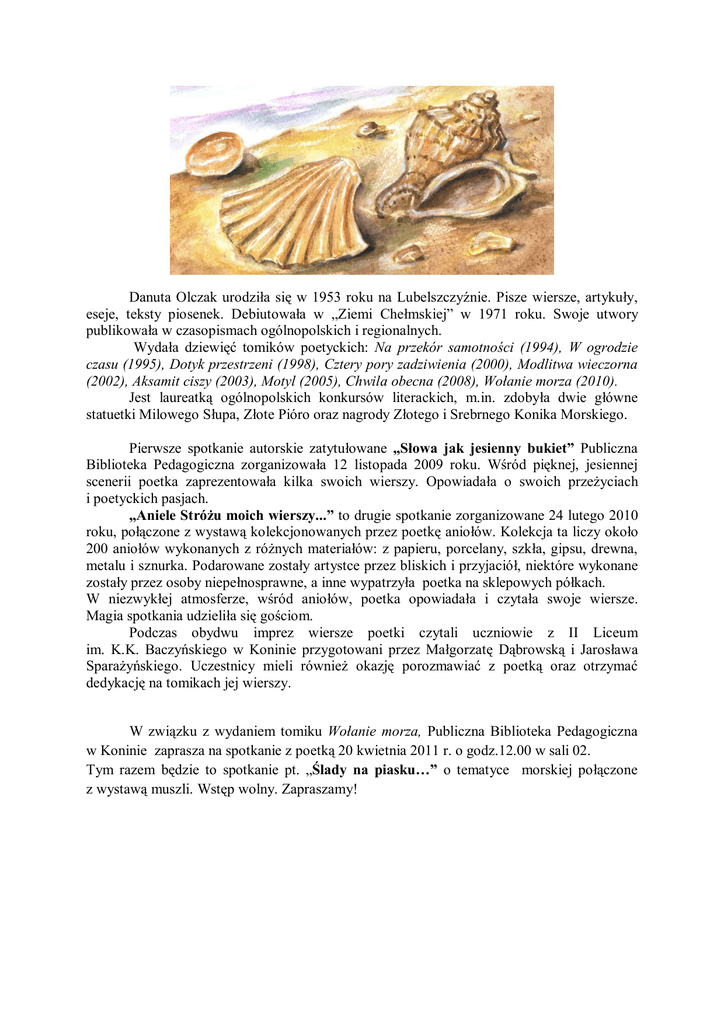 Danuta Olczak urodziła się w 1953 roku na Lubelszczyźnie. Pisze wiersze, artykuły, eseje, teksty piosenek. Debiutowała w „Ziemi Chełmskiej” w 1971 roku. Swoje utwory publikowała w czasopismach ogólnopolskich i regionalnych. Wydała dziewięć tomików poetyckich: Na przekór samotności (1994), W ogrodzie czasu (1995), Dotyk przestrzeni (1998), Cztery pory zadziwienia (2000), Modlitwa wieczorna (2002), Aksamit ciszy (2003), Motyl (2005), Chwila obecna (2008), Wołanie morza (2010). Jest laureatką ogólnopolskich konkursów literackich, m.in. zdobyła dwie główne statuetki Milowego Słupa, Złote Pióro oraz nagrody Złotego i Srebrnego Konika Morskiego. Pierwsze spotkanie autorskie zatytułowane „Słowa jak jesienny bukiet” Publiczna Biblioteka Pedagogiczna zorganizowała 12 listopada 2009 roku. Wśród pięknej, jesiennej scenerii poetka zaprezentowała kilka swoich wierszy. Opowiadała o swoich przeżyciach i poetyckich pasjach. „Aniele Stróżu moich wierszy...” to drugie spotkanie zorganizowane 24 lutego 2010 roku, połączone z wystawą kolekcjonowanych przez poetkę aniołów. Kolekcja ta liczy około 200 aniołów wykonanych z różnych materiałów: z papieru, porcelany, szkła, gipsu, drewna, metalu i sznurka. Podarowane zostały artystce przez bliskich i przyjaciół, niektóre wykonane zostały przez osoby niepełnosprawne, a inne wypatrzyła poetka na sklepowych półkach. W niezwykłej atmosferze, wśród aniołów, poetka opowiadała i czytała swoje wiersze. Magia spotkania udzieliła się gościom. Podczas obydwu imprez wiersze poetki czytali uczniowie z II Liceum im. K.K. Baczyńskiego w Koninie przygotowani przez Małgorzatę Dąbrowską i Jarosława Sparażyńskiego. Uczestnicy mieli również okazję porozmawiać z poetką oraz otrzymać dedykację na tomikach jej wierszy. W związku z wydaniem tomiku Wołanie morza, Publiczna Biblioteka Pedagogiczna w Koninie zaprasza na spotkanie z poetką 20 kwietnia 2011 r. o godz.12.00 w sali 02. Tym razem będzie to spotkanie pt. „Ślady na piasku…” o tematyce morskiej połączone z wystawą muszli. Wstęp wolny. Zapraszamy!