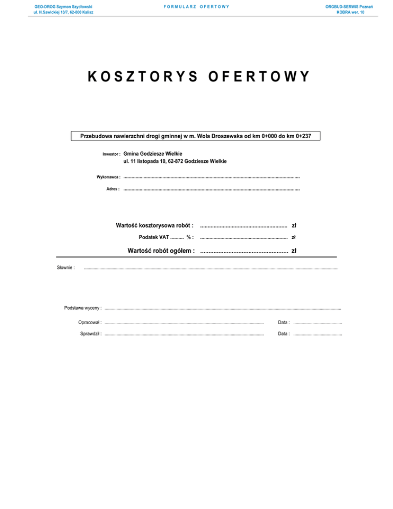 GEO-DROG Szymon Szydłowski ul. H.Sawickiej 13/7, 62-800 Kalisz FORMULARZ OFERTOWY ORGBUD-SERWIS Poznań KOBRA wer. 10 KOSZTORYS OFERTOWY Przebudowa nawierzchni drogi gminnej w m. Wola Droszewska od km 0+000 do km 0+237 Inwestor : Gmina Godziesze Wielkie ul. 11 listopada 10, 62-872 Godziesze Wielkie Wykonawca : ................................................................................................................................... Adres : ................................................................................................................................... Wartość kosztorysowa robót : .......................................................... zł Podatek VAT .......... % : ................................................................. zł Wartość robót ogółem : ..................................................... zł Słownie : ...................................................................................................................................................................................................................... Podstawa wyceny : ....................................................................................................................................................................................................... Opracował : ...................................................................................................................................... Data : ......................................... Sprawdził : ...................................................................................................................................... Data : ......................................... GEO-DROG Szymon Szydłowski ul. H.Sawickiej 13/7, 62-800 Kalisz TABELA ELEMENTÓW SCALONYCH ORGBUD-SERWIS Poznań KOBRA wer. 10 Przebudowa nawierzchni drogi gminnej w m. Wola Droszewska od km 0+000 do km 0+237 TABELA ELEMENTÓW SCALONYCH Lp. Opis pozycji tabeli Str: 1 Wartość [ zł ] 1 Roboty przygotowawcze .................................... 2 Podbudowa .................................... 3 Nawierzchnia .................................... 4 Pobocza .................................... 5 Ściek .................................... Razem : .................................... Wartość kosztorysowa robót : .................................... GEO-DROG Szymon Szydłowski ul. H.Sawickiej 13/7, 62-800 Kalisz KOSZTORYS OFERTOWY ORGBUD-SERWIS Poznań KOBRA wer. 10 Przebudowa nawierzchni drogi gminnej w m. Wola Droszewska od km 0+000 do km 0+237 KOSZTORYS OFERTOWY Str: 1 Lp. Podstawa kalkulacji / opis pozycji Ilość J.m. Cena jednostkowa Wartość [ zł ] 1 Roboty przygotowawcze 1 KNNR 001-0111-01-00 MRRiB 0,237 km Roboty pomiarowe przy liniowych robotach ziemnych (drogach), w terenie: równinnym .................................. ..................................... Numer specyfikacji : D.01.01.01 2 KNR 003-0101-01-00 ATHENASOFT Warszawa 3,500 m Roboty remontowe - cięcie piłą nawierzchni : bitumicznych,na głębokość do 4 cm .................................. ..................................... Numer specyfikacji : D.01.02.04 3 KNNR 006-0801-02-00 MRRiB 0,350 m2 Rozebranie podbudowy grubości 10 cm z kruszywa, wykonane mechanicznie .................................. ..................................... Numer specyfikacji : D.01.02.04 2 Podbudowa 4 KNNR 006-1301-01-00 MRRiB Mechaniczne profilowanie istniejącej podbudowy z kruszywa łamanego 832,740 m2 .................................. ..................................... 832,740 m2 .................................. ..................................... Numer specyfikacji : D.05.01.01a 5 KNNR 006-1301-02-00 MRRiB Mechaniczne zagęszcznie istniejącej podbudowy z kruszywa łamanego Numer specyfikacji : D.05.01.01a 6 KNNR 006-0113-04-00 MRRiB 832,740 m2 .................................. ..................................... Podbudowy z kruszywa łamanego stabilizowanego mechanicznie, przy grubości górnej warstwy po zagęszczeniu 5 cm Numer specyfikacji : D.04.04.02 3 Nawierzchnia 7 KNNR 006-1005-04-00 MRRiB Mechaniczne oczyszczenie nawierzchni nieulepszonej 832,740 m2 .................................. ..................................... 832,740 m2 .................................. ..................................... Numer specyfikacji : D.04.03.01 8 KNNR 006-1005-07-00 MRRiB Skropienie podbudowy emulsją asfaltową w ilości 0,7 kg/m2 Numer specyfikacji : D.04.03.01 9 KNNR 006-0309-02-00 MRRiB 832,740 m2 .................................. ..................................... Warstwa ścieralna nawierzchni, wykonana z mieszanek mineralno-bitumicznych asfaltowych AC 11 S 50/70 dla KR1-2, przy grubości warstwy po zagęszczeniu 4 cm Numer specyfikacji : D.05.03.05 4 Pobocza 10 KNNR 006-1301-05-00 MRRiB 195,880 m2 .................................. ..................................... Naprawy dróg gruntowych przez plantowanie poboczy wykonywane mechanicznie, przy grubości ścinania 5 cm Numer specyfikacji : D.06.03.02 11 KNNR 006-0204-05-00 MRRiB 195,880 m2 Nawierzchnie z kruszywa łamanego, przy grubości warstwy górnej po uwałowaniu 10 cm Numer specyfikacji : D.05.01.02 .................................. ..................................... GEO-DROG Szymon Szydłowski ul. H.Sawickiej 13/7, 62-800 Kalisz KOSZTORYS OFERTOWY ORGBUD-SERWIS Poznań KOBRA wer. 10 Przebudowa nawierzchni drogi gminnej w m. Wola Droszewska od km 0+000 do km 0+237 5. Ściek Str: 2 Lp. Podstawa kalkulacji / opis pozycji Ilość J.m. Cena jednostkowa Wartość [ zł ] 5 Ściek 12 KNR 231-0401-08-00 IGM Warszawa Rowki pod ławy pod ściek, o wymiarach: 40x20 cm - grunt kat.III-IV 84,000 m .................................. ..................................... Numer specyfikacji : D.08.05.01 13 KNR 231-0402-03-00 IGM Warszawa Ławy pod ściek: betonowe zwykłe z betonu C 8/10 5,040 m3 .................................. ..................................... Numer specyfikacji 