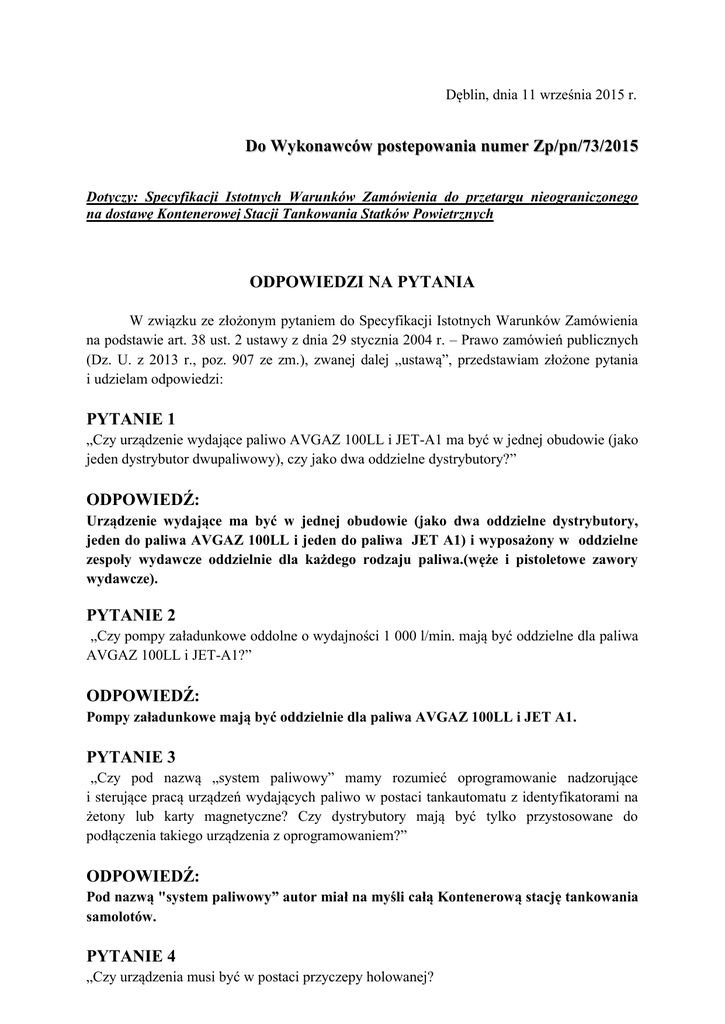 Dęblin, dnia 11 września 2015 r. Do Wykonawców postepowania numer Zp/pn/73/2015 Dotyczy: Specyfikacji Istotnych Warunków Zamówienia do przetargu nieograniczonego na dostawę Kontenerowej Stacji Tankowania Statków Powietrznych ODPOWIEDZI NA PYTANIA W związku ze złożonym pytaniem do Specyfikacji Istotnych Warunków Zamówienia na podstawie art. 38 ust. 2 ustawy z dnia 29 stycznia 2004 r. – Prawo zamówień publicznych (Dz. U. z 2013 r., poz. 907 ze zm.), zwanej dalej „ustawą”, przedstawiam złożone pytania i udzielam odpowiedzi: PYTANIE 1 „Czy urządzenie wydające paliwo AVGAZ 100LL i JET-A1 ma być w jednej obudowie (jako jeden dystrybutor dwupaliwowy), czy jako dwa oddzielne dystrybutory?” ODPOWIEDŹ: Urządzenie wydające ma być w jednej obudowie (jako dwa oddzielne dystrybutory, jeden do paliwa AVGAZ 100LL i jeden do paliwa JET A1) i wyposażony w oddzielne zespoły wydawcze oddzielnie dla każdego rodzaju paliwa.(węże i pistoletowe zawory wydawcze). PYTANIE 2 „Czy pompy załadunkowe oddolne o wydajności 1 000 l/min. mają być oddzielne dla paliwa AVGAZ 100LL i JET-A1?” ODPOWIEDŹ: Pompy załadunkowe mają być oddzielnie dla paliwa AVGAZ 100LL i JET A1. PYTANIE 3 „Czy pod nazwą „system paliwowy” mamy rozumieć oprogramowanie nadzorujące i sterujące pracą urządzeń wydających paliwo w postaci tankautomatu z identyfikatorami na żetony lub karty magnetyczne? Czy dystrybutory mają być tylko przystosowane do podłączenia takiego urządzenia z oprogramowaniem?” ODPOWIEDŹ: Pod nazwą "system paliwowy” autor miał na myśli całą Kontenerową stację tankowania samolotów. PYTANIE 4 „Czy urządzenia musi być w postaci przyczepy holowanej? Z nazwy wynika że ma to być „kontenerowa stacja tankowania statków powietrznych”, co z definicji nie może być zamontowane na przyczepie holowanej, do tego celu służą cysterny. Kontener w stanie napełnionym nie wolno przemieszczać. W Unii Europejskiej stosuję się takie urządzenia i są one zabudowane w kontenerach zamykanych 20 lub 40”, są to typowe kontenery z możliwością ich przenoszenia i przewożenia, ale tankowanie odbywa się po ich posadowieniu na miejscu użytkowania. Czy taka nazwa i wymagane przez Państwa spełnienie aktualnych norm i przepisów wzajemnie się nie wyklucza?” ODPOWIEDŹ: Zgodnie z zapisami SIWZ urządzenie ma być kontenerową stacją tankowania samolotów – mobilną. „Szczegółowy opis przedmiotu zamówienia” - pkt 1 ppkt d): „system paliwowy ma być wykonany w postaci przyczepy holowanej (do holowania ciągnikiem, holownikiem, pojazdem ciężarowym) przeznaczonej do wolnobieżnego przemieszczania na obszarze lotniska po drogach utwardzonych, nieutwardzonych oraz trawiastych, ponadto przyczepa powinna być wyposażona w: hamulec postojowy i pneumatyczny oraz układ hamowania podczas jazdy a w czasie postoju w podpory osi kół”. PYTANIE 5 „Zamawiający wymaga, aby maksymalny termin realizacji zamówienia był do 30.11.2015r. Uwzględniając bardzo specjalistyczny charakter sprzętu nie ma możliwości wyprodukowania go w tak krótkim terminie. Zwracamy się z prośbą o wydłużenie terminu realizacji do 120 dni od dnia podpisania umowy” ODPOWIEDŹ: Zamawiający nie wyraża zgody. PYTANIE 6 „Zamawiający określa termin składania ofert do dnia 15.09.2015r. Zapisy SIWZ budzą wątpliwości, co do możliwości wykonania zamówienia zgodnie z obowiązującymi przepisami. Wymagania SIWZ należy skonsultować z instytucjami zewnętrznymi określającymi techniczne warunki wykonania. Zwracamy się z prośbą o wydłużenie terminu składania ofert do dnia 30.09.2015r.” ODPOWIEDŹ: Zamawiający nie wyraża zgody. PYTANIE 7 „Zamawiający nazywa wyrób Kontenerowa Stacja Paliw Tankowania Statków Powietrznych przypisując mu cechy pojazdu (przyczepy). Kontenerowe Stacja Paliw oraz przyczepy do przewozu materiałów niebezpiecznych klasyfikowane są wg różnych przepisów i odbierane przez różne instytucje. Zwracamy się o wyjaśnienie, która instytucja (UDT, WDT czy TDT) dopuszcza do eksploatacji Kontenerową Stację Paliw (przyczepa do przewozu materiałów niebezpiecznych). W oparciu o jakie przepisy ”Kontenerowa Stacja Paliw Tankowania Statków Powietrznych” ma być dopuszczona do eksploatacji.” ODPOWIEDŹ: Kontenerową stację paliw do tankowania statków powietrznych (mobilną) w warunkach AOSL WSOSP dopuszcza UDT, natomiast jeśli mowa w pytaniu o przepisach, na podstawie których ma być dopuszczona do eksploatacji to UDT nie dopuści do użytkowania takiego przedmiotu zamówienia, jeśli nie będzie posiadał wymaganych certyfikatów i spełniał norm wymaganych dla tego typu urządzeń, o które musi zadbać Wykonawca. PYTANIE 8 „Czy pojazdy przeznaczone do ciągnięcia Kontenerowej Stacji Paliw (przyczepy??) posiadają homologację typu FL dla pojazdów przeznaczonych do przewozu towarów niebezpiecznych? Zgodnie z przepisami ADR ciągniki rolnicze nie są dopuszczone do holowania przyczep do przewozu materiałów niebezpiecznych.” ODPOWIEDŹ: Zamawiający dopuszcza holowanie jedynie nienapełnionej stacji, wyłącznie na terenie lotniska i tylko na krótkich odcinkach (w ramach lotniska). PYTANIE 9 „Proszę o potwierdzenie, ze cały system paliwowy (zbiornik, systemy dystrybucyjne) ma być mobilny i umieszczony na przyczepie?” ODPOWIEDŹ: Cały system paliwowy (zbiornik dwukomorowy, systemy dystrybucyjne) ma być mobilny na podwoziu umożliwiającym holowanie (nienapełnionego systemu paliwowego) na krótkich odcinkach i tylko na terenie lotniska nienapełnionego systemu paliwowego. REKTOR- KOMENDANT Wyższej Szkoły Oficerskiej Sił Powietrznych gen. bryg. pil. dr hab. Jan Rajchel Wyk. A. Marzysz tel.: 261 517 453