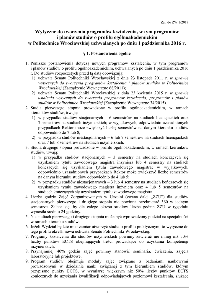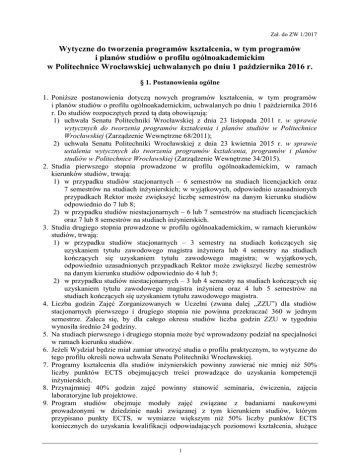 Zał. do ZW 1/2017 Wytyczne do tworzenia programów kształcenia, w tym programów i planów studiów o profilu ogólnoakademickim w Politechnice Wrocławskiej uchwalanych po dniu 1 października 2016 r. § 1. Postanowienia ogólne 1. Poniższe postanowienia dotyczą nowych programów kształcenia, w tym programów i planów studiów o profilu ogólnoakademickim, uchwalanych po dniu 1 października 2016 r. Do studiów rozpoczętych przed tą datą obowiązują: 1) uchwała Senatu Politechniki Wrocławskiej z dnia 23 listopada 2011 r. w sprawie wytycznych do tworzenia programów kształcenia i planów studiów w Politechnice Wrocławskiej (Zarządzenie Wewnętrzne 68/2011); 2) uchwała Senatu Politechniki Wrocławskiej z dnia 23 kwietnia 2015 r. w sprawie ustalenia wytycznych do tworzenia programów kształcenia, programów i planów studiów w Politechnice Wrocławskiej (Zarządzenie Wewnętrzne 34/2015). 2. Studia pierwszego stopnia prowadzone w profilu ogólnoakademickim, w ramach kierunków studiów, trwają: 1) w przypadku studiów stacjonarnych – 6 semestrów na studiach licencjackich oraz 7 semestrów na studiach inżynierskich; w wyjątkowych, odpowiednio uzasadnionych przypadkach Rektor może zwiększyć liczbę semestrów na danym kierunku studiów odpowiednio do 7 lub 8; 2) w przypadku studiów niestacjonarnych – 6 lub 7 semestrów na studiach licencjackich oraz 7 lub 8 semestrów na studiach inżynierskich. 3. Studia drugiego stopnia prowadzone w profilu ogólnoakademickim, w ramach kierunków studiów, trwają: 1) w przypadku studiów stacjonarnych – 3 semestry na studiach kończących się uzyskaniem tytułu zawodowego magistra inżyniera lub 4 semestry na studiach kończących się uzyskaniem tytułu zawodowego magistra; w wyjątkowych, odpowiednio uzasadnionych przypadkach Rektor może zwiększyć liczbę semestrów na danym kierunku studiów odpowiednio do 4 lub 5; 2) w przypadku studiów niestacjonarnych – 3 lub 4 semestry na studiach kończących się uzyskaniem tytułu zawodowego magistra inżyniera oraz 4 lub 5 semestrów na studiach kończących się uzyskaniem tytułu zawodowego magistra. 4. Liczba godzin Zajęć Zorganizowanych w Uczelni (zwana dalej „ZZU”) dla studiów stacjonarnych pierwszego i drugiego stopnia nie powinna przekraczać 360 w jednym semestrze. Zaleca się, by dla całego okresu studiów liczba godzin ZZU w tygodniu wynosiła średnio 24 godziny. 5. Na studiach pierwszego i drugiego stopnia może być wprowadzony podział na specjalności w ramach kierunku studiów. 6. Jeżeli Wydział będzie miał zamiar utworzyć studia o profilu praktycznym, to wytyczne do tego profilu określi nowa uchwała Senatu Politechniki Wrocławskiej. 7. Programy kształcenia dla studiów inżynierskich powinny zawierać nie mniej niż 50% liczby punktów ECTS obejmujących treści prowadzące do uzyskania kompetencji inżynierskich. 8. Przynajmniej 40% godzin zajęć powinny stanowić seminaria, ćwiczenia, zajęcia laboratoryjne lub projektowe. 9. Program studiów obejmuje moduły zajęć związane z badaniami naukowymi prowadzonymi w dziedzinie nauki związanej z tym kierunkiem studiów, którym przypisano punkty ECTS, w wymiarze większym niż 50% liczby punktów ECTS koniecznych do uzyskania kwalifikacji odpowiadających poziomowi kształcenia, służące 1 zdobywaniu przez studenta pogłębionej wiedzy oraz umiejętności prowadzenia badań naukowych. 10. Program studiów umożliwia studentowi wybór modułów zajęć (np. kursy, grupy kursów, całe specjalności), którym przypisano punkty ECTS, w wymiarze nie mniejszym niż 30% liczby punktów ECTS, o której mowa w § 2 ust. 6 pkt 2. 11. Praktyka zawodowa jest obowiązkowa na studiach pierwszego stopnia i powinna trwać co najmniej 4 tygodnie. Zasady i formy odbywania praktyk ustala rada wydziału. Rada wydziału określa również łączną liczbę punktów ECTS, którą student jest obowiązany uzyskać w ramach praktyk zawodowych. 12. Na studiach stacjonarnych i niestacjonarnych liczba punktów ECTS wynosi 30 w semestrze. § 2. Programy kształcenia 1. Program kształcenia dla określonego kierunku studiów, poziomu i profilu kształcenia obejmuje opis zakładanych efektów kształcenia oraz program studiów. Jest on uchwalany przez radę wydziału dla danego kierunku, specjalności, formy studiów, profilu i poziomu kształcenia (oddzielnie dla studiów stacjonarnych i niestacjonarnych). 2. Przy tworzeniu efektów kształcenia obejmujących wiedzę, umiejętności, kompetencje społeczne należy uwzględnić uniwersalne charakterystyki pierwszego stopnia określone w ustawie z dnia 22 grudnia 2015 r. o Zintegrowanym Systemie Kwalifikacji (Dz. U. z 2016 r. poz. 64 i 1010) oraz charakterystyki drugiego stopnia określone w rozporządzeniu Ministra Nauki i Szkolnictwa Wyższego z dnia 26 września 2016 r. w sprawie charakterystyk drugiego stopnia Polskiej Ramy Kwalifikacji typowych dla kwalifikacji uzyskiwanych w ramach szkolnictwa wyższego po uzyskaniu kwalifikacji pełnej na poziomie 4 – poziomy 6-8 (Dz. U. z 2016 r., poz. 1594), w tym wybrane efekty kształcenia właściwe dla obszaru lub obszarów kształcenia, do których został przyporządkowany kierunek studiów, tj.: 1) uniwersalne charakterystyki poziomu 6 Polskiej Ramy Kwalifikacji – w przypadku studiów pierwszego stopnia; 2) uniwersalne charakterystyki poziomu 7 Polskiej Ramy Kwalifikacji – w przypadku studiów drugiego stopnia; 3) dla kwalifikacji na poziomie 6 Polskiej Ramy Kwalifikacji – w przypadku studiów pierwszego stopnia: a) charakterystyki drugiego stopnia Polskiej Ramy Kwalifikacji – poziom 6, b) charakterystyki drugiego stopnia Polskiej Ramy Kwalifikacji dla poszczególnych obszarów kształcenia w ramach szkolnictwa wyższego – poziom 6, odpowiednio: - obszar kształcenia w zakresie nauk społecznych, - obszar kształcenia w zakresie nauk ścisłych, - obszar kształcenia w zakresie nauk technicznych; 4) dla 