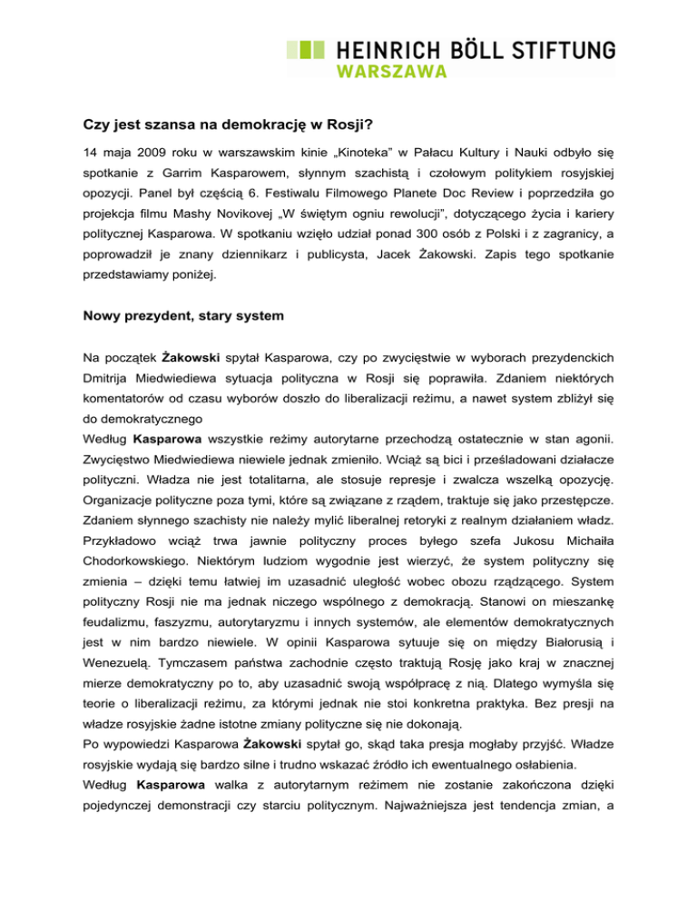 Czy jest szansa na demokrację w Rosji? 14 maja 2009 roku w warszawskim kinie „Kinoteka” w Pałacu Kultury i Nauki odbyło się spotkanie z Garrim Kasparowem, słynnym szachistą i czołowym politykiem rosyjskiej opozycji. Panel był częścią 6. Festiwalu Filmowego Planete Doc Review i poprzedziła go projekcja filmu Mashy Novikovej „W świętym ogniu rewolucji”, dotyczącego życia i kariery politycznej Kasparowa. W spotkaniu wzięło udział ponad 300 osób z Polski i z zagranicy, a poprowadził je znany dziennikarz i publicysta, Jacek Żakowski. Zapis tego spotkanie przedstawiamy poniżej. Nowy prezydent, stary system Na początek Żakowski spytał Kasparowa, czy po zwycięstwie w wyborach prezydenckich Dmitrija Miedwiediewa sytuacja polityczna w Rosji się poprawiła. Zdaniem niektórych komentatorów od czasu wyborów doszło do liberalizacji reżimu, a nawet system zbliżył się do demokratycznego Według Kasparowa wszystkie reżimy autorytarne przechodzą ostatecznie w stan agonii. Zwycięstwo Miedwiediewa niewiele jednak zmieniło. Wciąż są bici i prześladowani działacze polityczni. Władza nie jest totalitarna, ale stosuje represje i zwalcza wszelką opozycję. Organizacje polityczne poza tymi, które są związane z rządem, traktuje się jako przestępcze. Zdaniem słynnego szachisty nie należy mylić liberalnej retoryki z realnym działaniem władz. Przykładowo wciąż trwa jawnie polityczny proces byłego szefa Jukosu Michaiła Chodorkowskiego. Niektórym ludziom wygodnie jest wierzyć, że system polityczny się zmienia – dzięki temu łatwiej im uzasadnić uległość wobec obozu rządzącego. System polityczny Rosji nie ma jednak niczego wspólnego z demokracją. Stanowi on mieszankę feudalizmu, faszyzmu, autorytaryzmu i innych systemów, ale elementów demokratycznych jest w nim bardzo niewiele. W opinii Kasparowa sytuuje się on między Białorusią i Wenezuelą. Tymczasem państwa zachodnie często traktują Rosję jako kraj w znacznej mierze demokratyczny po to, aby uzasadnić swoją współpracę z nią. Dlatego wymyśla się teorie o liberalizacji reżimu, za którymi jednak nie stoi konkretna praktyka. Bez presji na władze rosyjskie żadne istotne zmiany polityczne się nie dokonają. Po wypowiedzi Kasparowa Żakowski spytał go, skąd taka presja mogłaby przyjść. Władze rosyjskie wydają się bardzo silne i trudno wskazać źródło ich ewentualnego osłabienia. Według Kasparowa walka z autorytarnym reżimem nie zostanie zakończona dzięki pojedynczej demonstracji czy starciu politycznym. Najważniejsza jest tendencja zmian, a taka ma miejsce. Obecnie do przemian politycznych może przyczynić się kryzys gospodarczy, z którym reżim sobie nie radzi. Zdaniem rosyjskiego polityka społeczeństwo widzi, że władze są coraz bardziej niepewne w swoich działaniach i obawiają się przekroczenia masy krytycznej niezadowolenia społecznego. Ludzie więc czują strach, który może zainicjować przemiany społeczne. Miedwiediew miał zmienić wizerunek Rosji, przede wszystkim za granicą. Często mówi on o prawach człowieka i prezentuje się lepiej od Putina, ale nie wprowadził żadnych istotnych zmian. Relacje władzy i opozycji Żakowski wyraził wątpliwość, czy ludzie, którzy wybrali Putina i Miedwiediewa, będą chcieli innego systemu społeczno-ekonomicznego. Zauważył też, że nawet Kasparow ma kłopoty ze zbudowaniem koalicji antyrządowej. Kasparow odparł, że trudno obecnie oceniać relacje między władzą i opozycją, ponieważ wybory są fikcją. Środowiska nieuznawane przez władze nie istnieją politycznie. Nie tylko ugrupowania rządzące, ale też opozycyjne są kontrolowane przez system. W wyborach w 2000 roku były oszustwa, ale na niewielką skalę, w 2004 roku zakres manipulacji był już o wiele większy, a w 2008 roku sytuacja stała się prawie identyczna jak w Związku Radzieckim, więc demokratyczny wybór stał się zupełną fikcją. Przykładowo z godziny na godzinę radykalnie rosła frekwencja, a poparcie dla kandydatów obozu rządzącego zbliżało się do 100%. Mimo to, według Kasparowa, braku protestu nie należy mylić z akceptacją władzy. Ludzie boją się zmian, bo obawiają się, że stracą to, co już mają, ale rosyjskie społeczeństwo jest gotowe na demokrację i zmiana może nastąpić bardzo szybko. Odnosząc się do wypowiedzi Kasparowa, Żakowski spytał, czy po odrzuceniu Putina Rosjanie wybraliby ugrupowanie demokratyczne. Czy władzy nie przejęłoby inne autorytarne środowisko? Jakie są odczucia społeczne? W opinii Kasparowa nie jest łatwo zdiagnozować świadomość społeczną w Rosji, ale wielu ludzi zaangażowanych politycznie chciałoby wprowadzenia liberalnej demokracji. Jeżeli odbyłyby się w pełni demokratyczne wybory, do parlamentu dostałoby się wiele różnorodnych ugrupowań, a obóz władzy by się rozpadł. W Rosji nie ma zgody na dyktatorskie rządy i coraz więcej ludzi chce decentralizacji władzy. Koniec rządów Putina? Na pytanie Żakowskiego o możliwy termin końca rządów Putina, Kasparow odpowiedział, że jego władza może zakończyć się nawet przed 2012 rokiem. Wiele będzie zależało od 2 stabilności rosyjskiego systemu finansowego, który już teraz się chwieje. Rezerwy finansowe prędko zmniejszają się i jeżeli wkrótce nie wzrosną ceny ropy, to kraj za kilkanaście miesięcy stanie się niewypłacalny. Ponadto władze, dla umocnienia gospodarki i podtrzymania reżimu, mogą dążyć do wojny. Jest też możliwe, że Putin stanie się kozłem ofiarnym systemu i na niego zostanie zrzucona odpowiedzialność za wszelkie patologie. Istotna może być tutaj sprawa Chodorkowskiego, która niedawno trafiła do Strasburga. Wyrok niekorzystny dla władz rosyjskich może wywołać zmiany polityczne. Podobne skutki może mieć pogłębiający się kryzys gospodarczy. Po serii pytań Żakowskiego rosyjski polityk rozwinął swoje poglądy, 
