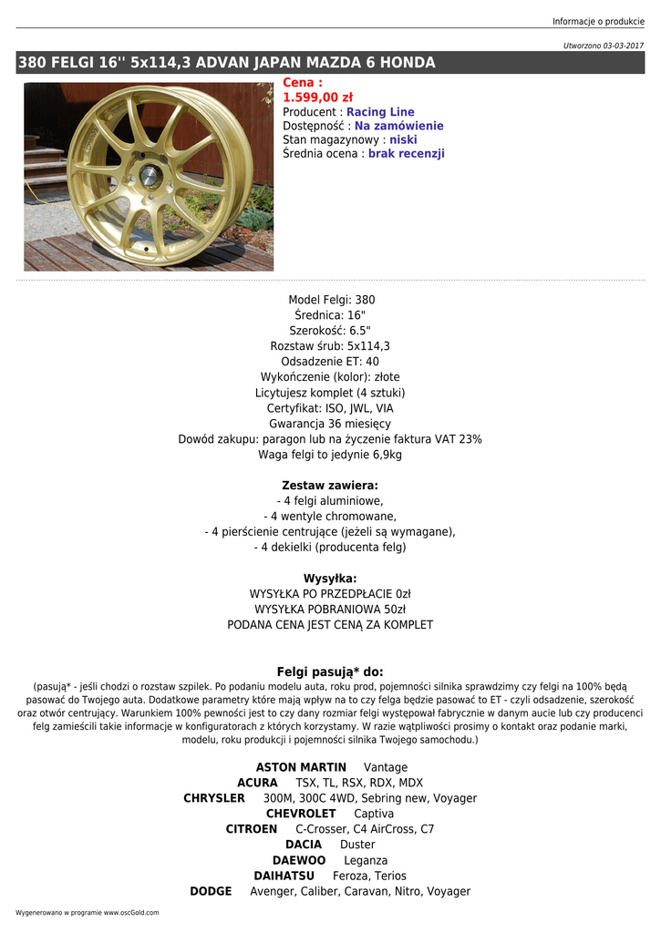 Informacje o produkcie Utworzono 03-03-2017 380 FELGI 16'' 5x114,3 ADVAN JAPAN MAZDA 6 HONDA Cena : 1.599,00 zł Producent : Racing Line Dostępność : Na zamówienie Stan magazynowy : niski Średnia ocena : brak recenzji Model Felgi: 380 Średnica: 16" Szerokość: 6.5" Rozstaw śrub: 5x114,3 Odsadzenie ET: 40 Wykończenie (kolor): złote Licytujesz komplet (4 sztuki) Certyfikat: ISO, JWL, VIA Gwarancja 36 miesięcy Dowód zakupu: paragon lub na życzenie faktura VAT 23% Waga felgi to jedynie 6,9kg Zestaw zawiera: - 4 felgi aluminiowe, - 4 wentyle chromowane, - 4 pierścienie centrujące (jeżeli są wymagane), - 4 dekielki (producenta felg) Wysyłka: WYSYŁKA PO PRZEDPŁACIE 0zł WYSYŁKA POBRANIOWA 50zł PODANA CENA JEST CENĄ ZA KOMPLET Felgi pasują* do: (pasują* - jeśli chodzi o rozstaw szpilek. Po podaniu modelu auta, roku prod, pojemności silnika sprawdzimy czy felgi na 100% będą pasować do Twojego auta. Dodatkowe parametry które mają wpływ na to czy felga będzie pasować to ET - czyli odsadzenie, szerokość oraz otwór centrujący. Warunkiem 100% pewności jest to czy dany rozmiar felgi występował fabrycznie w danym aucie lub czy producenci felg zamieścili takie informacje w konfiguratorach z których korzystamy. W razie wątpliwości prosimy o kontakt oraz podanie marki, modelu, roku produkcji i pojemności silnika Twojego samochodu.) ASTON MARTIN Vantage ACURA TSX, TL, RSX, RDX, MDX CHRYSLER 300M, 300C 4WD, Sebring new, Voyager CHEVROLET Captiva CITROEN C-Crosser, C4 AirCross, C7 DACIA Duster DAEWOO Leganza DAIHATSU Feroza, Terios DODGE Avenger, Caliber, Caravan, Nitro, Voyager Wygenerowano w programie www.oscGold.com FIAT Sedici FORD Escape, Maverick, Probe HONDA Accord (>03), Accord Coupe (>98) + Type R, Civic, Civic Sport (>04) + TypeR, Civic Tourer (2014-), CR-V, CR-Z, HR-V, FR-V, Integra Type-R, NSX, S200, Odyssey, Prelude (4WS, BB6, BB8) (97-02), Shuttle, Stream HYUNDAI Coupe Tiburon (>02), Elantra, Genesis Coupe, Grandeur, I30, I30 Coupe, I40, IX20, IX35, IX35 Facelift, IX55, Santa Fe, Grand Santa Fe, Sonata new, Trajet, Tucson, XG25/XG30, Veloster INFINITI FX35, FX45, EX35, G35, G37, I30, M35, M45, Q45, Q50 JEEP Grand Cherokee (92-99), Patriot, Compass KIA Carnival, Carens, Ceed, Ceed SW, Magentis new, Opirus, Optima, Pro Ceed, Sedeona, Soul, Sorento II (09-), Sorento III, Sprotage II, Sportage III, Venga LANCIA Flavia LAND ROVER Freelander LEXUS GS 300/430 (>98), IS 200/300 (>98), IS250, IS220d, LS 400, LS 430, RX300, SC 430 MAZDA 3, 5, 6, CX5, CX7, CX9, 323 F (>00), 626 (97-03), MPV, MX-6, Premacy, RX8, Tribute, Xedos 6, Xedos 9 MITSUBISHI ASX, Eclipse (D20, D30), Grandis, Lancer neu, Outlander, Pajero Pinin, Sigma, Space Gear NISSAN 200SX (97-00), 350Z, Almera Tino, Altima, e-NV200, Juke, Maxima (95-00), Maxima QX (>00), Murano, Primera (02-), Qashqai, Primastar (15-), Pulsar, X-Trail, Opel Antara, Cascada, Sintra, Vivaro B PEUGEOT 4007, 4008, RENAULT Fluence, Koleos, Laguna III, Latitute, Megane III(cabrio), Scenic III, Grand Scenic III, Trafic III SUBARU Impreza STI, Tribeca SUZUKI Grand Vitara new, Kizashi, Swift Sport, SX 4 TOYOTA Auris, Auris Touring Sports, Avensis Verso, Camry (>96), Corolla Verso new, Hiace, Picnic (XM1), Previa, Prius+, RAV4, Supra, Verso Zgodnie z Kodeksem PWP art.156 ust 3, emblematy widoczne na felgach mają charakter wyłącznie informacyjny i nie należy się tym sugerować, że jest to produkt oryginalny danego producenta samochodu. Alufelgi dobieramy wg parametrów katalogowych producentów. W przypadku niektórych modeli aut lub felg zachodzi konieczność zastosowania dystansów, śrub/nakrętek ampułkowych. Ponieważ, zawsze może zajść taka sytuacja w której katalog/konfigurator wprowadzi w błąd sprzedawcę zaleca się przed montażem opon przyłożyć felgę na piastę i sprawdzić czy felga nigdzie nie będzie obcierać. Po założeniu opon zwrot felg będzie nie możliwy.