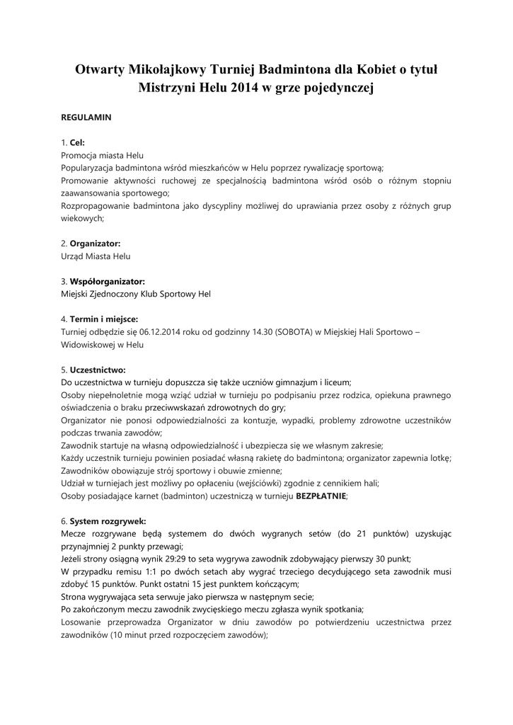 Otwarty Mikołajkowy Turniej Badmintona dla Kobiet o tytuł Mistrzyni Helu 2014 w grze pojedynczej REGULAMIN 1. Cel: Promocja miasta Helu Popularyzacja badmintona wśród mieszkańców w Helu poprzez rywalizację sportową; Promowanie aktywności ruchowej ze specjalnością badmintona wśród osób o różnym stopniu zaawansowania sportowego; Rozpropagowanie badmintona jako dyscypliny możliwej do uprawiania przez osoby z różnych grup wiekowych; 2. Organizator: Urząd Miasta Helu 3. Współorganizator: Miejski Zjednoczony Klub Sportowy Hel 4. Termin i miejsce: Turniej odbędzie się 06.12.2014 roku od godzinny 14.30 (SOBOTA) w Miejskiej Hali Sportowo – Widowiskowej w Helu 5. Uczestnictwo: Do uczestnictwa w turnieju dopuszcza się także uczniów gimnazjum i liceum; Osoby niepełnoletnie mogą wziąć udział w turnieju po podpisaniu przez rodzica, opiekuna prawnego oświadczenia o braku przeciwwskazań zdrowotnych do gry; Organizator nie ponosi odpowiedzialności za kontuzje, wypadki, problemy zdrowotne uczestników podczas trwania zawodów; Zawodnik startuje na własną odpowiedzialność i ubezpiecza się we własnym zakresie; Każdy uczestnik turnieju powinien posiadać własną rakietę do badmintona; organizator zapewnia lotkę; Zawodników obowiązuje strój sportowy i obuwie zmienne; Udział w turniejach jest możliwy po opłaceniu (wejściówki) zgodnie z cennikiem hali; Osoby posiadające karnet (badminton) uczestniczą w turnieju BEZPŁATNIE; 6. System rozgrywek: Mecze rozgrywane będą systemem do dwóch wygranych setów (do 21 punktów) uzyskując przynajmniej 2 punkty przewagi; Jeżeli strony osiągną wynik 29:29 to seta wygrywa zawodnik zdobywający pierwszy 30 punkt; W przypadku remisu 1:1 po dwóch setach aby wygrać trzeciego decydującego seta zawodnik musi zdobyć 15 punktów. Punkt ostatni 15 jest punktem kończącym; Strona wygrywająca seta serwuje jako pierwsza w następnym secie; Po zakończonym meczu zawodnik zwycięskiego meczu zgłasza wynik spotkania; Losowanie przeprowadza Organizator w dniu zawodów po potwierdzeniu uczestnictwa przez zawodników (10 minut przed rozpoczęciem zawodów); Organizator podczas trwania turnieju przewiduje dla zawodniczek z trzeciego i kolejnego miejsca w grupie TURNIEJ POCIESZENIA, które nie zakwalifikowały sie do turnieju głównego. 7. Punktacja Zawodniczka wygrywająca mecz 2:0 otrzymuje 3 pkt Zawodniczka przegrywająca mecz 0:2 otrzymuje 0 pkt Zawodniczka wygrywająca mecz 2:1 otrzymuje 2 pkt Zawodniczka przegrywająca mecz 1:2 otrzymuje 1 pkt O kolejności zajętych miejsc decyduje suma wszystkich punktów zdobyta w turnieju 8. Sędziowie: Organizator nie przewiduje wystawienia sędziów lotkowych, serwisowych i liniowych, za przebieg każdego meczu odpowiedzialny będzie w całości organizator prowadzący zawody; 9. Nagrody: W zależności od pozyskania sponsora możliwe są dodatkowe nagrody rzeczowe; Za zajęcie I miejsca organizator przewiduje (puchar, medal, dyplom) Za zajęcie II, III miejsca organizator przewiduje (medal i dyplom) Za pozostałe miejsca organizator przewiduje dyplomy uczestnictwa 10. Zapisy: Zgłoszenia imienne przyjmuje Norbert Górski do dnia 05 grudnia 2014 w dwóch formach: telefonicznie kom.: 694-533-389 mailowo: [email protected] W zgłoszeniu należy podać imię i nazwisko, numer telefonu; Uczestnicy są zobowiązani potwierdzić swój udział na 10 minut przed rozpoczęciem turnieju; 11. Postanowienia organizacyjne: Każda zawodniczka zobowiązana jest do zapoznania się i przestrzegania regulaminu pod groźbą dyskwalifikacji; Przed meczem każda para ma prawo do 2 minutowej rozgrzewki; Za rzeczy zgubione podczas zawodów organizator nie odpowiada; Organizator zastrzega sobie prawo do ostatecznej interpretacji regulaminu i zasad gry; Organizator zastrzega sobie prawo do korzystania ze zdjęć z wizerunkiem uczestników zawodów w celach promocyjno – marketingowych;
