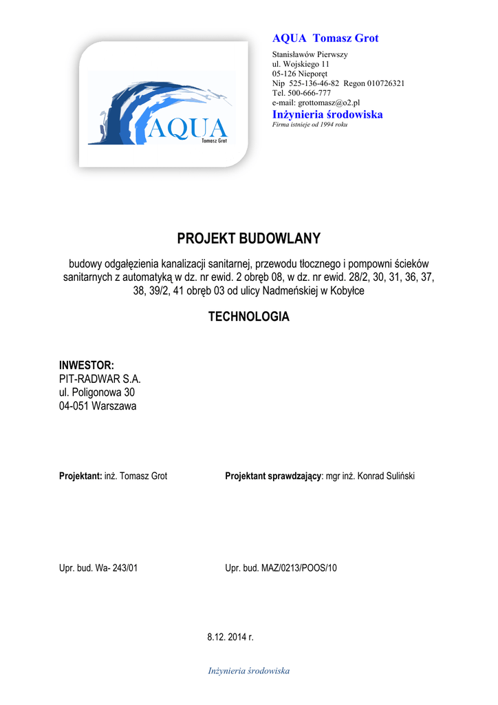 AQUA Tomasz Grot Stanisławów Pierwszy ul. Wojskiego 11 05-126 Nieporęt Nip 525-136-46-82 82 Regon 010726321 Tel. 500-666-777 e-mail: [email protected] Inżynieria środowiska Firma istnieje od 1994 roku PROJEKT BUDOWLANY budowy odgałęzienia kanalizacji sanitarnej, przewodu tłocznego i pompowni ścieków ści sanitarnych z automatyką w dz. nr ewid. 2 obręb 08, w dz. nr ewid. 28/2, 30, 3 31, 36, 37, 38, 39/2, 41 obręb 03 od ulicy Nadmeńskiej w Kobyłce TECHNOLOGIA INWESTOR: PIT-RADWAR S.A. ul. Poligonowa 30 04-051 Warszawa Projektant: inż. Tomasz Grot Projektant sprawdzający: mgr inż. Konrad Suliński Upr. bud. Wa- 243/01 Upr. bud. MAZ/0213/POOS/10 8.12. 2014 r. Inżynieria środowiska Projekt budowlany budowy odgałęzienia kanalizacji sanitarnej, przewodu tłocznego i pompowni ścieków sanitarnych z automatyką w dz. nr ewid. 2 obręb 08, w dz. nr ewid. 28/2, 30, 31, 36, 37, 38, 39/2, 41 obręb 03 od ulicy Nadmeńskiej w Kobyłce Zawartość opracowania: Strona tytułowa str. 1 Zawartość opracowania str. 2 Spis treści str. 3 Opis techniczny str. 4-22 Oświadczenie - projektant str. 23 Oświadczenie – projektant sprawdzający str. 24 Uprawnienia budowlane - projektant str. 25 Przynależność do OIIB – projektant str. 26-27 Uprawnienia budowlane - projektant sprawdzający str. 28-29 Przynależność do OIIB – projektant sprawdzający str. 30 Warunki techniczne wydane przez Miasto Kobyłka str. 31 Decyzja 1682/2014 r. wydana przez Burmistrza Miasta Kobyłka str. 32-33 Wypis z MPZP str. 34-40 Geotechniczne warunki posadowienia str. 41-68 Mapa do celów projektowych str. 69 Protokół z Narady koordynacyjnej z dnia 0.12.2014 r. str. 70-71 Załącznik graficzny do Protokołu z Narady koordynacyjnej skala 1:500 str. 72 Projekt zagospodarowania terenu rys. 1.0 str. 73 Profil podłużny sieci kanalizacji ciśnieniowej rys. 2.0 str. 74 S3 Studnia rozprężna φ1200 mm rys. 3.0 str. 75 S4 Schemat istniejącej studni betonowej φ1200 mm rys. 3.1 str. 76 S2 Betonowa studnia czyszczakowa φ1200 mm rys. 3.2 str. 77 Pompownia ścieków rys. 4.0 str. 78 Schemat zabezpieczenia wykopu rys 5.0 str. 79 Karta katalogowa i charakterystyka pomp 8.12. 2014 r. str. 80-83 2 Projekt budowlany budowy odgałęzienia kanalizacji sanitarnej, przewodu tłocznego i pompowni ścieków sanitarnych z automatyką w dz. nr ewid. 2 obręb 08, w dz. nr ewid. 28/2, 30, 31, 36, 37, 38, 39/2, 41 obręb 03 od ulicy Nadmeńskiej w Kobyłce SPIS TREŚCI: 1. 1.1. 1.2. 1.3. 1.4. 1.5. 1.6. 1.7. 2. 2.1. 2.2. 2.3. 2.4. 2.4.1. 2.4.2. 2.4.3. 2.5. 2.5.1. 2.5.2. 2.6. 2.7. 2.8. 3. 3.1. 3.1.1. 3.1.2. 3.2. 3.3. 3.4. 3.5. 3.6. CZĘŚĆ OPISOWO-ZBIORCZA INFORMACJE DOTYCZĄCE TERENU OPIS DO PROJEKTU ZAGOSPODAROWANIA TERENU PRZEDMIOT OPRACOWANIA ZAMAWIAJĄCY PODSTAWA OPRACOWANIA DANE DOTYCZĄCE WPISU DO REJESTRU ZABYTKÓW WPŁYW EKSPLOATACJI GÓRNICZEJ. CZĘŚĆ TECHNOLOGICZNA OPIS ROZWIĄZANIA PROJEKTOWEGO ORAZ LOKALIZACJA PRZEWODÓW KANALIZACYJNYCH WŁĄCZENIE DO SIECI MATERIAŁ I UZBROJENIE SIECI ZBIORNIK POMPOWNI, PRZEWÓD TŁOCZNY, POMPY ZBIORNIK POMPOWNI PRZEWÓD TŁOCZNY POMPY INSTALACJE SIŁY, STEROWANIA I OŚWIETLENIA PRZEPOMPOWNI STEROWANIE I SYGNALIZACJA W PRZEPOMPOWNI STEROWNICA SPR2-D2 ZAGŁĘBIENIE PRZEWODÓW PRÓBA SZCZELNOŚCI ZABEZPIECZENIE ANTYKOROZYJNE RUROCIĄGÓW WYTYCZNE ORGANIZACJI WYKONANIA INWESTYCJI ROBOTY ZIEMNE WYTYCZNE REALIZACJI INWESTYCJI WYMAGANIA TECHNICZNE REALIZACJI SIECI KANALIZACYJNEJ. OBSŁUGA I WYTYCZNE BHP OPINIA GEOTECHNICZNA ODWODNIENIE WYKOPÓW ZAPLECZE WYKONAWCY ROBÓT UWAGI KOŃCOWE INFORMACJA DOTYCZĄCA BEZPIECZEŃSTWA I OCHRONY ZDROWIA 8.12. 2014 r. 4 4 4 5 5 5 5 5 6 6 6 6 7 7 8 8 9 9 9 10 10 11 11 11 11 14 15 16 16 17 17 18 3 Projekt budowlany budowy odgałęzienia kanalizacji sanitarnej, przewodu tłocznego i pompowni ścieków sanitarnych z automatyką w dz. nr ewid. 2 obręb 08, w dz. nr ewid. 28/2, 30, 31, 36, 37, 38, 39/2, 41 obręb 03 od ulicy Nadmeńskiej w Kobyłce 1. CZĘŚĆ OPISOWO-ZBIORCZA 1.1. INFORMACJE DOTYCZĄCE TERENU Zgodnie z Wypisami z Miejscowego Planu Zagospodarowania Przestrzennego informuję, że przeznaczenie terenu, na którym znajduje się projektowana sieć kanalizacyjna określa Miejscowy Plan Zagospodarowania Przestrzennego północnej części miasta Kobyłka zatwierdzony uchwałą Rady Miejskiej w Kobyłce Nr XVI/172/04 z dnia 15 stycznia 2004 opublikowaną w Dz. Urz. Woj. Mazowieckiego z 2004 r. Nr 25 poz. 835 obowiązujący od dnia 21 lutego 2009 r. Działki, na których przewidziana jest inwestycja położone są w kompleksie oznaczonym w w/w planie symbolem: • • KD – teren drogi publicznej klasy drogi dojazdowej - dz. nr ewid. 2 obręb 08, 07KZ – teren drogi publicznej klasy drogi zbiorczej - dz. nr ewid. 2 obręb 08. Ponadto dla części działek nr ew. 28/2, 30, 31, 36, 37, 38, 39/2, 41 obręb 03 przy ul. ks. Augustyna Kordeckiego zostało wszczęte postępowanie administracyjne w sprawie ustalenia lokalizacji inwestycji celu publicznego dla przedsięwzięcia polegającego na budowie kanalizacji deszczowej i kanalizacji sanitarnej i tłocznej z pompownią ścieków sanitarnych z automatyką. 1.2. OPIS DO PROJEKTU ZAGOSPODAROWANIA TERENU Istniejący stan zagospodarowania terenu Inwestycja położona jest w pasie drogowym ulicy Nadmeńskiej w dz nr ewid. 2 obręb 08, w dz. nr ewid. 28/2, 30, 31, 36, 37, 38, 39/2, 41 obręb 03 w m Kobyłka w powiecie wołomińskim. Teren inwestycji charakteryzuje zabudowa budynków socjalnych i budynków warsztatowych z istniejącą infrastrukturą techniczną uzbrojenia podziemnego terenu. Kanał projektowany jest wzdłuż ulicy Nadmeńskiej w jej liniach rozgraniczających i połączony będzie z systemem kanalizacji sanitarnej m. Kobyłka. Teren jest stosunkowo płaski, różnice rzędnych w skrajnych punktach projektowanej sieci wynoszą ok. 0,1 m. Projektowane zagospodarowanie terenu Projektowany odcinek sieci kanalizacji sanitarnej stanowi fragment całości systemu kanalizacyjnego Miasta Kobyłka