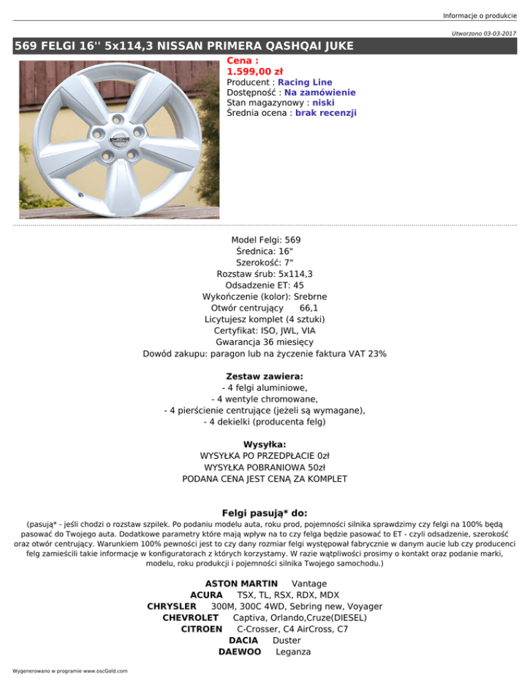 Informacje o produkcie Utworzono 03-03-2017 569 FELGI 16'' 5x114,3 NISSAN PRIMERA QASHQAI JUKE Cena : 1.599,00 zł Producent : Racing Line Dostępność : Na zamówienie Stan magazynowy : niski Średnia ocena : brak recenzji Model Felgi: 569 Średnica: 16" Szerokość: 7" Rozstaw śrub: 5x114,3 Odsadzenie ET: 45 Wykończenie (kolor): Srebrne Otwór centrujący 66,1 Licytujesz komplet (4 sztuki) Certyfikat: ISO, JWL, VIA Gwarancja 36 miesięcy Dowód zakupu: paragon lub na życzenie faktura VAT 23% Zestaw zawiera: - 4 felgi aluminiowe, - 4 wentyle chromowane, - 4 pierścienie centrujące (jeżeli są wymagane), - 4 dekielki (producenta felg) Wysyłka: WYSYŁKA PO PRZEDPŁACIE 0zł WYSYŁKA POBRANIOWA 50zł PODANA CENA JEST CENĄ ZA KOMPLET Felgi pasują* do: (pasują* - jeśli chodzi o rozstaw szpilek. Po podaniu modelu auta, roku prod, pojemności silnika sprawdzimy czy felgi na 100% będą pasować do Twojego auta. Dodatkowe parametry które mają wpływ na to czy felga będzie pasować to ET - czyli odsadzenie, szerokość oraz otwór centrujący. Warunkiem 100% pewności jest to czy dany rozmiar felgi występował fabrycznie w danym aucie lub czy producenci felg zamieścili takie informacje w konfiguratorach z których korzystamy. W razie wątpliwości prosimy o kontakt oraz podanie marki, modelu, roku produkcji i pojemności silnika Twojego samochodu.) ASTON MARTIN Vantage ACURA TSX, TL, RSX, RDX, MDX CHRYSLER 300M, 300C 4WD, Sebring new, Voyager CHEVROLET Captiva, Orlando,Cruze(DIESEL) CITROEN C-Crosser, C4 AirCross, C7 DACIA Duster DAEWOO Leganza Wygenerowano w programie www.oscGold.com DAIHATSU Feroza, Terios DODGE Avenger, Caliber, Caravan, Nitro, Voyager FIAT Sedici FORD Escape, Maverick, Probe HONDA Accord (>03), Accord Coupe (>98) + Type R, Civic, Civic Sport (>04) + TypeR, Civic Tourer (2014-), CR-V, CR-Z, HR-V, FR-V, Integra Type-R, NSX, S200, Odyssey, Prelude (4WS, BB6, BB8) (97-02), Shuttle, Stream HYUNDAI Coupe Tiburon (>02), Elantra, Genesis Coupe, Grandeur, I30, I30 Coupe, I40, IX20, IX35, IX35 Facelift, IX55, Santa Fe, Grand Santa Fe, Sonata new, Trajet, Tucson, XG25/XG30, Veloster INFINITI FX35, FX45, EX35, G35, G37, I30, M35, M45, Q45, Q50 JEEP Grand Cherokee (92-99), Patriot, Compass KIA Carnival, Carens, Ceed, Ceed SW, Magentis new, Opirus, Optima, Pro Ceed, Sedeona, Soul, Sorento II (09-), Sorento III, Sprotage II, Sportage III, Venga LANCIA Flavia LAND ROVER Freelander LEXUS GS 300/430 (>98), IS 200/300 (>98), IS250, IS220d, LS 400, LS 430, RX300, SC 430 MAZDA 3, 5, 6, CX5, CX7, CX9, 323 F (>00), 626 (97-03), MPV, MX-6, Premacy, RX8, Tribute, Xedos 6, Xedos 9 MITSUBISHI ASX, Eclipse (D20, D30), Grandis, Lancer neu, Outlander, Pajero Pinin, Sigma, Space Gear NISSAN 200SX (97-00), 350Z, Almera Tino, Altima, e-NV200, Juke, Maxima (95-00), Maxima QX (>00), Murano, Primera (02-), Qashqai, Primastar (15-), Pulsar, X-Trail, Opel Antara, Cascada, Sintra, Vivaro B PEUGEOT 4007, 4008, RENAULT Fluence, Koleos, Laguna III, Latitute, Megane III(cabrio), Scenic III, Grand Scenic III, Trafic III SUBARU Impreza STI, Tribeca SUZUKI Grand Vitara new, Kizashi, Swift Sport, SX 4 TOYOTA Auris, Auris Touring Sports, Avensis Verso, Camry (>96), Corolla Verso new, Hiace, Picnic (XM1), Previa, Prius+, RAV4, Supra, Verso Zgodnie z Kodeksem PWP art.156 ust 3, emblematy widoczne na felgach mają charakter wyłącznie informacyjny i nie należy się tym sugerować, że jest to produkt oryginalny danego producenta samochodu. Alufelgi dobieramy wg parametrów katalogowych producentów. W przypadku niektórych modeli aut lub felg zachodzi konieczność zastosowania dystansów, śrub/nakrętek ampułkowych. Ponieważ, zawsze może zajść taka sytuacja w której katalog/konfigurator wprowadzi w błąd sprzedawcę zaleca się przed montażem opon przyłożyć felgę na piastę i sprawdzić czy felga nigdzie nie będzie obcierać. Po założeniu opon zwrot felg będzie nie możliwy.