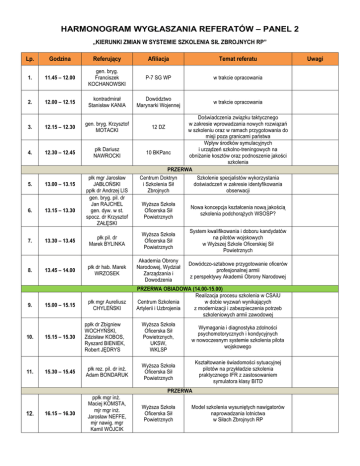 HARMONOGRAM WYGŁASZANIA REFERATÓW – PANEL 2 „KIERUNKI ZMIAN W SYSTEMIE SZKOLENIA SIŁ ZBROJNYCH RP” Lp. Godzina Referujący Afiliacja Temat referatu 1. 11.45 – 12.00 gen. bryg. Franciszek KOCHANOWSKI P-7 SG WP w trakcie opracowania 2. 12.00 – 12.15 kontradmirał Stanisław KANIA Dowództwo Marynarki Wojennej w trakcie opracowania 3. 12.15 – 12.30 gen. bryg. Krzysztof MOTACKI 4. 12.30 – 12.45 płk Dariusz NAWROCKI 5. 13.00 – 13.15 6. 13.15 – 13.30 7. 8. 9. 10. 11. płk mgr Jarosław JABŁOŃSKI ppłk dr Andrzej LIS gen. bryg. pil. dr Jan RAJCHEL gen. dyw. w st. spocz. dr Krzysztof ZAŁĘSKI Doświadczenia związku taktycznego w zakresie wprowadzania nowych rozwiązań 12 DZ w szkoleniu oraz w ramach przygotowania do misji poza granicami państwa Wpływ środków symulacyjnych i urządzeń szkolno-treningowych na 10 BKPanc obniżanie kosztów oraz podnoszenie jakości szkolenia PRZERWA Centrum Doktryn Szkolenie specjalistów wykorzystania i Szkolenia Sił doświadczeń w zakresie identyfikowania Zbrojnych obserwacji Wyższa Szkoła Oficerska Sił Powietrznych Nowa koncepcja kształcenia nową jakością szkolenia podchorążych WSOSP? 13.30 – 13.45 płk pil. dr Marek BYLINKA Wyższa Szkoła Oficerska Sił Powietrznych System kwalifikowania i doboru kandydatów na pilotów wojskowych w Wyższej Szkole Oficerskiej Sił Powietrznych 13.45 – 14.00 płk dr hab. Marek WRZOSEK Akademia Obrony Narodowej, Wydział Zarządzania i Dowodzenia Dowódczo-sztabowe przygotowanie oficerów profesjonalnej armii z perspektywy Akademii Obrony Narodowej PRZERWA OBIADOWA (14.00-15.00) Realizacja procesu szkolenia w CSAiU Centrum Szkolenia w dobie wyzwań wynikających Artylerii i Uzbrojenia z modernizacji i zabezpieczenia potrzeb szkoleniowych armii zawodowej 15.00 – 15.15 płk mgr Aureliusz CHYLEŃSKI 15.15 – 15.30 ppłk dr Zbigniew WOCHYŃSKI, Zdzisław KOBOS, Ryszard BIENIEK, Robert JĘDRYS Wyższa Szkoła Oficerska Sił Powietrznych, UKSW, WKLSP Wymagania i diagnostyka zdolności psychomotorycznych i kondycyjnych w nowoczesnym systemie szkolenia pilota wojskowego 15.30 – 15.45 płk rez. pil. dr inż. Adam BONDARUK Wyższa Szkoła Oficerska Sił Powietrznych Kształtowanie świadomości sytuacyjnej pilotów na przykładzie szkolenia praktycznego IFR z zastosowaniem symulatora klasy BITD 16.15 – 16.30 ppłk mgr inż. Maciej KOMSTA, mjr mgr inż. Jarosław NEFFE, mjr nawig. mgr Kamil WÓJCIK PRZERWA 12. Wyższa Szkoła Oficerska Sił Powietrznych Model szkolenia wysuniętych nawigatorów naprowadzania lotnictwa w Siłach Zbrojnych RP Uwagi 13. 16.30 – 16.45 gen. dyw. pil. dr Leszek CWOJDZIŃSKI, płk dr inż. Mirosław ADAMSKI, ppor. mgr inż. Jerzy ŚLEZIAK 14. 16.45 – 17.00 mjr mgr inż. Arkadiusz PAWLIK Departament Polityki Zbrojeniowej, Wyższa Szkoła Oficerska Sił Powietrznych Modernizacja adaptera bombardierskiego do samolotu F-16 Wyższa Szkoła Oficerska Sił Powietrznych Licencjonowane szkolenie mechaników obsługi technicznej statków powietrznych PRZERWA 15. 17.15 – 17.30 płk Wojciech SMOŁUCH Dowództwo Wojsk Specjalnych w trakcie opracowania 16. 17.30 – 17.45 p. Ewa CHOJNACKA Departament Informatyki i Telekomunikacji E-learning w RON na przykładzie szkoleń dla użytkowników systemów i usług IT