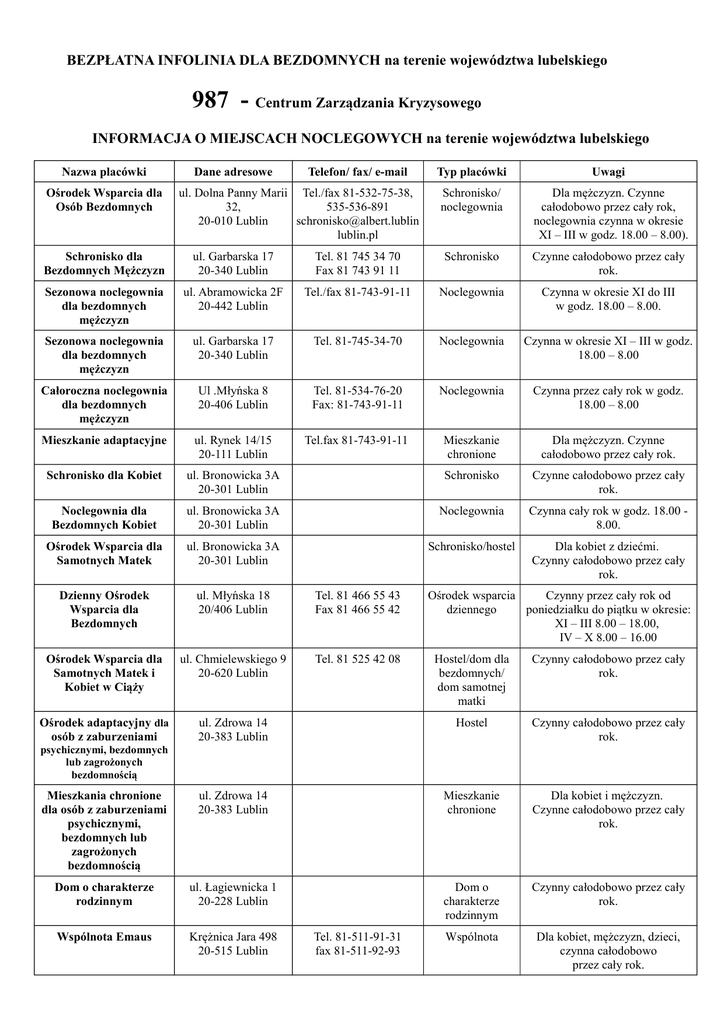 BEZPŁATNA INFOLINIA DLA BEZDOMNYCH na terenie województwa lubelskiego 987 - Centrum Zarządzania Kryzysowego INFORMACJA O MIEJSCACH NOCLEGOWYCH na terenie województwa lubelskiego Nazwa placówki Ośrodek Wsparcia dla Osób Bezdomnych Dane adresowe Telefon/ fax/ e-mail ul. Dolna Panny Marii Tel./fax 81-532-75-38, 32, 535-536-891 20-010 Lublin [email protected] lublin.pl Typ placówki Uwagi Schronisko/ noclegownia Dla mężczyzn. Czynne całodobowo przez cały rok, noclegownia czynna w okresie XI – III w godz. 18.00 – 8.00). Schronisko dla Bezdomnych Mężczyzn ul. Garbarska 17 20-340 Lublin Tel. 81 745 34 70 Fax 81 743 91 11 Schronisko Czynne całodobowo przez cały rok. Sezonowa noclegownia dla bezdomnych mężczyzn ul. Abramowicka 2F 20-442 Lublin Tel./fax 81-743-91-11 Noclegownia Czynna w okresie XI do III w godz. 18.00 – 8.00. Sezonowa noclegownia dla bezdomnych mężczyzn ul. Garbarska 17 20-340 Lublin Tel. 81-745-34-70 Noclegownia Czynna w okresie XI – III w godz. 18.00 – 8.00 Całoroczna noclegownia dla bezdomnych mężczyzn Ul .Młyńska 8 20-406 Lublin Tel. 81-534-76-20 Fax: 81-743-91-11 Noclegownia Czynna przez cały rok w godz. 18.00 – 8.00 Mieszkanie adaptacyjne ul. Rynek 14/15 20-111 Lublin Tel.fax 81-743-91-11 Mieszkanie chronione Dla mężczyzn. Czynne całodobowo przez cały rok. Schronisko dla Kobiet ul. Bronowicka 3A 20-301 Lublin Schronisko Czynne całodobowo przez cały rok. Noclegownia dla Bezdomnych Kobiet ul. Bronowicka 3A 20-301 Lublin Noclegownia Czynna cały rok w godz. 18.00 8.00. Ośrodek Wsparcia dla Samotnych Matek ul. Bronowicka 3A 20-301 Lublin Schronisko/hostel Dla kobiet z dziećmi. Czynny całodobowo przez cały rok. Dzienny Ośrodek Wsparcia dla Bezdomnych ul. Młyńska 18 20/406 Lublin Tel. 81 466 55 43 Fax 81 466 55 42 Ośrodek Wsparcia dla Samotnych Matek i Kobiet w Ciąży ul. Chmielewskiego 9 20-620 Lublin Tel. 81 525 42 08 Ośrodek adaptacyjny dla osób z zaburzeniami Ośrodek wsparcia Czynny przez cały rok od dziennego poniedziałku do piątku w okresie: XI – III 8.00 – 18.00, IV – X 8.00 – 16.00 Hostel/dom dla bezdomnych/ dom samotnej matki Czynny całodobowo przez cały rok. ul. Zdrowa 14 20-383 Lublin Hostel Czynny całodobowo przez cały rok. Mieszkania chronione dla osób z zaburzeniami psychicznymi, bezdomnych lub zagrożonych bezdomnością ul. Zdrowa 14 20-383 Lublin Mieszkanie chronione Dla kobiet i mężczyzn. Czynne całodobowo przez cały rok. Dom o charakterze rodzinnym ul. Łagiewnicka 1 20-228 Lublin Dom o charakterze rodzinnym Czynny całodobowo przez cały rok. Wspólnota Emaus Krężnica Jara 498 20-515 Lublin Wspólnota Dla kobiet, mężczyzn, dzieci, czynna całodobowo przez cały rok. psychicznymi, bezdomnych lub zagrożonych bezdomnością Tel. 81-511-91-31 fax 81-511-92-93 Noclegownia dla Bezdomnych Mężczyzn ul. Kąpielowa 11 21-500 Biała Podlaska tel. 83 343 85 29 Noclegownia Czynna przez cały rok w okresie: XI – III w godz. 17.00 – 8.00, IV – X w godz. 20.00 – 7.00 Ogrzewalnia dzienna ul. Kąpielowa 11 21-500 Biała Podlaska tel. 83 343 85 29 Ogrzewalnia Dla mężczyzn. Czynna w okresie: XI – III w godz. 8.00 – 17.00 Wielopokoleniowy Dom Pomocy dla Bezdomnych Ul. Rolnicza 33A 21-560 Wysokie Tel. 602-333-005 Dom dla bezdomnych Dla kobiet, mężczyzn i dzieci. Czynne całodobowo przez cały rok. Noclegownia "Samarytanin" Wola Mała 250 A 23-400 Biłgoraj Tel./fax 84-686-23-58 Noclegownia Dla mężczyzn. Czynna w okresie jesienno-zimowym w godz. 15.00 – 8.00. W okresie letnim w zależności od potrzeb. Schronisko dla Bezdomnych Mężczyzn ul. Wołyńska 69 22-100 Chełm Schronisko Dla mężczyzn. Czynne całodobowo przez cały rok. Dom Samotnej Matki ul. Gminna 61 22-100 ChełmPokrówka Tel. 82-565-38-43 Hostel/dom dla bezdomnych Dla kobiet z dziećmi. Czynne całodobowo przez cały rok. Stowarzyszenie MONAR - Ośrodek Pomocy Bliźniemu MARKOT ul. Kąpieliskowa 28 22-100 Chełm tel. 512 026 291 Dom dla bezdomnych Dla kobiet i mężczyzn. Czynne całodobowo przez cały rok. Stowarzyszenie „Kres” ul. Nowa 69 22-500 Hrubieszów tel. 84 696 44 67 Schronisko Dla kobiet, mężczyzn i dzieci. Czynne całodobowo przez cały rok. Osada dla Osób Bezdomnych MonarMarkot Wilczyska 83 c 21-426 Wola Mysłowska Tel/fax 25-754-25-33 Dom dla bezdomnych Dla kobiet i mężczyzn. Czynna całodobowo przez cały rok Schronisko dla Mężczyzn im. Św. Brata Alberta ul. Rybacka 6 24-100 Puławy Tel. 81-887-48-56 Schronisko Czynne całodobowo przez cały rok. Noclegownia dla Bezdomnych ul. Brzostówiecka 2 21-300 Radzyń Podlaski Tel. 83-413-17-64 Fax: 83-413-17-55 Noclegownia Dla mężczyzn. Czynne całodobowo przez cały rok. Wielopokoleniowy Dom dla Bezdomnych Podlodów 8 08-504 Ułęż Tel. 602-333-005 Dom dla bezdomnych Dla kobiet, mężczyzn i dzieci. Czynne całodobowo przez cały rok. Schronisko dla Bezdomnych Mężczyzn im. Św. Brata Alberta ul. Orzeszkowej 4 21-040 Świdnik tel. 81 751 59 08 Schronisko Czynne całodobowo przez cały rok Noclegownia Stowarzyszenie Klubu Abstynenta Wzajemnej Pomocy "Oaza", ul. Kolejowa 4 21-040 Świdnik Noclegownia Dla mężczyzn. Czynna cały rok w godzinach 20.00 - 7.00. Gminna Noclegownia ul. Szarowola 6 22-600 Tomaszów Lubelski Tel. 84 641 89 50 fax: 84 649 53 41 Noclegownia Dla kobiet i mężczyzn. Czynna cały rok. Schronisko dla Bezdomnych Mężczyzn ul. Orlicz Dreszera 2 22-400 Zamość tel. 84 627 09 31 Schronisko Czynne całodobowo przez cały rok.