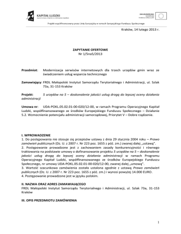 Kraków, 14 lutego 2013 r. ZAPYTANIE OFERTOWE Nr 1/5na5/2013 Przedmiot: Modernizacja serwisów internetowych dla trzech urzędów gmin wraz ze świadczeniem usług wsparcia technicznego Zamawiający: FRDL Małopolski Instytut Samorządu Terytorialnego i Administracji, ul. Szlak 73a, 31-153 Kraków Projekt: 5 urzędów na 5 – doskonalenie jakości usług drogą do lepszej oceny działania administracji Umowa nr: UDA-POKL.05.02.01-00-020/12-00, w ramach Programu Operacyjnego Kapitał Ludzki, współfinansowanego ze środków Europejskiego Funduszu Społecznego – Działanie 5.2. Wzmocnienie potencjału administracji samorządowej, Priorytet V – Dobre rządzenie. I. WPROWADZENIE 1. Do postępowania nie stosuje się przepisów ustawy z dnia 29 stycznia 2004 roku – Prawo zamówień publicznych (Dz. U. z 2007 r. Nr 223 poz. 1655 z póź. zm.) zwanej dalej „ustawą”. 2. Postępowanie prowadzone jest z zachowaniem zasady konkurencyjności i równego traktowania na podstawie umowy o dofinansowanie projektu 5 urzędów na 5 – doskonalenie jakości usług drogą do lepszej oceny działania administracji w ramach Programu Operacyjnego Kapitał Ludzki, współfinansowanego ze środków Europejskiego Funduszu Społecznego, nr umowy UDA-POKL.05.02.01-00-020/12-00, zwanej dalej „umową”. 3. Wartość szacunkowa zamówienia została ustalona zgodnie z ustawą Prawo zamówień publicznych (Dz. U. z 2007 r. Nr 223 poz. 1655 z póź. zm.) i wynosi powyżej 14.000 EURO. 4. Postępowanie prowadzone jest w języku polskim. II. NAZWA ORAZ ADRES ZAMAWIAJĄCEGO FRDL Małopolski Instytut Samorządu Terytorialnego i Administracji, ul. Szlak 73a, 31-153 Kraków III. OPIS PRZEDMIOTU ZAMÓWIENIA 1 Przedmiotem zamówienia jest modernizacja serwisów internetowych dla trzech urzędów gmin wraz ze świadczeniem usług wsparcia technicznego (Kod CPV 72413000-8 – usługi w zakresie projektowania stron WWW) Szczegółowy opis przedmiotu zamówienia określa Załącznik nr 1 do Zapytania. Kody Wspólnego Słownika Zamówień (CPV): Kody Wspólnego Lp. Nazwa elementu zamówienia Liczba szt. Słownika Zamówień (CPV) 1A. Modernizacja serwisu internetowego urzędów 1 1B. gmin: 1 a) Bystra-Sidzina 72413000-8 1C. b) Iwanowice 1 c) Łapsze Niżne IV. OPIS CZĘŚCI ZAMÓWIENIA - JEŻELI ZAMAWIAJĄCY DOPUSZCZA SKŁADANIE OFERT CZĘŚCIOWYCH Zamawiający dopuszcza składanie ofert częściowych kompletnych w poszczególnych Częściach. V. TERMIN WYKONANIA ZAMÓWIENIA Termin realizacji zamówienia – realizacja w terminie 4 tygodni od dnia podpisania umowy. Możliwe jest wydłużenie okresu realizacji zamówienia w umowie po konsultacjach z użytkownikiem serwisu internetowego. VI. OPIS WARUNKÓW UDZIAŁU W POSTĘPOWANIU ORAZ OPIS SPOSOBU DOKONYWANIA OCENY SPEŁNIANIA TYCH WARUNKÓW O udzielenie zamówienia może ubiegać się Oferent spełniający następujące warunki: 1) posiada uprawnienia do wykonywania określonej działalności lub czynności, jeżeli ustawy nakładają obowiązek posiadania takich uprawnień; 2) posiada niezbędną wiedzę i doświadczenie oraz dysponuje potencjałem technicznym i osobami zdolnymi do wykonania zamówienia; 3) znajduje się w sytuacji ekonomicznej i finansowej zapewniającej wykonanie zamówienia; 4) nie podlega wykluczeniu z postępowania o udzielenie zamówienia w oparciu o zapisy zawarte w art. 24 ust. 1 i 2 ustawy. Ocena spełniania warunków udziału w postępowaniu dokonana będzie w oparciu o oświadczenia, które ma dostarczyć Oferent. VII. INFORMACJE O OŚWIADCZENIACH I DOKUMENTACH, JAKIE MAJĄ DOSTARCZYĆ OFERENCI W CELU POTWIERDZENIA SPEŁNIANIA WARUNKÓW UDZIAŁU W POSTĘPOWANIU I. Wraz z ofertą Oferent przekaże Zamawiającemu: 1) Oświadczenie o spełnianiu warunków udziału w postępowaniu, stanowiący Załącznik nr 3 do Zapytania; 2 2) Aktualny odpis z właściwego rejestru albo aktualne zaświadczenie o wpisie do ewidencji działalności gospodarczej, jeżeli odrębne przepisy wymagają wpisu do rejestru lub zgłoszenia do ewidencji działalności gospodarczej, wystawionego nie wcześniej niż 6 miesięcy przed upływem terminu składania ofert; 3) Pełnomocnictwo do działania w imieniu Oferenta, o ile prawo do reprezentowania Oferenta w powyższym zakresie nie wynika wprost z dokumentu rejestrowego. Oświadczenie, o którym mowa w pkt. 1) należy przedstawić w formie oryginału. Dokumenty, o których mowa w pkt. 2) mogą być przedstawione w formie oryginału lub kserokopii poświadczonej za zgodność z oryginałem przez Oferenta. Pełnomocnictwo może być złożone w formie oryginału lub kserokopii poświadczonej za zgodność z oryginałem przez osobę (osoby) udzielającą pełnomocnictwa lub notarialnie. Ponadto, wszelkie dokumenty wystawione w innym języku niż polski winny być składane wraz z tłumaczeniem na język polski poświadczonym przez Oferenta. VIII. INFORMACJE O SPOSOBIE POROZUMIEWANIA SIĘ ZAMAWIAJĄCEGO Z OFERENTAMI ORAZ PRZEKAZYWANIA OŚWIADCZEŃ I DOKUMENTÓW W przedmiotowym postępowaniu, Zamawiający dopuszcza możliwość przekazywania sobie przez strony postępowania oświadczeń, wniosków, zawiadomień oraz informacji: - pisemnie na adres: FRDL Małopolski Instytut Samorządu Terytorialnego i Administracji, ul. Szlak 73a, 31-153 Kraków - faksem na numer: (12) 633 51 54 - drogą elektroniczną na adres: [email protected] Korespondencja kierowana do Zamawiającego powinna być opatrzona numerem referencyjnym sprawy tj.: 1/5na5/2013. IX. WSKAZANIE OSÓB UPRAWNIONYCH DO POROZUMIEWANIA SIĘ Z OFERENTMI Do porozumiewania się z Oferentem w sprawach związanych z postępowaniem upoważnione są osoby: Pan Krzysztof Malczyk, tel. (12) 633 82 85 wew. 133 X. MIEJSCE I TERMIN SKŁADANIA OFERTY Oferty stanowiące odpowiedz na zapytanie należy składać w zamkniętej kopercie opisanej jako OFERTA i opatrzonej numerem sprawy (1/5na5/2013) do dnia 1 marca 2013 r. do godziny 9.00 w siedzibie Zamawiającego – FRDL Małopolski In