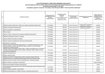PLAN POSTĘPOWAŃ O UDZIELENIE ZAMÓWIEŃ PUBLICZNYCH jakie Samodzielny Publiczny Zakład Opieki Zdrowotnej Wojewódzki Szpital Specjalistyczny Nr 3 w Rybniku przewiduje przeprowadzić w roku 2017, sporządzony zgodnie z treścią art. 13a ustawy z dnia 29 stycznia 2004 r. Prawo zamówień publicznych Lp. Przedmiot zamówienia Przewidywany okres obowiązywania umowy dla umów długoterminowych 1 2 3 Orientacyjna wartość zamówienia netto w zł (dla umów długoterminowych dotyczy całego okresu obowiązywania umowy) Przewidywany tryb lub inna procedura udzielenia zamówienia 4 5 Przewidywany termin wszczęcia postępowania Rodzaj zamówienia według podziału na zamówienia na roboty budowlane, dostawy lub usługi 6 7 wszczęte w 2016 r. otwarcie ofert planowane na 01.02.2017 r. wszczęte w 2016 r. otwarcie ofert planowane na 02.02.2017 r. 1 Dostawa wyrobów medycznych z włóknin oraz dostawy materiałów opatrunkowych 24 miesiące 600 000 przetarg nieograniczony 2 Dostawy produktów farmaceutycznych 12 miesięcy 1 800 000 przetarg nieograniczony 3 Środki antyseptyczne i dezynfekcyjne 24 miesiące 325 000 przetarg nieograniczony I dostawa 4 Płyny infuzyjne 19 miesięcy 1 300 000 przetarg nieograniczony I dostawa 5 Wyroby z włóknin medycznych oraz dostawa materiałów opatrunkowych 24 miesiące 1 200 000 przetarg nieograniczony I dostawa 6 Materiały zespalające stosowane w ortopedii 36 miesięcy 450 000 przetarg nieograniczony I dostawa 7 Wyroby medyczne stosowane w ortopedii 24 miesiące 450 000 przetarg nieograniczony I dostawa 8 Wyroby medyczne specjalistyczne dla pracowni hemodynamiki 12 miesięcy 1 900 000 przetarg nieograniczony I dostawa 9 Kardiowertery i stymulatory 12 miesięcy 1 557 000 przetarg nieograniczony I dostawa 24 miesiące 180 000 przetarg nieograniczony I dostawa 36 miesięcy 3 000 000 przetarg nieograniczony I dostawa 12 System do pobierania krwi 24 miesiące 300 000 przetarg nieograniczony I dostawa 13 Wyroby medyczne różne 24 miesiące 3 400 000 przetarg nieograniczony I dostawa 24 miesiące 180 000 przetarg nieograniczony I dostawa 48 miesięcy 320 000 przetarg nieograniczony I dostawa 16 Roboty budowlane, instalacyjne i towarzyszące - 580 000 przetarg nieograniczony I robota budowlana 17 Opracowanie projektów budowlano-wykonawczych - 154 000 przetarg nieograniczony I usługa 24 miesiące 1 100 000 przetarg nieograniczony I usługa 10 miesięcy 60 000 przetarg nieograniczony dostawa 10 miesięcy 50 000 przetarg nieograniczony I I Wyroby medyczne dla oddziału okulistycznego (m. in. materiały wiskoelastyczne, noże 10 mikrochirurgiczne, barwniki, olej silikonowy, gazy okulistyczne, itp.) oraz soczewki okulistyczne do fiksacji teczówki Wyroby medyczne dla oddziału okulistycznego - zestawy do zabiegów wraz z użyczeniem 11 urządzenia do fakoemulsyfikacji zaćmy, witrektomii przedniej i tylnej, witrektomy, sondy oraz soczewki okulistyczne 14 Dostawy znacznika do nieizotopowego systemu wykrywania węzłów chłonnych wartowniczych wraz z narzędziami jednorazowego użytku oraz dzierżawą sondy 15 Dostawa systemu do badań z zakresu hematologii wraz z dzierżawą urządzeń Usługi kompleksowego ubezpieczenia SP ZOZ Wojewódzkiego Szpitala Specjalistycznego nr 3 w Rybniku 19 Środki utrzymania czystości i wyroby foliowe 18 20 Materiały eksploatacyjne do urządzeń biurowych i pozostałe wyroby biurowe dostawa dostawa dostawa dostawa przetarg nieograniczony II II II 900 000 przetarg nieograniczony II dostawa 24 miesiące 480 000 przetarg nieograniczony II dostawa 24 miesiące 310 000 przetarg nieograniczony II usługa 21 Produkty lecznicze stosowane w programach lekowych i w chemioterapii 18 miesięcy 25 050 000 przetarg nieograniczony 22 Żywienie pozajelitowe i dojelitowe wraz z użyczeniem pomp 18 miesięcy 1 000 000 przetarg nieograniczony 23 Produkty lecznicze pozostałe, w tym koncentraty dla stacji dializ 16 miesięcy 4 800 000 24 miesiące 25 Odczynniki i wyroby medyczne na potrzeby ZDL 26 Usługi specjalistycznego transportu sanitarnego 24 Wyroby z włóknin medycznych, dostawa materiałów opatrunkowych, w tym opatrunki specjalistyczne dostawa dostawa 27 Modernizacja i rozbudowa Szpitalnego Oddziału Ratunkowego (dotacja ze środków UE) - 1 626 016 przetarg nieograniczony II robota budowlana Modernizacja i rozbudowa Szpitalnego Oddziału Ratunkowego - zakup z całym niezbędnym wyposażeniem: Tomograf komputerowy wraz z wyposażeniem (1 szt.), Aparat do znieczulania wraz monitorem anestezjologicznym i z wyposażeniem (1 szt.), Wózek reanimacyjny z defibrylatorem i wyposażeniem (1 szt.), Pompa infuzyjna z wyposażeniem (15 szt.), Zestaw do szybkiego przetaczania płynów (3 szt.), Ssak elektryczny (1 szt.), 28 Aparat do powierzchniowego ogrzewania pacjenta (3 szt.), Zestaw do trudnej intubacji (1 szt.), Respirator transportowy (1 szt.), Respirator stacjonarny (3 szt.), Monitor do intensywnej terapii (2 szt.), Aparat do ogrzewania płynów infuzyjnych (1 szt.), Stół zabiegowy z wyposażeniem (1 szt.), Łóżko do intensywnej terapii wraz z materacem przeciwodleżynowym i wyposażeniem (2 szt.), Zestaw do intubacji i wentylacji z workiem samorozprężalnym (3 szt.) (dotacja ze środków UE) - 1 909 496 przetarg nieograniczony II dostawa 12 miesięcy 500 000 przetarg nieograniczony II usługa 30 Części zamienne i ekploatacyjne do urządzeń medycznych 12 miesięcy 200 000 przetarg nieograniczony II dostawa Usługi odbioru i dalszego postępowania z odpadami medycznymi jak i z odpadami w 31 postaci opakowań zawierających pozostałości substancji niebezpiecznych lub nimi zanieczyszczonych, odpadów stałych ze wstępnej filtracji i skratki oraz zużytego węgla 24 miesiące 840 000 przetarg nieograniczony II usługa 36 miesięcy 8 100 000 tryb właściwy dla zamówienia na usługi społeczne i inne szczególne usługi określony w art. 138 g) i kolejne II usługa 33 Materiały techniczne 24 miesiące 280 000 przetarg nieograniczony II d