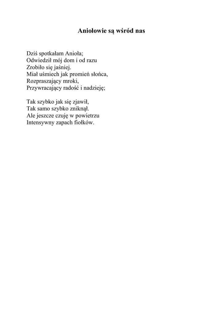 Aniołowie są wśród nas Dziś spotkałam Anioła; Odwiedził mój dom i od razu Zrobiło się jaśniej. Miał uśmiech jak promień słońca, Rozpraszający mroki, Przywracający radość i nadzieję; Tak szybko jak się zjawił, Tak samo szybko zniknął. Ale jeszcze czuję w powietrzu Intensywny zapach fiołków.