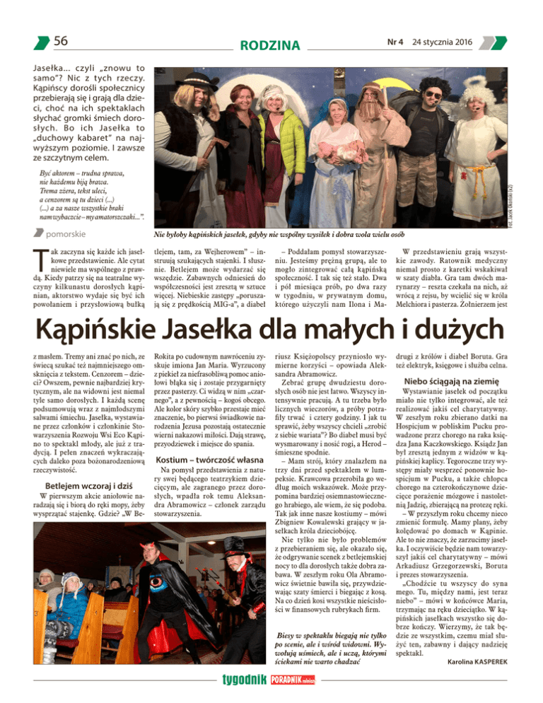 56 RODZINA Nr 4 24 stycznia 2016 Jasełka... czyli „znowu to samo”? Nic z tych rzeczy. Kąpińscy dorośli społecznicy przebierają się i grają dla dzieci, choć na ich spektaklach słychać gromki śmiech dorosł ych. Bo ich Jasełka to „duchowy kabaret” na najwyższym poziomie. I zawsze ze szczytnym celem. pomorskie T ak zaczyna się każde ich jasełkowe przedstawienie. Ale cytat niewiele ma wspólnego z prawdą. Kiedy patrzy się na teatralne wyczyny kilkunastu dorosłych kąpinian, aktorstwo wydaje się być ich powołaniem i przysłowiową bułką Fot. Jacek Okoński (x2) Być aktorem – trudna sprawa, nie każdemu biją brawa. Trema zżera, tekst uleci, a cenzorem są tu dzieci (...) (...) a za nasze wszystkie braki nam wybaczcie – my amatorszczaki...”. Nie byłoby kąpińskich jasełek, gdyby nie wspólny wysiłek i dobra wola wielu osób tlejem, tam, za Wejherowem” – instruują szukających stajenki. I słusznie. Betlejem może wydarzać się wszędzie. Zabawnych odniesień do współczesności jest zresztą w sztuce więcej. Niebieskie zastępy „poruszają się z prędkością MIG-a”, a diabeł – Poddałam pomysł stowarzyszeniu. Jesteśmy prężną grupą, ale to mogło zintegrować całą kąpińską społeczność. I tak się też stało. Dwa i pół miesiąca prób, po dwa razy w tygodniu, w prywatnym domu, którego użyczyli nam Ilona i Ma- W przedstawieniu grają wszystkie zawody. Ratownik medyczny niemal prosto z karetki wskakiwał w szaty diabła. Gra tam dwóch marynarzy – reszta czekała na nich, aż wrócą z rejsu, by wcielić się w króla Melchiora i pasterza. Żołnierzem jest Kąpińskie Jasełka dla małych i dużych z masłem. Tremy ani znać po nich, ze świecą szukać też najmniejszego omsknięcia z tekstem. Cenzorem – dzieci? Owszem, pewnie najbardziej krytycznym, ale na widowni jest niemal tyle samo dorosłych. I każdą scenę podsumowują wraz z najmłodszymi salwami śmiechu. Jasełka, wystawiane przez członków i członkinie Stowarzyszenia Rozwoju Wsi Eco Kąpino to spektakl młody, ale już z tradycją. I pełen znaczeń wykraczających daleko poza bożonarodzeniową rzeczywistość. Betlejem wczoraj i dziś W pierwszym akcie aniołowie naradzają się i biorą do ręki mopy, żeby wysprzątać stajenkę. Gdzie? „W Be- Rokita po cudownym nawróceniu zyskuje imiona Jan Maria. Wyrzucony z piekieł za niefrasobliwą pomoc aniołowi błąka się i zostaje przygarnięty przez pasterzy. Ci widzą w nim „czarnego”, a z pewnością – kogoś obcego. Ale kolor skóry szybko przestaje mieć znaczenie, bo pierwsi świadkowie narodzenia Jezusa pozostają ostatecznie wierni nakazowi miłości. Dają strawę, przyodziewek i miejsce do spania. Kostium – twórczość własna Na pomysł przedstawienia z natury swej będącego teatrzykiem dziecięcym, ale zagranego przez dorosłych, wpadła rok temu Aleksandra Abramowicz – członek zarządu stowarzyszenia. riusz Księżopolscy przyniosło wymierne korzyści – opowiada Aleksandra Abramowicz. Zebrać grupę dwudziestu dorosłych osób nie jest łatwo. Wszyscy intensywnie pracują. A tu trzeba było licznych wieczorów, a próby potrafiły trwać i cztery godziny. I jak tu sprawić, żeby wszyscy chcieli „zrobić z siebie wariata”? Bo diabeł musi być wysmarowany i nosić rogi, a Herod – śmieszne spodnie. – Mam strój, który znalazłem na trzy dni przed spektaklem w lumpeksie. Krawcowa przerobiła go według moich wskazówek. Może przypomina bardziej osiemnastowiecznego hrabiego, ale wiem, że się podoba. Tak jak inne nasze kostiumy – mówi Zbigniew Kowalewski grający w jasełkach króla dzieciobójcę. Nie tylko nie było problemów z przebieraniem się, ale okazało się, że odgrywanie scenek z betlejemskiej nocy to dla dorosłych także dobra zabawa. W zeszłym roku Ola Abramowicz świetnie bawiła się, przywdziewając szaty śmierci i biegając z kosą. Na co dzień kosi wszystkie nieścisłości w finansowych rubrykach firm. Biesy w spektaklu biegają nie tylko po scenie, ale i wśród widowni. Wywołują uśmiech, ale i uczą, którymi ściekami nie warto chadzać tygodnik PORADNIK rolniczy drugi z królów i diabeł Boruta. Gra też elektryk, księgowe i służba celna. Niebo ściągają na ziemię Wystawianie jasełek od początku miało nie tylko integrować, ale też realizować jakiś cel charytatywny. W zeszłym roku zbierano datki na Hospicjum w pobliskim Pucku prowadzone przrz chorego na raka księdza Jana Kaczkowskiego. Ksiądz Jan był zresztą jednym z widzów w kąpińskiej kaplicy. Tegoroczne trzy występy miały wesprzeć ponownie hospicjum w Pucku, a także chłopca chorego na czterokończynowe dziecięce porażenie mózgowe i nastoletnią Jadzię, zbierającą na protezę ręki. – W przyszłym roku chcemy nieco zmienić formułę. Mamy plany, żeby kolędować po domach w Kąpinie. Ale to nie znaczy, że zarzucimy jasełka. I oczywiście będzie nam towarzyszył jakiś cel charytatywny – mówi Arkadiusz Grzegorzewski, Boruta i prezes stowarzyszenia. „Chodźcie tu wszyscy do syna mego. Tu, między nami, jest teraz niebo” – mówi w końcówce Maria, trzymając na ręku dzieciątko. W kąpińskich jasełkach wszystko się dobrze kończy. Wierzymy, że tak będzie ze wszystkim, czemu miał służyć ten, zabawny i dający nadzieję spektakl. Karolina KASPEREK