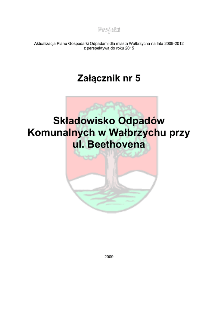 Aktualizacja Planu Gospodarki Odpadami dla miasta Wałbrzycha na lata 2009-2012 z perspektywą do roku 2015 Załącznik nr 5 Składowisko Odpadów Komunalnych w Wałbrzychu przy ul. Beethovena 2009 PLAN GOSPODARKI ODPADAMI DLA MIASTA WAŁBRZYCHA AKTUALIZACJA NA LATA 2009 – 2012 Z UWZGLĘDNIENIEM PERSPEKTYWY DO ROKU 2015 Spis treści 1 2 3 4 5 6 Lokalizacja ..................................................................................................................... 3 1.1 Budowa geologiczna .............................................................................................. 4 1.2 Charakter instalacji ................................................................................................ 5 Charakterystyka składowiska ......................................................................................... 5 2.1 Kwatera IA ............................................................................................................. 6 2.2 Kwatera IB ............................................................................................................. 7 2.3 Rów opaskowy ....................................................................................................... 7 2.4 Zbiornik wód deszczowych .................................................................................... 8 2.5 Zbiornik odcieków .................................................................................................. 8 2.6 Układ rozdeszczowienia odcieków ......................................................................... 9 2.7 Sieci drenarskie ..................................................................................................... 9 2.8 Sieci wodno -kanalizacyjne: ..................................................................................10 2.8.1 Odgazowanie złoża odpadów: ..........................................................................10 2.9 Pompownie ...........................................................................................................10 2.10 Obiekty i urządzenia infrastruktury ........................................................................11 2.10.1 Obiekty zaplecza ...........................................................................................11 2.10.2 Myjnia samochodowa ....................................................................................12 2.10.3 Studzienki technologiczne .............................................................................12 2.10.4 Stacja transformatorowa ...............................................................................12 2.10.5 Waga samochodowa .....................................................................................12 2.10.6 Brodzik dezynfekcyjny ...................................................................................12 2.10.7 Elementy „małej architektur” ..........................................................................13 2.11 Urządzenia monitoringu ........................................................................................13 2.12 Zaopatrzenie w wodę i energię .............................................................................13 Charakterystyka techniczna i stosowane technologie ....................................................14 3.1 Projektowana technologia rekultywacji ..................................................................14 3.2 Gospodarka odciekami .........................................................................................15 3.3 Monitoring wód gruntowych ..................................................................................15 Ocena stanu technicznego instalacji .............................................................................15 4.1 Instalacja wodno-kanalizacyjna .............................................................................15 4.2 Sieci kanalizacyjne ................................................................................................16 4.2.1 Kanalizacja pozakwaterowa ..............................................................................16 4.2.2 Kanalizacja kwaterowa ......................................................................................16 4.3 Układ rozdeszczowania odcieków .........................................................................17 4.4 Odwodnienie terenu ..............................................................................................17 4.5 Zbiorniki technologiczne........................................................................................17 Wnioski .........................................................................................................................18 Ocena funkcjonowania składowiska ..............................................................................19 BBF Załącznik nr 5 Sp. z o.o. 2 PLAN GOSPODARKI ODPADAMI DLA MIASTA WAŁBRZYCHA AKTUALIZACJA NA LATA 2009 – 2012 Z UWZGLĘDNIENIEM PERSPEKTYWY DO ROKU 2015 1 Lokalizacja Składowisko zlokalizowane jest w dzielnicy Sobięcin, na terenie działek oznaczonych numerami geodezyjnymi: 10/56 - obręb nr 31 Sobięcin, 10/57- obręb nr 31 Sobięcin, będących własnością Urzędu Miejskiego w Wałbrzychu oraz 7/16 - obręb nr 32 Gaj, I 7/17 — obręb nr 32 Gaj będących w formie wieczystego użytkowania przez Urząd Miejski w Wałbrzychu. Zgodnie ze studium uwarunkowań i kierunków zagospodarowania przestrzennego miasta Wałbrzycha, przyjętym Uchwałą nr Xi/154/99 Rady Miejskiej Wałbrzycha- z dnia 30 czerwca 1999 roku i zmienionym Uchwałą XII/142/03 Rady Miejskiej Wałbrzycha z dnia 10 lipca 2003 roku. Przedmiotowe działki wraz terenami przyległymi położone są w jednostce urbanistycznej J - Sobięcin przy czym: — Dz. nr 23/1 I 10/54 leżą na obszarze oznaczonym symbolem J 3.8.dla którego uwarunkowania rozwoju stanowi teren zdegradowany (hałdy). Kierunki zagospodarowania przestrzennego dla tego obszaru : wymagana rekultyw